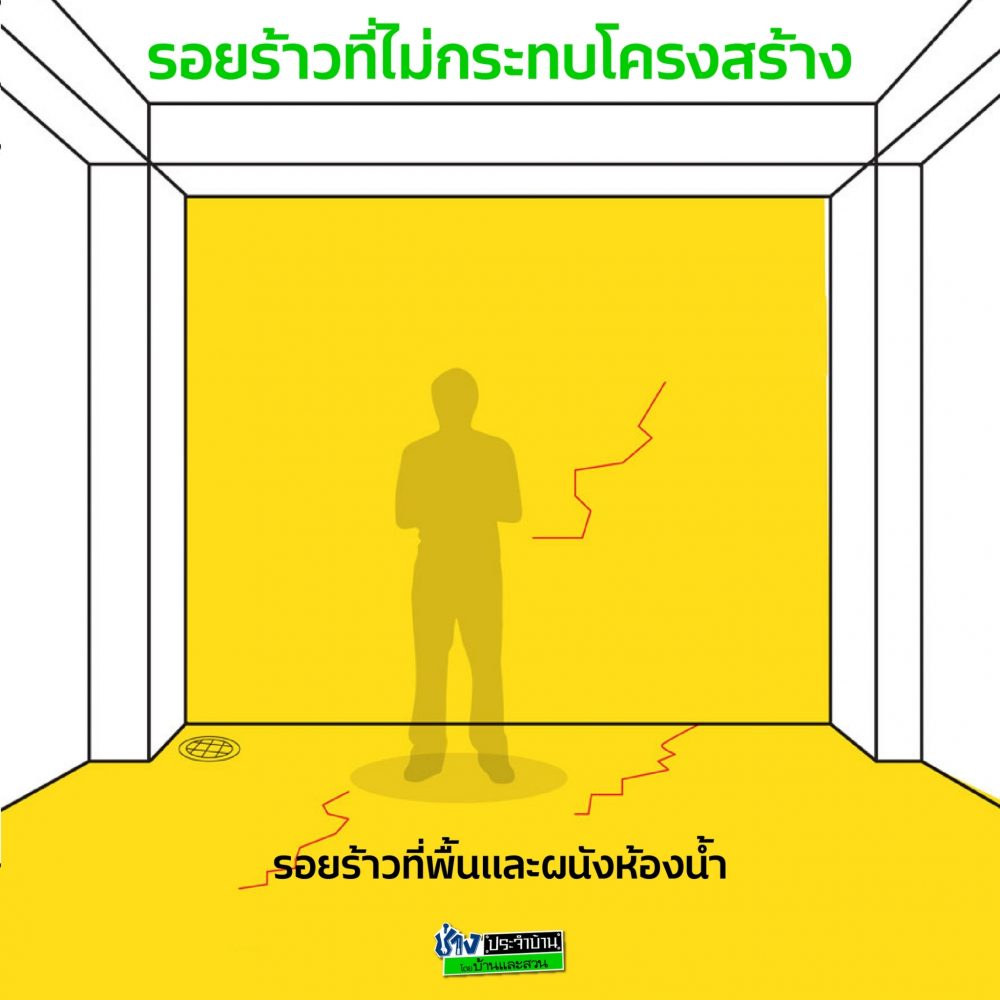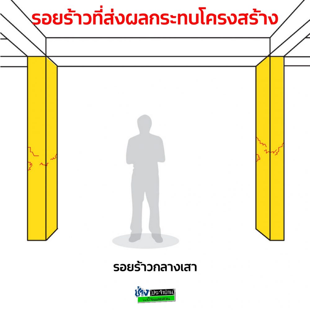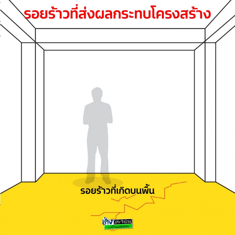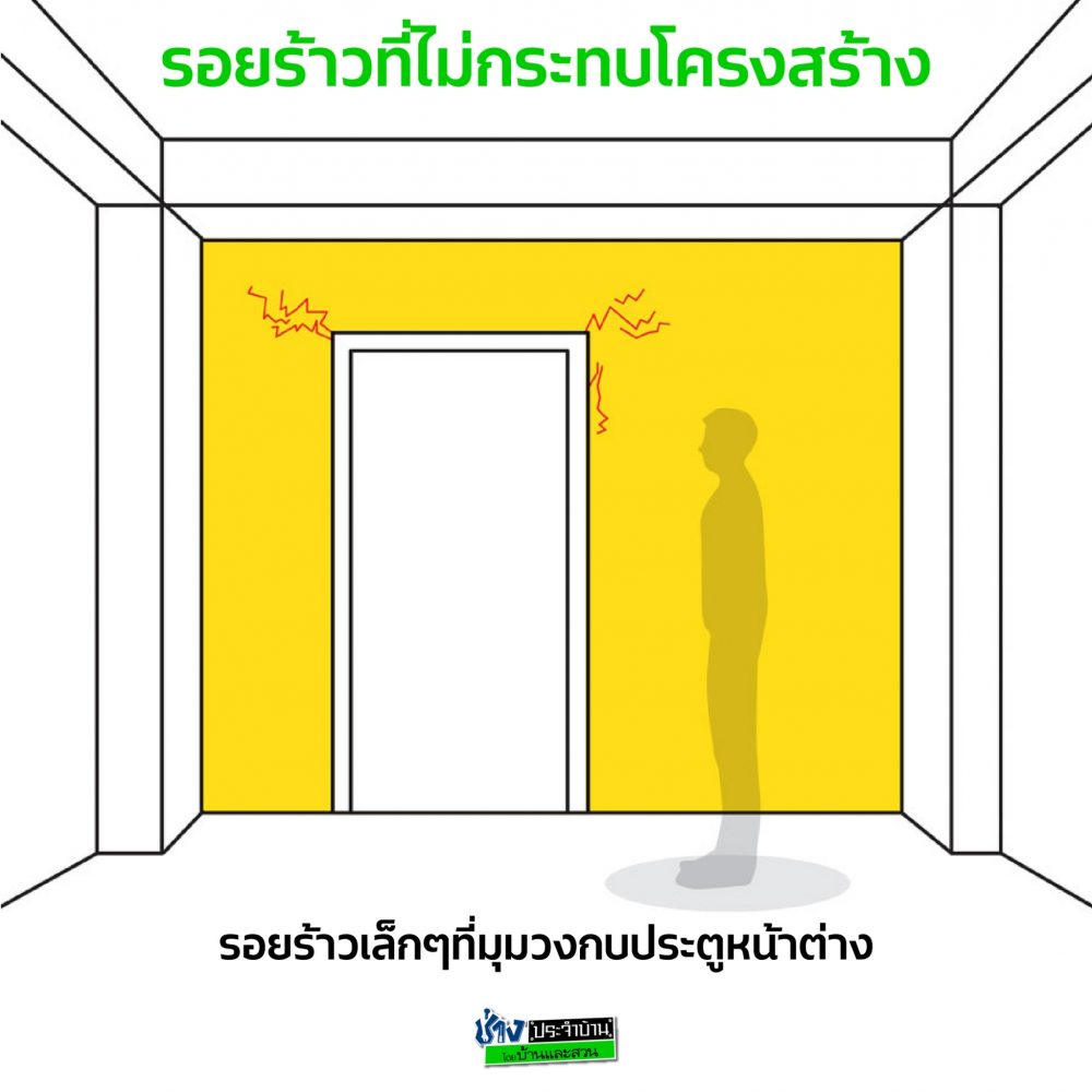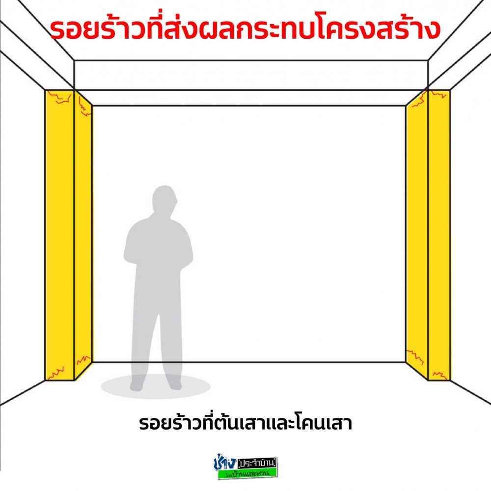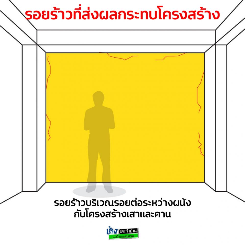 ข้อควรระวัง – หากรอยแตกลามยาวไปถึงขอบผนัง อาจต้องพิจารณาการล้มออกจากแนวดิ่งของโครงสร้าง ทำให้การรับน้ำหนักเยื้องออกจากแนวเสาและอาจทำให้บ้านล้มได้ในที่สุด![]()