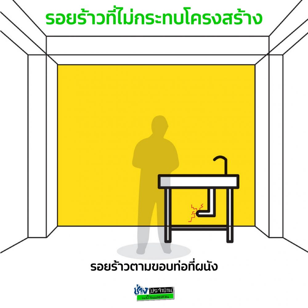สาเหตุ – เกิดจากการเดินท่อลอยโดยไม่ได้ยึดติดให้แน่นหนา ทำให้เกิดการโยกคลอนบริเวณปูนที่อัดไว้ในแนวช่องของท่อ เป็นผลให้ปูนแตกร้าวในที่สุด