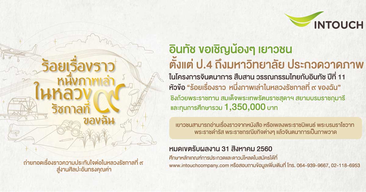 “อินทัช” เชิญชวนน้องๆ ป.4 ถึงอุดมศึกษา ส่งภาพวาดเข้าประกวด ในหัวข้อ “ร้อยเรื่องราว หนึ่งภาพเล่าในหลวงรัชกาลที่ ๙ ของฉัน” ชิงถ้วยพระราชทาน สมเด็จพระเทพรัตนราชสุดาฯ สยามบรมราชกุมารี ทุนการศึกษารวมกว่า 1.3 ล้านบาท โดยได้รับเกียรติจากผู้ทรงคุณวุฒิทั้ง 7 ท่าน มาเป็นกรรมการตัดสิน ได้แก่