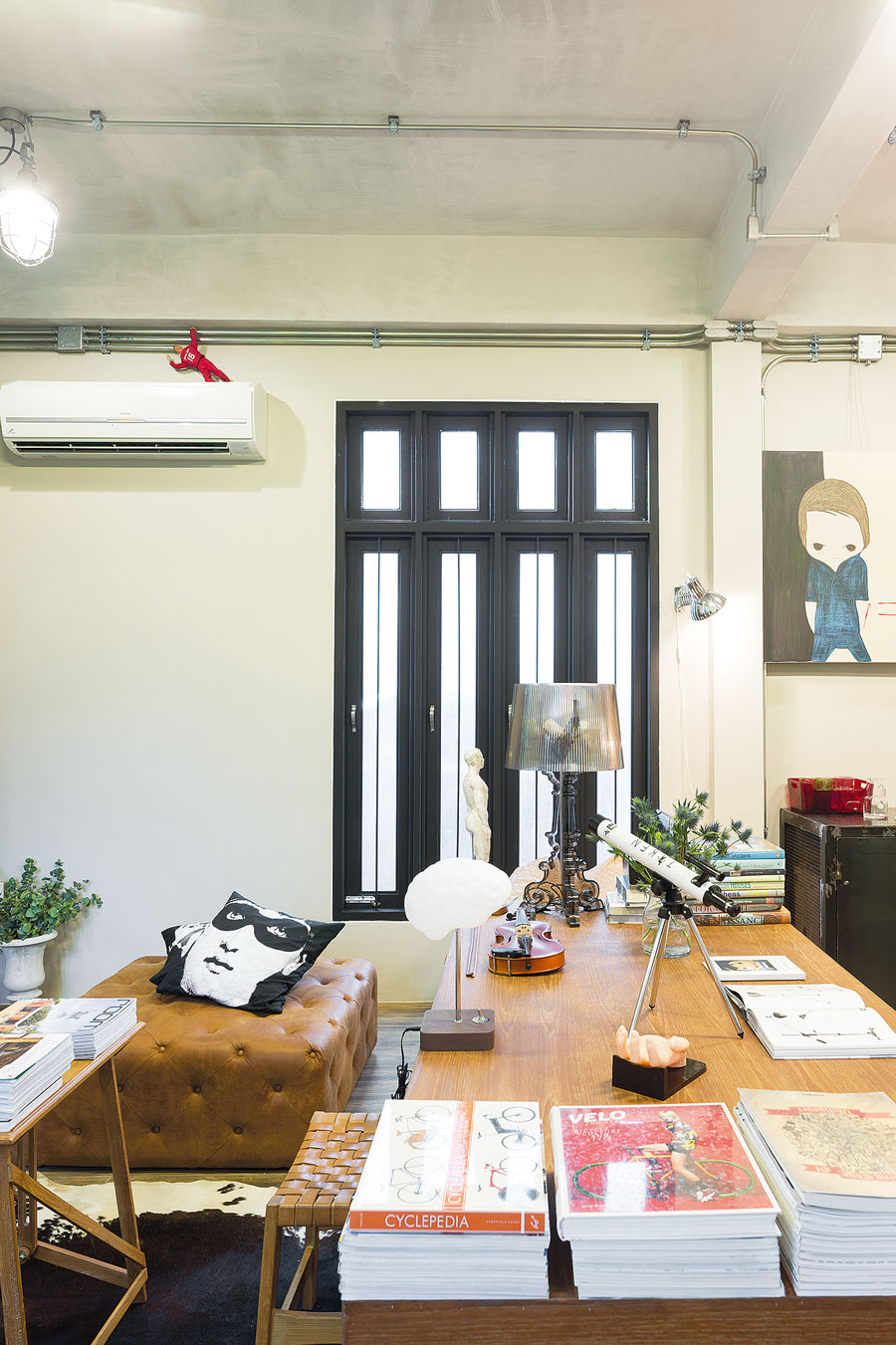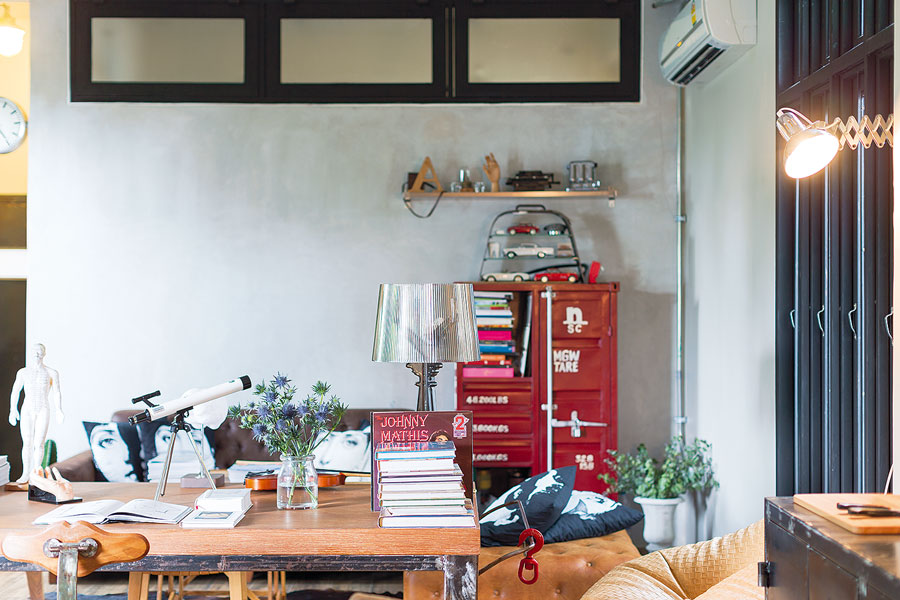 “เพราะพื้นที่มันเล็กก็เลยต้องดันเพดานให้สูงโปร่ง แล้ววางแผนก่อนเลยว่าจะมีพื้นที่อะไรในบ้านบ้าง อุ้มแต่งคล้ายๆ ห้องชุดในคอนโด คือใช้เฟอร์นิเจอร์ลอยตัวกำหนดฟังก์ชันของแต่ละมุม และไม่ทำบิลท์อินเลย เพื่อให้ง่ายต่อการเคลื่อนย้ายเปลี่ยนมุม หลายๆ ชิ้นออกแบบสั่งทำขึ้นมาใหม่ บางชิ้นก็เอาของเก่าที่มีมาปรับโฉม ผสมกับของใหม่ที่ดูเก่าหน่อยเพื่อให้กลมกลืนกันไป”