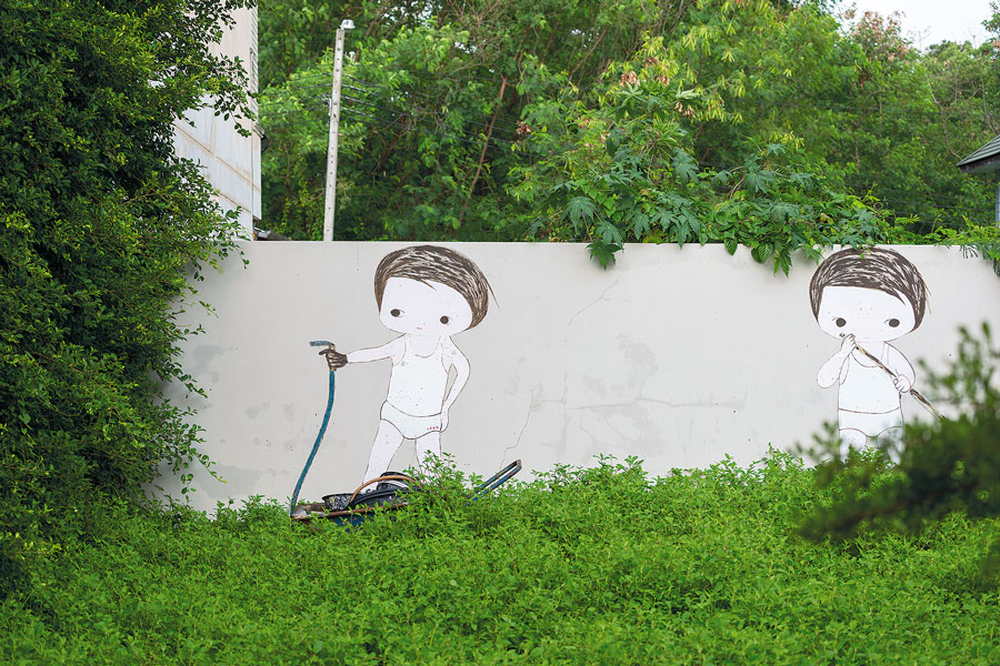 นอกเหนือจากของสะสมแล้ว สิ่งที่รายล้อมอยู่ในทุกมุมของบ้านก็คงจะเป็นใบหน้าสดใสของเด็กน้อยในอิริยาบถต่างๆ ที่คุณอุ้มวาดขึ้นโดยอาศัยบุคลิกของน้องเนยหลานชายที่รัก ไม่ว่าจะเป็นภาพเด็กน้อยกำลังรดน้ำอยู่ในสวนริมรั้วของบ้าน เด็กชายในชุดเสื้อกล้ามสีขาวที่ผนังห้องกิจกรรม หรือเด็กชายในชุดเท่ที่ผนังห้องนอน ซึ่งคุณอุ้มบอกว่าการวาดภาพบนผนังทำให้บรรยากาศของห้องสดชื่นขึ้น คล้ายกับการประดับภาพศิลปะ และถ้าเบื่อก็สามารถลบออกแล้ววาดใหม่ได้อีกตามต้องการ