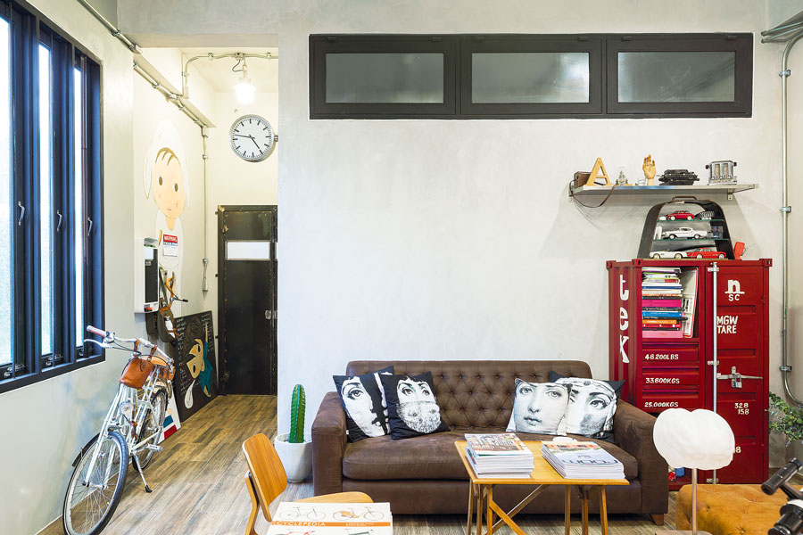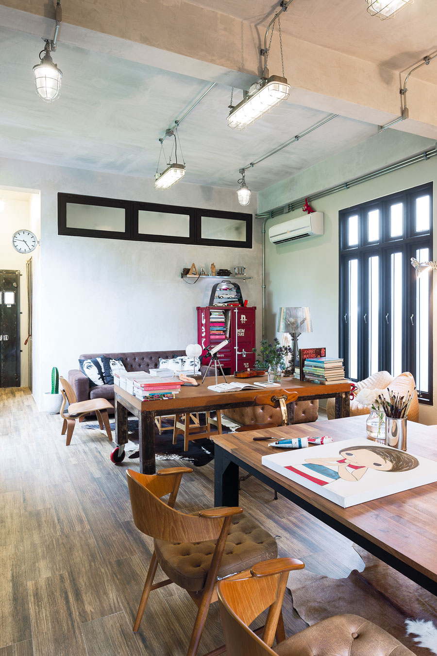 พื้นที่รูปทรงสี่เหลี่ยมผืนผ้าภายในบ้านเน้นการเปิดโล่งแบบสตูดิโอ โดดเด่นด้วยงานตกแต่งสไตล์อินดัสเทรียลลอฟต์ตั้งแต่ผนังปูนขัดมัน (บางส่วน) ฝ้าเพดานที่ยกสูงถึง 3.60 เมตร การโชว์แนวเดินท่อสายไฟ โคมไฟเพดานแบบอินดัสเทรียล และการเลือกใช้เหล็กมาเป็นวัสดุตกแต่งรวมถึงเฟอร์นิเจอร์บางส่วน โดยผสมผสานไปกับงานไม้ เพื่อเติมสัมผัสที่อบอุ่นของความเป็นบ้านให้มากขึ้น