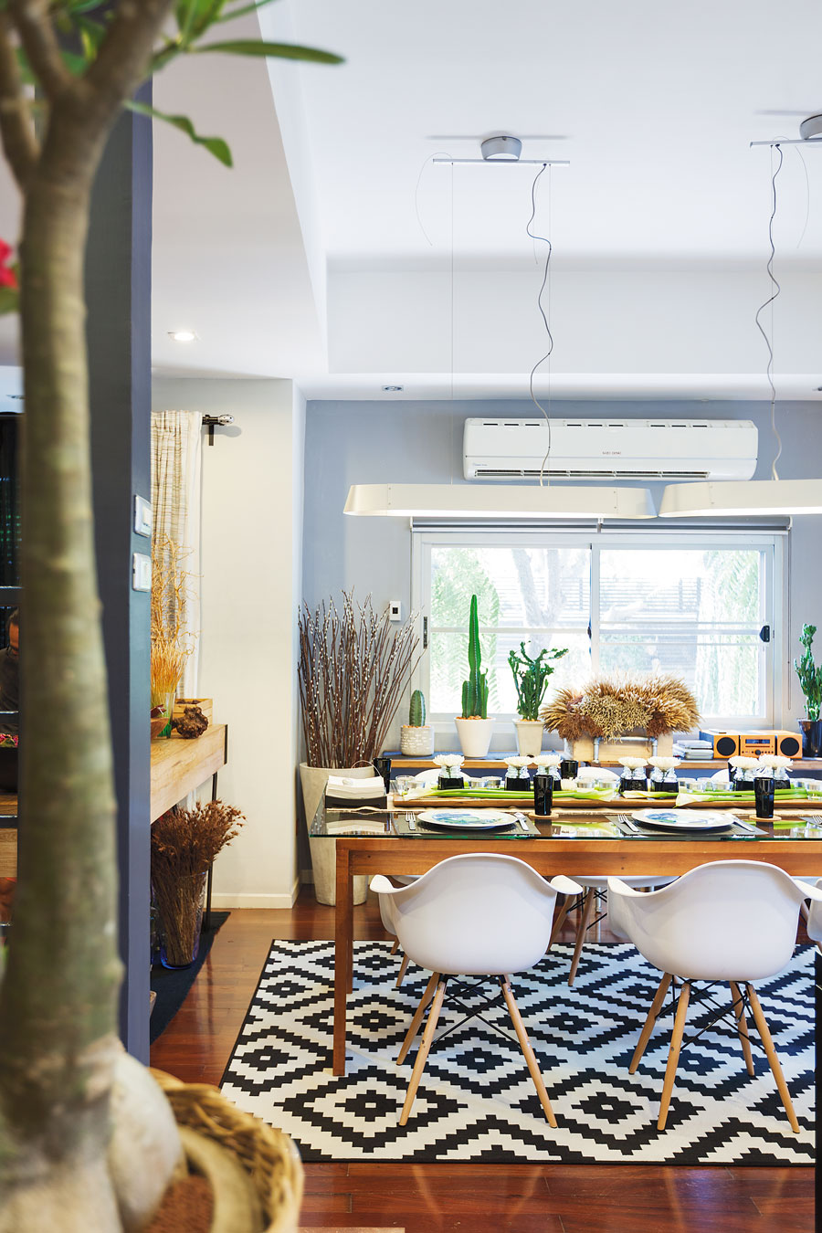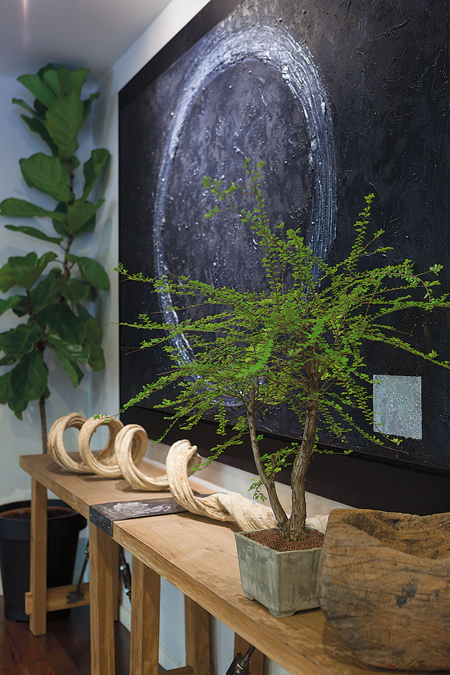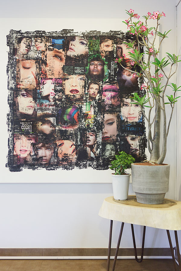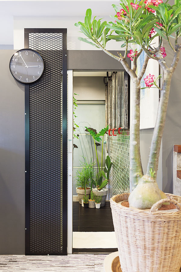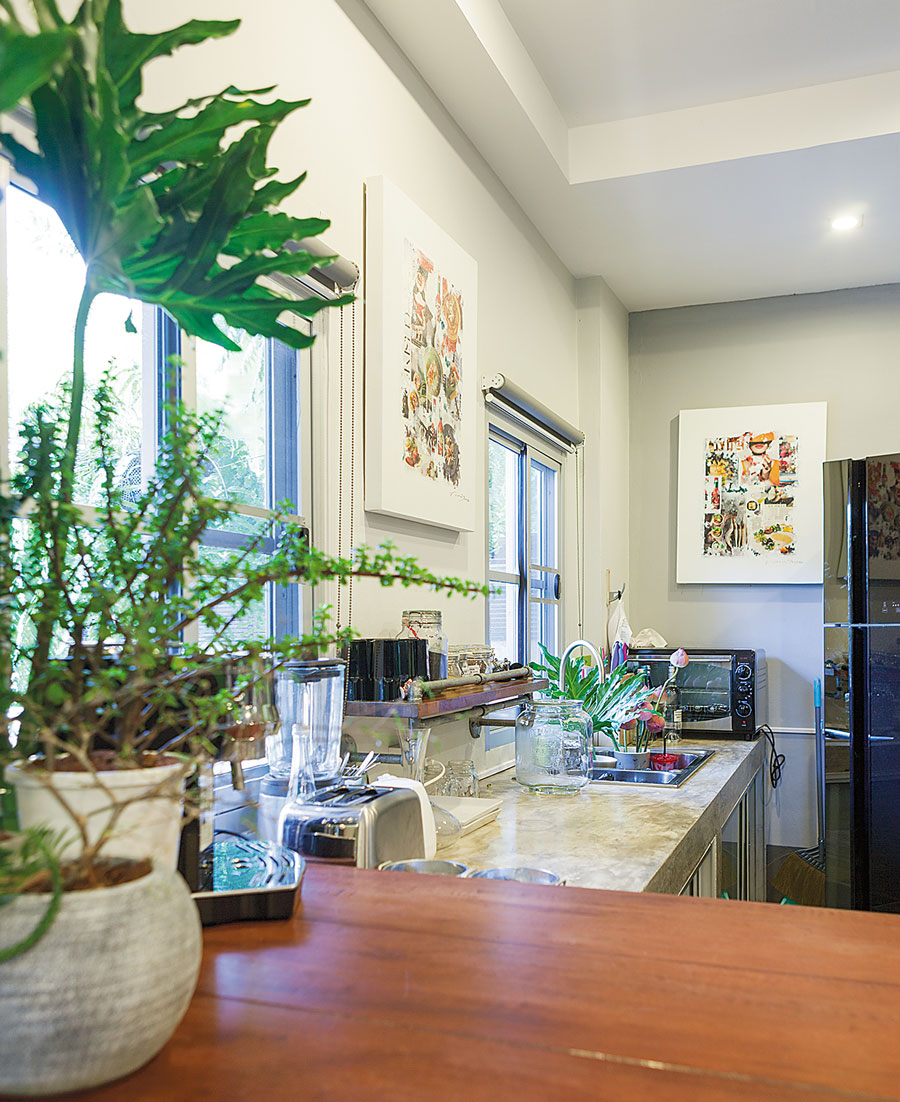 “ผมชอบงานศิลปะมานานแล้ว แต่บ้านเดิมของเราใช้สีเยอะ เป็นแบบแคริบเบียนเลย พอปรับใหม่ก็อยากเปลี่ยนอารมณ์ ในเมื่อเราไม่มีกฎตายตัว ก็สนุกดี อย่างพื้นกระเบื้อง ผมซื้อที่ศิลาตาก เป็นรุ่นใหม่แล้วนำมาปูทับของเดิมไปเลย ม่านในบ้านผมก็เป็นสีดำ ให้น้องคนที่วาดภาพนำสีเมทัลลิกสีเทาเทลงไปบนผ้า เหมือนสร้างงานศิลปะ ได้อารมณ์ที่แปลกออกไป เชื่อว่ามีแค่บ้านเราบ้านเดียวแน่ๆ”