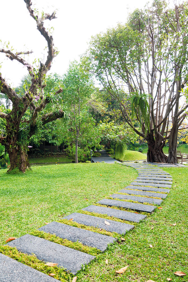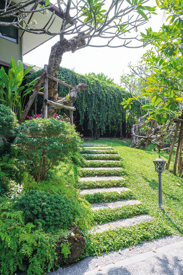 “ในส่วนของ ต้นไม้ใหญ่ เดิมยังคงเก็บรักษาเอาไว้ มีตัดแต่งกิ่งออกบ้างเพื่อให้มีช่องแสงและช่องลมผ่านไปได้ ถ้าหากพุ่มแน่นไปก็จะต้านลม เป็นอันตรายกับตัวบ้านด้วย เพราะเราปลูกต้นไม้ค่อนข้างชิดกับบ้านมาก (หัวเราะ) อันไหนเอียงก็ใช้ค้ำยันช่วยพยุงไว้ แล้วก็ลงไม้ใหญ่ที่มีดอกสวยช่วยเพิ่มสีสัน โดยเฉพาะไม้ดอกที่มีกลิ่นหอม อันนี้ชอบมากเป็นพิเศษ นอกจากดอกจะสวยแล้วกลิ่นของดอกแต่ละชนิดยังให้ความรู้สึกแตกต่างกันด้วย และมีช่วงเวลาของกลิ่นหอมที่ไม่เหมือนกัน เช่น พะยอมจะหอมมากในช่วงเช้าและเย็น พิกุลส่งกลิ่นหอมตอนเย็นและโชยไปไกล หรือแก้วที่ส่งกลิ่นหอมช่วงพลบค่ำถึงเช้ามืด วิธีการดูแลต้องรู้และทำความเข้าใจสภาพพื้นที่ที่เหมาะสมกับการปลูกอยู่พอสมควร ต้องระวังเรื่องน้ำขัง คอยใส่ปุ๋ยบำรุง และตัดแต่งหลังดอกโรย เพื่อให้ทรงพุ่มโปร่ง ป้องกันการเกิดโรคและแมลงซึ่งเป็นสาเหตุทำให้ต้นตายได้ สำหรับไม้ที่ปลูกใหม่ในช่วงฤดูร้อนควรใช้ซาแลนบังแดด ช่วยลดการสูญเสียน้ำซึ่งอาจทำให้ต้นไม้เหี่ยวและตายในที่สุด