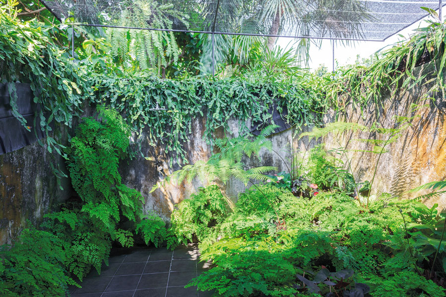 “อีกหนึ่งมุมโปรดที่ชอบไม่แพ้กันคือสวนในห้องน้ำกึ่งเอ๊าต์ดอร์ของบ้านหลังเล็ก ซึ่งแบ่งการใช้งานเป็นสัดส่วน โดยแยกห้องอาบน้ำให้อยู่ด้านนอก เพื่อให้ได้ใกล้ชิดกับธรรมชาติ ส่วนที่เป็นพื้นที่แห้งจะอยู่ด้านในติดกับตัวบ้าน เมื่อก่อนด้านนอกเป็นพื้นหินแกรนิตเรียบๆโล่งๆ เพื่อนเสนอไอเดียให้ทำเป็นสวนทรอปิคัล จำลองบรรยากาศของธรรมชาติที่ขึ้นตามซอกหิน ซึ่งมีทั้งมอสส์ กลุ่มเฟิน และกล้วยไม้ จัดวางเป็นกลุ่มผสมกัน จนตอนนี้เจริญเติบโตกันแน่นเต็มผนัง เวลาใช้ห้องน้ำมองออกไปแล้วรู้สึกสดชื่นสบายตา พอได้อยู่กับต้นไม้ก็ทำให้เรามีความสุขมากขึ้น”