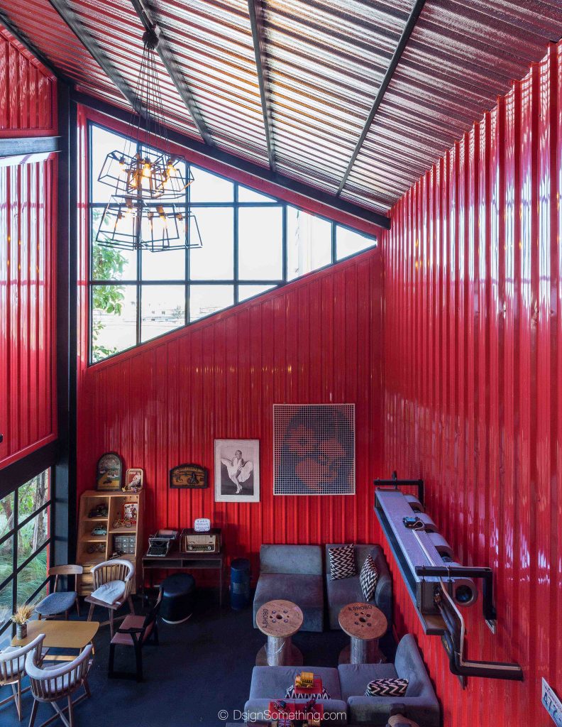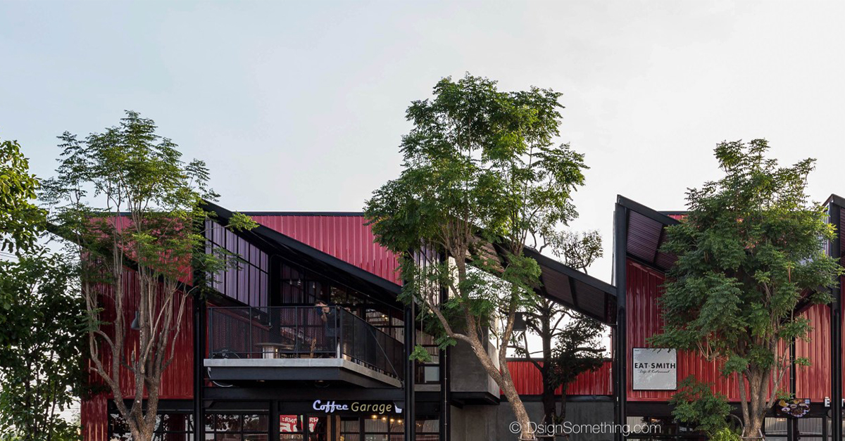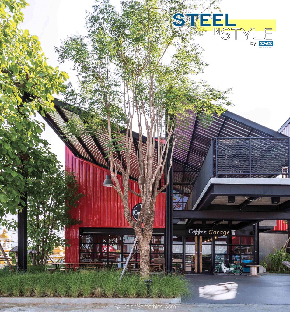 เมื่อขับไปบนทางหลวงหมายเลข 346 ไม่ใกล้ไม่ไกลจากวิทยาเขตกำแพงแสนของมหาวิทยาลัยเกษตรศาสตร์นัก จะเห็นอาคารโครงสร้างเหล็กที่โดดเด่นด้วยหลังคาทรงเฉียงแบบฟันปลาและผนัง Metal Sheet สีแดงสด ที่นี่คือ TMK Food Park จุดแวะพักที่ครบครันที่สุดในย่านกำแพงแสนแห่งนี้เลยทีเดียว “สีแดงที่เลือกมาใช้รวมทั้งเส้นตั้งเส้นเฉียงของอาคารนั้นก็เพื่อความโดดเด่นเห็นได้ง่าย รวมทั้งการทำให้อาคารมีความสูงในแต่ละชั้นมากเป็นพิเศษก็เพื่อให้สามารถสังเกตเห็นได้ง่ายสมกับเป็นจุดพักรถนั่นเอง” ARX ทีมสถาปนิกผู้ออกแบบได้บอกกับเราถึงเบื้องหลังของแนวคิดในการออกแบบ “และแน่นอนที่สุดที่เราเลือกใช้โครงสร้างเหล็กรูปพรรณรีดร้อนก็เพื่อความสะดวกรวดเร็วในการก่อสร้างแถมยังได้บุคลิกเรียบเท่ที่เป็นเอกลักษณ์จากโครงสร้างเหล็กเหล่านี้อีกด้วย ซึ่งตอบโจทย์ในด้านสไตล์ที่เราต้องการไปพร้อมๆกัน” คุณโน้ตเจ้าของ TMK Food Park แห่งนี้เล่าให้เราฟังเมื่อเราสังเกตเห็นว่าทั้งโครงการซึ่งเป็นโครงสร้างอาคารสลับกับสวนย่อยๆนั้น ล้วนแล้วแต่เป็นโครงสร้างเหล็กทั้งสิ้น แต่แม้จะเป็นโครงสร้างเหล็กก็ไม่ได้ดูแข็งกร้าวดุดันข่มความร่มรื่นของสวนแต่อย่างใด ในทางตรงกันข้ามเส้นสายของเสาคานที่ดูบางเบากลับเข้ากันได้ดีไม่รบกวนความสวยงามของสวนโดยรอบ