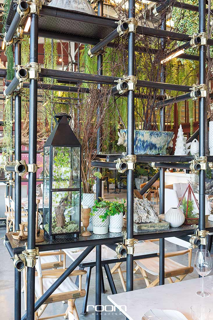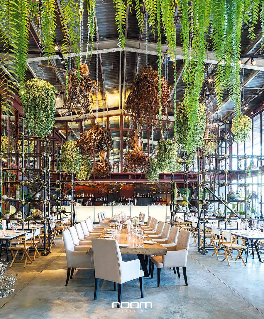 จากโกดังโครงสร้างเหล็กขนาดใหญ่ริมถนนพระรามที่ 4 ตอนนี้ได้เปลี่ยนโฉมครั้งใหญ่กลายเป็นร้านอาหารสุดคูลที่มีแนวคิดการออกแบบไม่ธรรมดา ภาพโกดังเหล็กธรรมดาที่เราเห็นนั้น ภายในกลับเต็มไปด้วยต้นไม้น้อยใหญ่ห้อยแขวนลอยตัวด้วยโซ่ และระบบรอก บรรยากาศเสมือนเทอร์ราเรียม แทบทุกจุดในร้านประดับด้วยของตกแต่งเก๋ๆ ที่น่าสนใจอีกอย่างคือไอเดียการนำนั่งร้านเหล็กแบบท่อกลมที่ยึดด้วยข้อยึดโลหะสีทองมาตกแต่ง ให้อารมณ์ที่ดูดิบเท่แต่หรูหราไปพร้อมกัน
