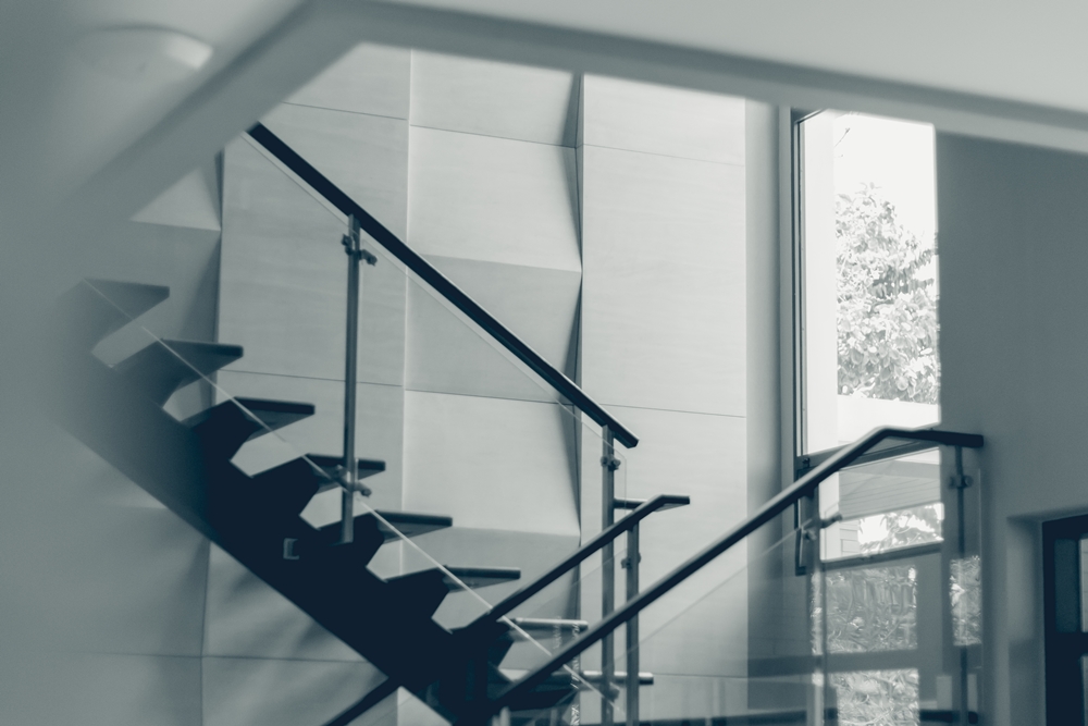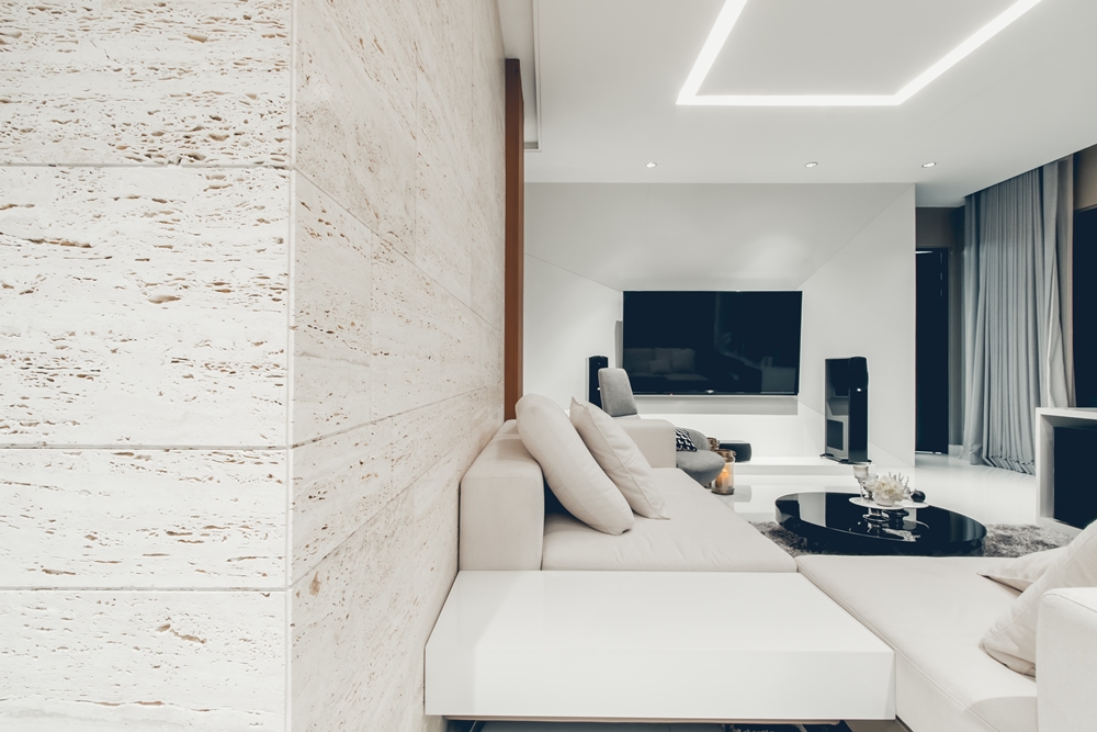 ระหว่างทางเข้าสู่ห้องนั่งเล่น เป็นเสมือนแกลเลอรี่จัดแสดงผลงานศิลปะเพื่อสร้างสุนทรีย์ให้ชีวิตในทุกวัน พื้นที่ที่เคยไร้ค่าอย่างบันได กลายเป็นพื้นที่มูลค่าสูงด้านความรู้สึก ด้วยการผนังหินไลม์สโตนที่เป็นเสมือนน้ำตกไหลลงมาสู่พื้นน้ำ ร่วมกับประติมากรรมปลาที่ล้อคลื่นอยู่กับผืนน้ำราวกับเคลื่อนไหวได้ ตลอดทางที่คั่นระหว่างทางเดินสู่ห้องนั่งเล่นกรุด้วยผนังหินธรรมชาติที่ยิ่งใหญ่และผ่อนคลาย ลูกเล่นยังไม่จบเพียงเท่านั้น ผนังถูกจัดวางให้เป็นสโลปลาดลงเชื่อมด้วยฝ้านำสายตาต่อไปยังโทรทัศน์ เกิดเป็นมิติของแสงและเงาอย่างมีศิลปะ