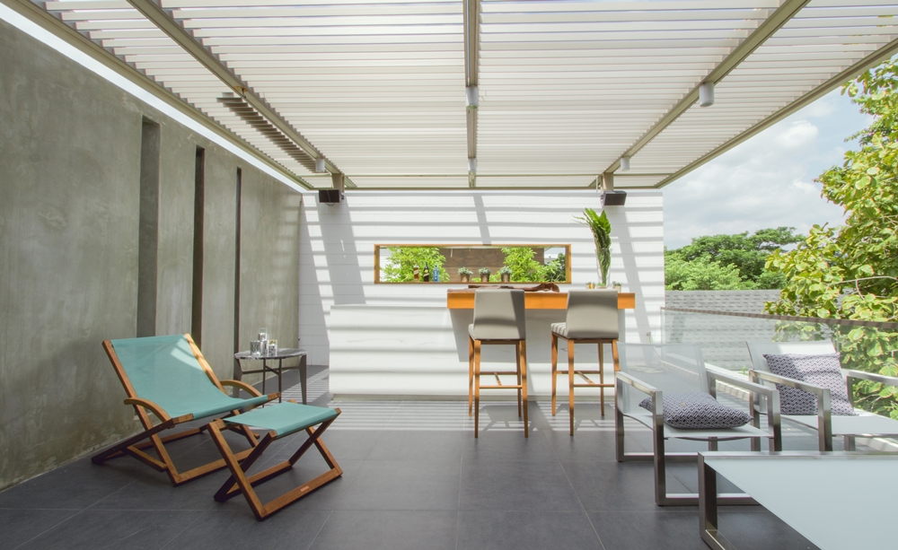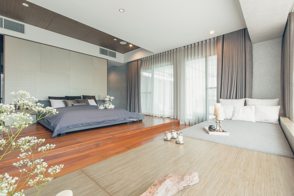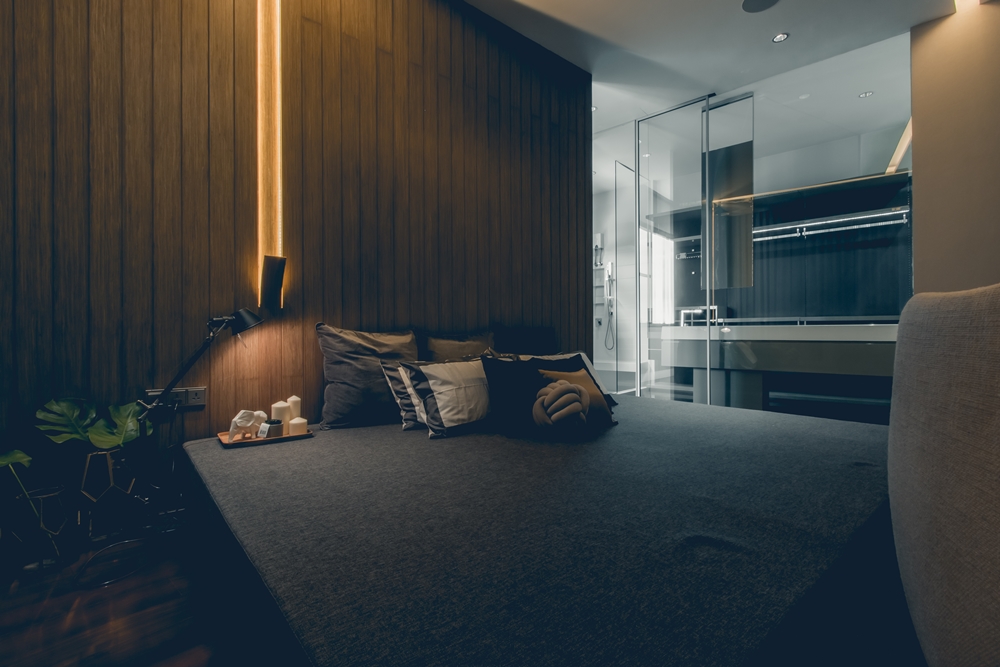 พื้นที่สำคัญที่สุดของบ้านอีกแห่งคือห้องนอน หัวใจอยู่ที่ห้องนอนหลักที่กว้างขวาง มีห้องนั่งเล่นส่วนตัวสำหรับสังสรรค์ในกลุ่มเพื่อนฝูง จึงเชื่อมสเปซนี้ออกสู่ระเบียงไซส์ยักษ์ที่ใช้เป็นบาร์กึ่งกลางแจ้ง เช่นเดียวกับห้องน้ำชาวเวอร์ที่เป็นแบบเอ๊าต์ดอร์ ที่เรียกกันเล่นๆ ว่า sexy bathroom จากเทคนิคการทำผนังปูนแบบบิด เหมือนจะมิดชิด แต่แอบซ่อนช่องว่างให้มองเห็นสักเล็กน้อย แต่นั่นก็ยังไม่เท่ากับจุดประสงค์หลักคือความต้องการเชื่อมต่อธรรมชาติให้เข้ากับการดำเนินชีวิต และเชื่อมต่อทั้งห้องให้เป็นเรื่องราวเดียวกัน