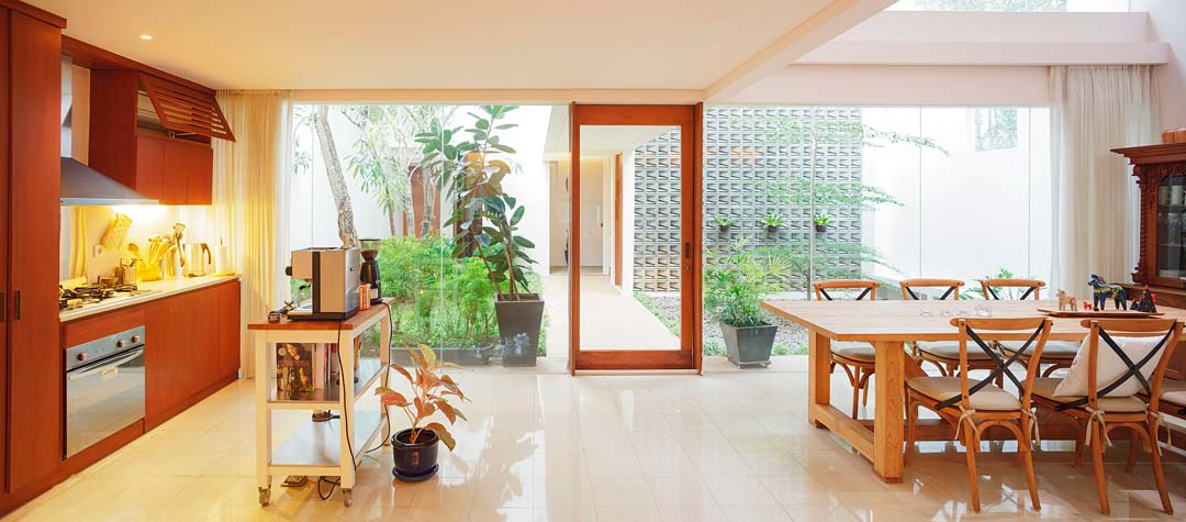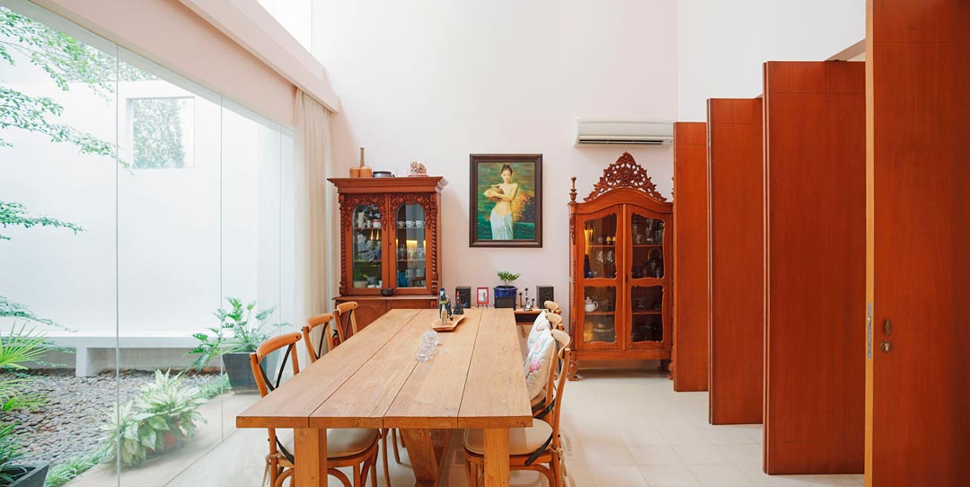 เราได้พบ คุณจุ๋งจิ๋ง – อรณัฐ เพอร์นควิสท์ เจ้าของบ้านสาวสวยที่ใช้ชีวิตอยู่ในจาการ์ตามานานกว่า 3 ปีแล้ว เธอเปิดบ้านเชื้อเชิญให้เราเข้าไปชมด้วยรอยยิ้ม แล้วเสียงว้าวก็เอ่ยออกจากปากเรานับครั้งไม่ถ้วน เพราะนอกจากเป็นบ้านที่น่าอยู่แล้ว การออกแบบตกแต่งพื้นที่ใช้สอยต่างๆ ก็สวยงาม คุณอันดราเป็นผู้ออกแบบบ้านทรงกล่องขนาดสามชั้นหลังนี้เช่นกัน โดยกำหนดให้มีคอร์ตเล็กๆ กลางบ้าน เพื่อให้แสงธรรมชาติส่องเข้ามาได้เต็มที่ มีสวนและมุมอเนกประสงค์บนอาคาร เพื่อให้ทุกห้องในบ้านมองเห็นและได้บรรยากาศเชื่อมโยงกับธรรมชาติ เรียกว่ามีกลิ่นอายของสไตล์โมเดิร์นที่เป็นเอกลักษณ์ของสถาปนิกชื่อก้องอย่าง เลอกอร์บูซีเย (Le Corbusier) แต่อยู่ในบริบทแบบเอเชีย