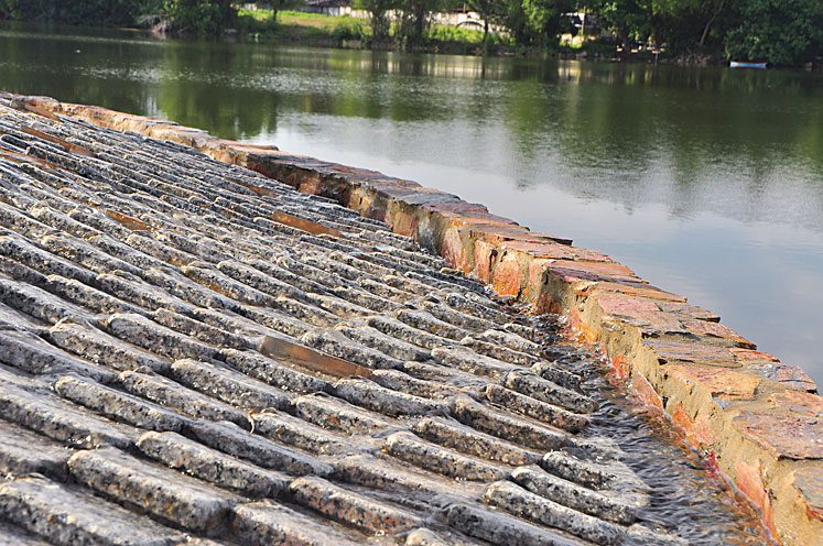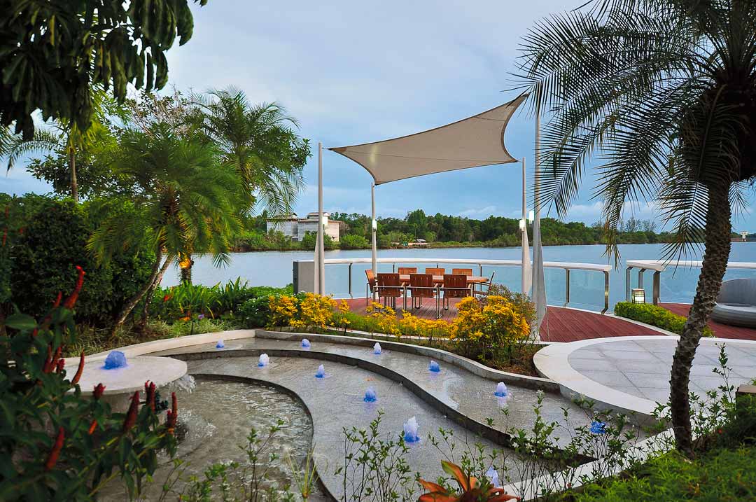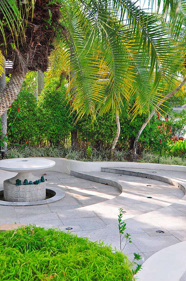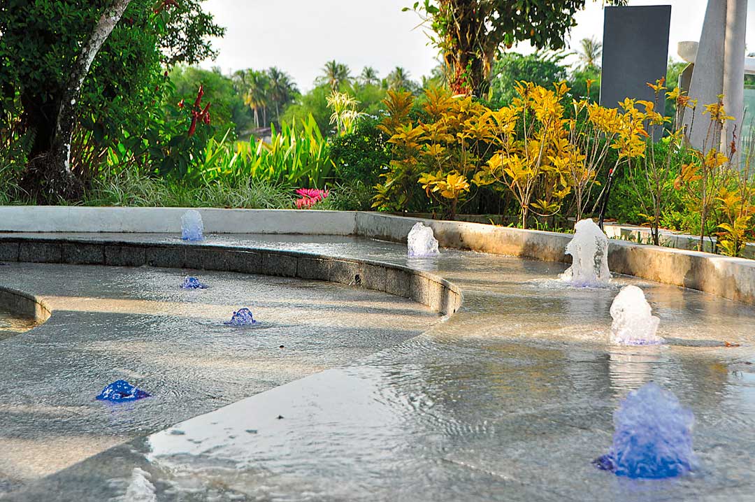 “ส่วนลำธารที่มักมีปัญหาตะไคร่น้ำมีการปรับเปลี่ยนรูปแบบบ่อให้กลายเป็นบ่อน้ำผุดที่ดูแลรักษาน้อยลง ไม่ต้องล้างบ่อบ่อย โดยออกแบบบ่อให้เป็นลานเล่นระดับ ค่อยๆ ลึกลงเป็นสเต็ป บ่อน้ำจะซ่อนอยู่ด้านล่างกลีบดอก ยามที่เราไม่เปิดน้ำจะเห็นเป็นพื้นแกรนิตเล่นระดับสวยงาม แต่เมื่อเปิดน้ำจะกลายเป็นชั้นน้ำผุดที่มีลูกเล่นแปลกตา”