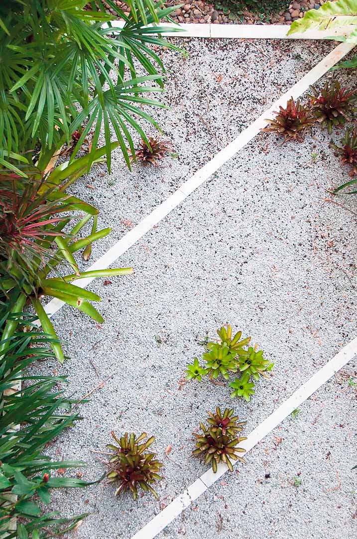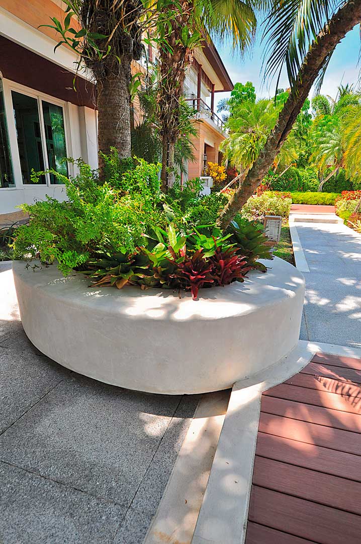 “เริ่มจากการคิดว่าจะทำอย่างไรให้สวนสวยทุกฤดูได้ อันดับแรกผมมองที่วัสดุ ผมเลือกใช้วัสดุที่ไม่ต้องทาสีบ่อยและสวยงามข้ามกาลเวลา เช่น แกรนิตพ่นไฟที่สวยโดยเนื้อสีของหิน ตัวลานรูปกลีบดอกไม้สีขาวทำจากเทอร์ราซโซ เป็นงานปูนสีขาวผสมแคลไซต์ เมื่อมองจะเหมือนหินธรรมชาติ นานวันยิ่งสวย ใช้อิฐโบราณผิวแกร่งทำทางเดิน ส่วนระเบียงใช้พื้นไม้สังเคราะห์ จึงสามารถใช้งานได้ยาวนานอีกนับสิบปี”