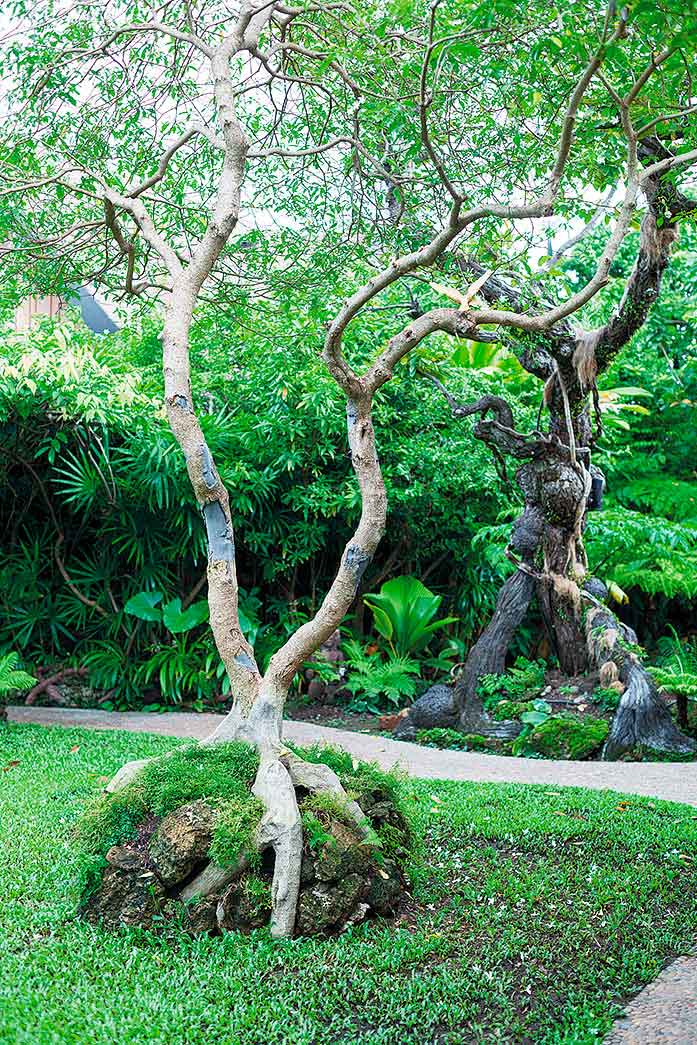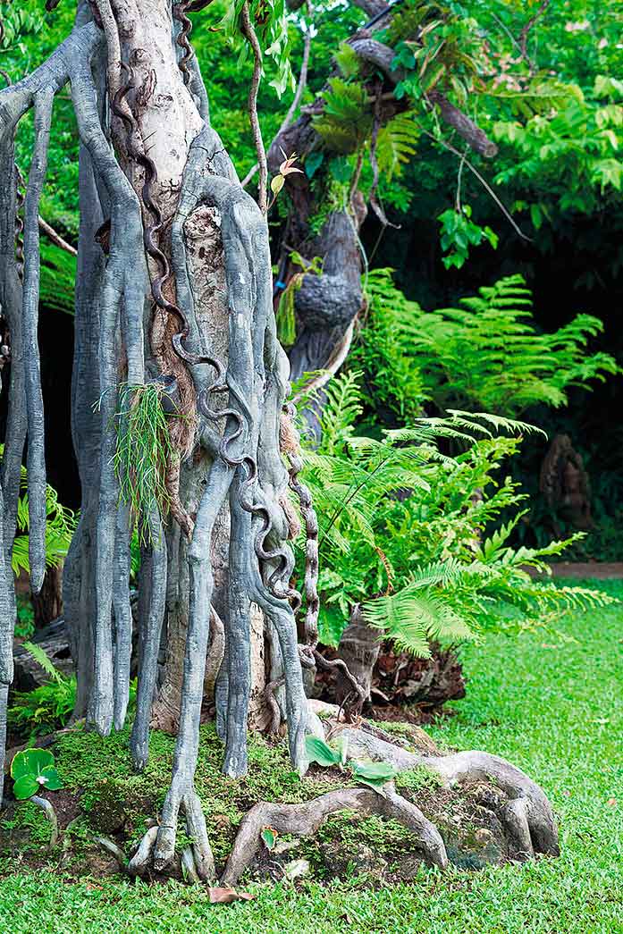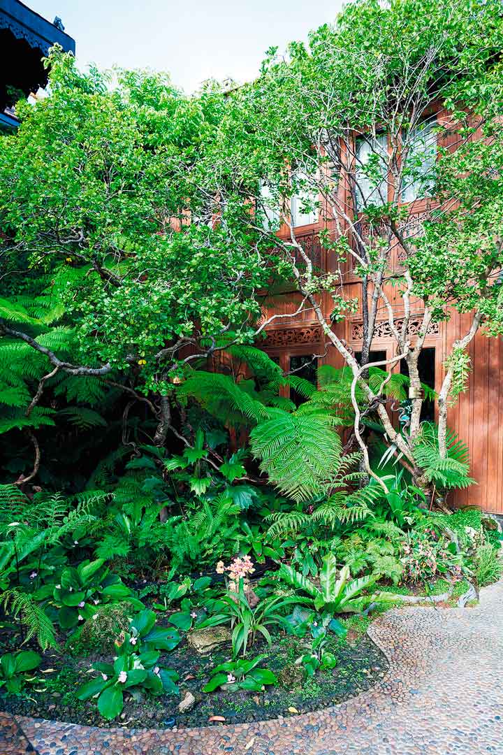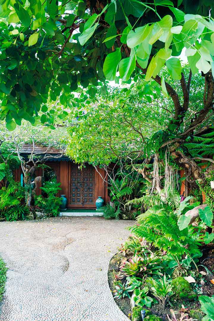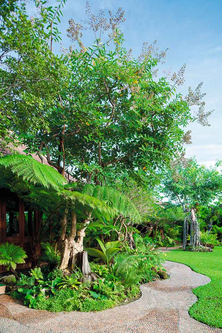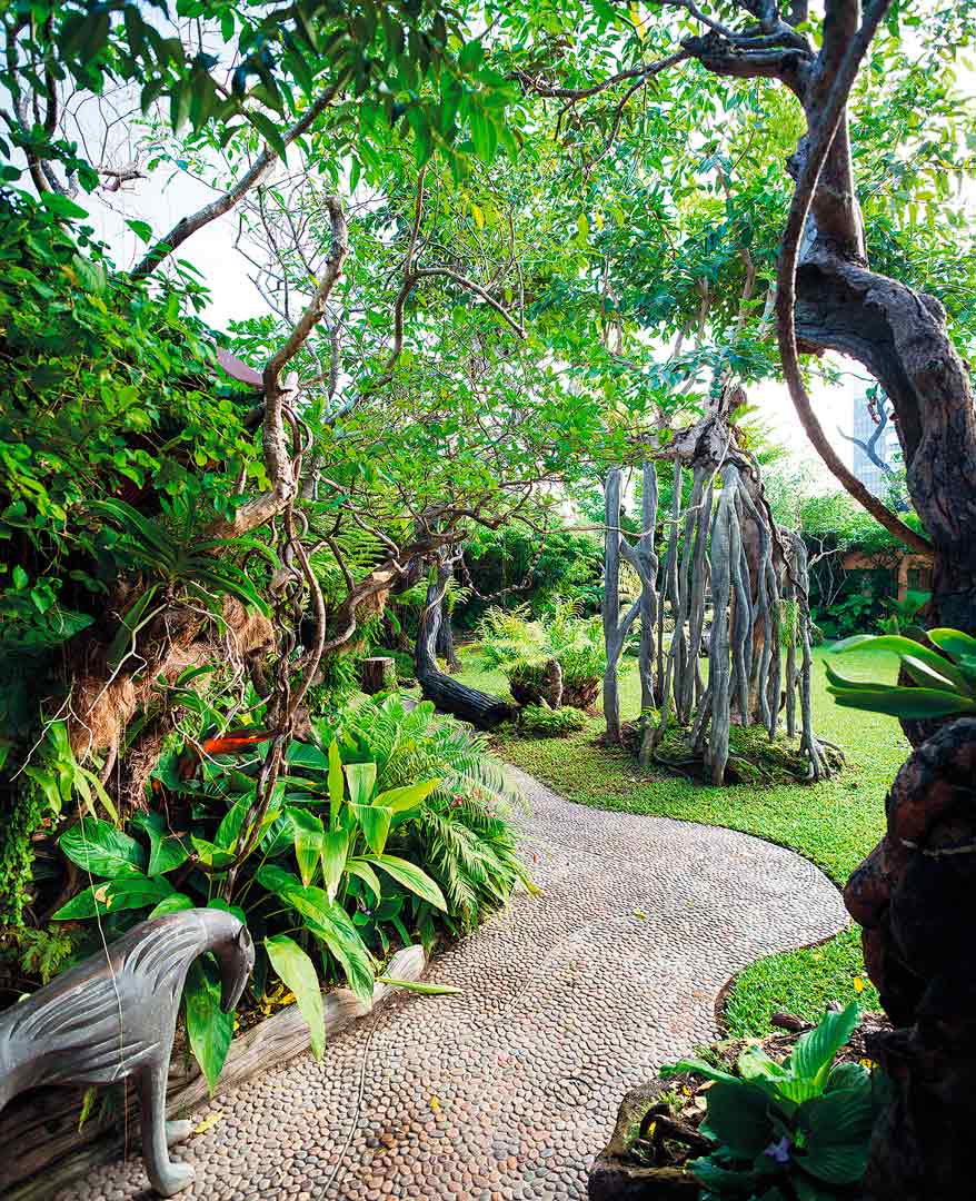 ทางเดินพื้นคอนกรีตตกแต่งด้วยกรวดแม่น้ำสลับสีอย่างเป็นธรรมชาติทอดยาวผ่านพรรณไม้ไทยโบราณ อาทิ อินจัน จำปี ชงโค จันทน์กะพ้อและหมากเม่า แทรกไปกับไม้พุ่มทรงสูงอย่างมะเขือต้น แก้วเจ้าจอม และพุดชนิดต่างๆ ซึ่งแผ่กิ่งก้านแตกแขนงออกเป็นทรงพุ่มดูสวยงาม บางต้นยังออกดอกสะพรั่งส่งกลิ่นหอมอ่อนๆ ไปทั่ว โดยมีไม้ระดับล่างอย่างเฟิน คล้า บุก บอน กล้วยไม้ดิน สับปะรดสี และมอสส์ขึ้นเขียวชอุ่มอยู่รอบโคนต้นจนไม่น่าเชื่อว่าสวนนี้จะอยู่เหนือพื้นดาดฟ้าคอนกรีตของอาคารใหญ่ใจกลางกรุงเทพฯ ซึ่งถมพื้นดินหนาเพียงแค่ประมาณ 15 เซนติเมตรเท่านั้น ทำให้ผมต้องถามถึงเคล็ดลับการดูแลสวนให้ดูอุดมสมบูรณ์ได้นานกว่า 8 – 9 ปีเช่นนี้ คุณวิกรมให้คำตอบว่า