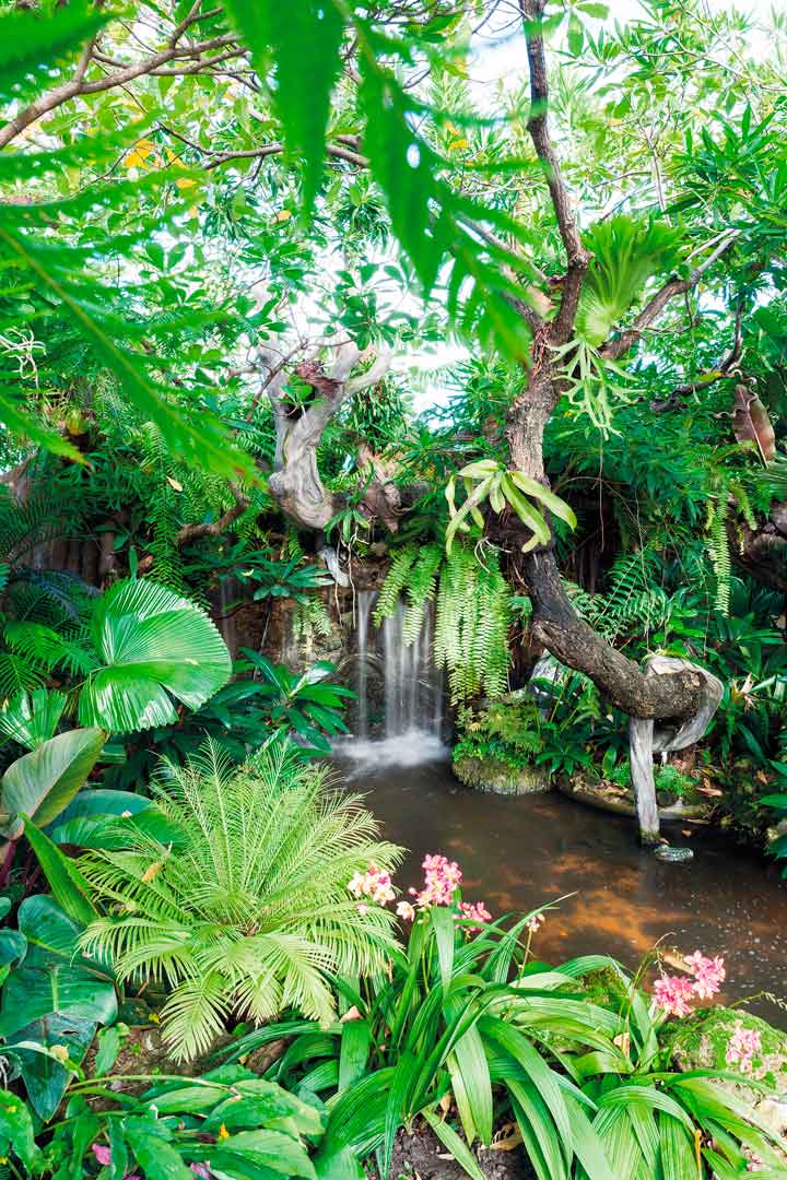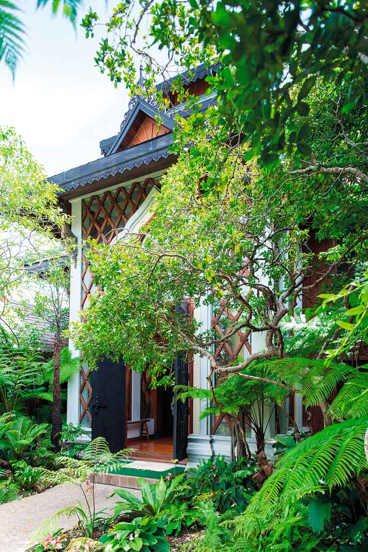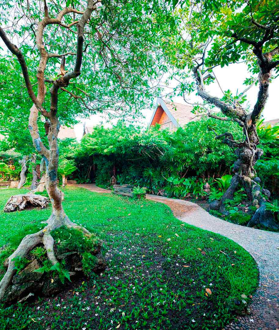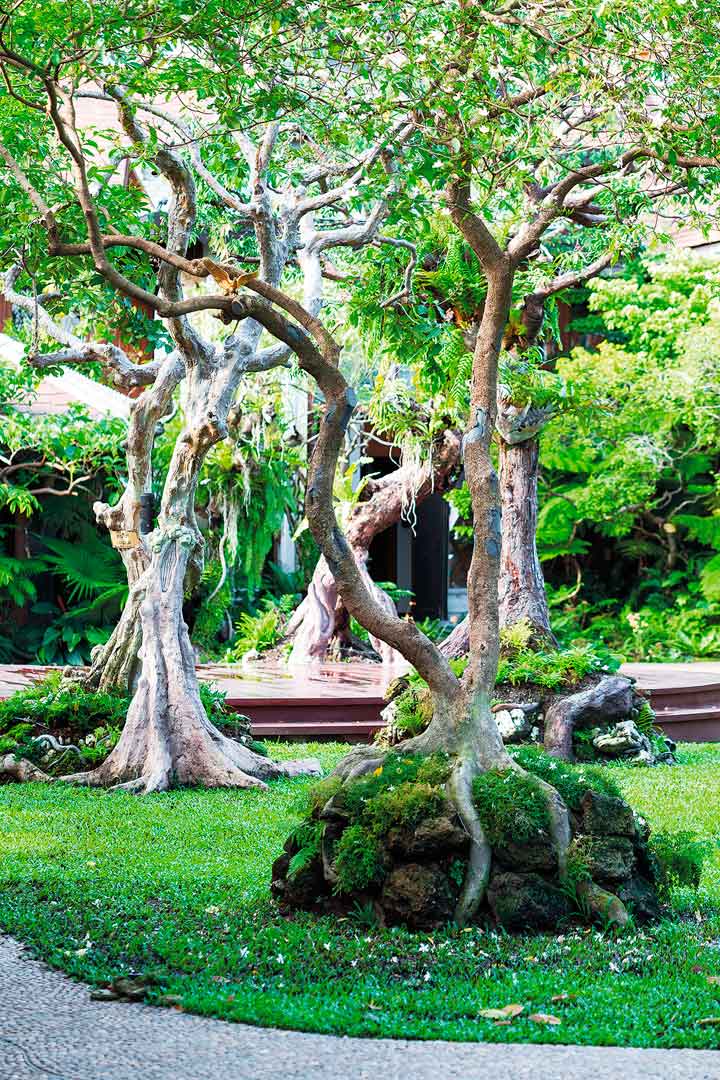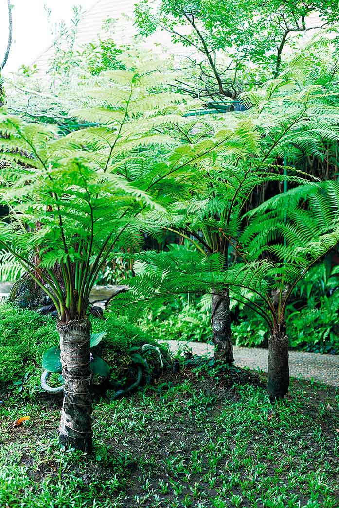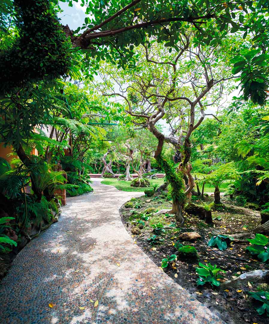 ทางเดินพื้นคอนกรีตตกแต่งด้วยกรวดแม่น้ำสลับสีอย่างเป็นธรรมชาติทอดยาวผ่านพรรณไม้ไทยโบราณ อาทิ อินจัน จำปี ชงโค จันทน์กะพ้อและหมากเม่า แทรกไปกับไม้พุ่มทรงสูงอย่างมะเขือต้น แก้วเจ้าจอม และพุดชนิดต่างๆ ซึ่งแผ่กิ่งก้านแตกแขนงออกเป็นทรงพุ่มดูสวยงาม บางต้นยังออกดอกสะพรั่งส่งกลิ่นหอมอ่อนๆ ไปทั่ว โดยมีไม้ระดับล่างอย่างเฟิน คล้า บุก บอน กล้วยไม้ดิน สับปะรดสี และมอสส์ขึ้นเขียวชอุ่มอยู่รอบโคนต้นจนไม่น่าเชื่อว่าสวนนี้จะอยู่เหนือพื้นดาดฟ้าคอนกรีตของอาคารใหญ่ใจกลางกรุงเทพฯ ซึ่งถมพื้นดินหนาเพียงแค่ประมาณ 15 เซนติเมตรเท่านั้น ทำให้ผมต้องถามถึงเคล็ดลับการดูแลสวนให้ดูอุดมสมบูรณ์ได้นานกว่า 8 – 9 ปีเช่นนี้ คุณวิกรมให้คำตอบว่า