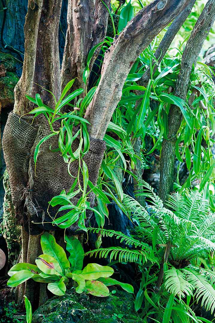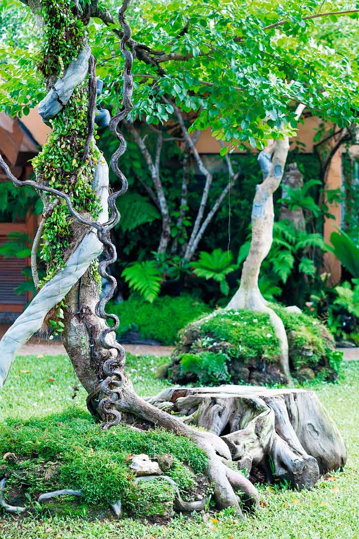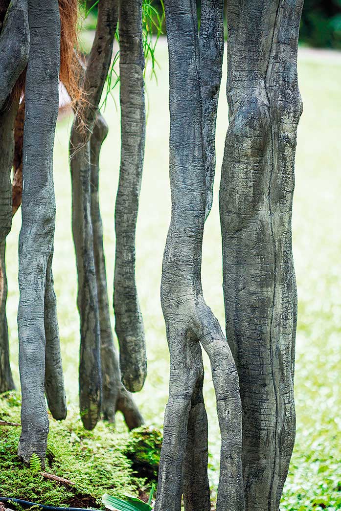 สวนแห่งนี้จึงไม่ใช่แค่ปลูกต้นไม้เพื่อความสวยงามชั่วครั้งชั่วคราว สิ่งสำคัญคือการดูแลเอาใจใส่พืชพรรณต่างๆ ให้เติบโตแข็งแรงและปรับตัวเข้ากับสิ่งแวดล้อมได้ดี ไม้ใหญ่ส่วนมากเป็นไม้พื้นบ้านที่ทนทานและมีการเจริญเติบโตช้า นำมาปลูกในตำแหน่งที่ตรงกับเสาเข็มและแนวคาน เนื่องจากพื้นที่ด้านบนไม่ได้ออกแบบให้มีกระบะปลูกต้นไม้หรือจัดสวนตั้งแต่ตอนต้น จึงใช้การวางต้นไม้ที่ปลูกในตุ้มดินแทนแทน พร้อมตกแต่งด้วยก้อนหินและไม้คลุมดินให้ดูเป็นธรรมชาติ รวมถึงใช้วัสดุค้ำยันที่ออกแบบเป็นคอนกรีตแต่งลวดลายและรูปทรงคล้ายรากไม้และเถาวัลย์ในธรรมชาติ สวนจึงดูไม่ผิดจากสวนป่าในธรรมชาติจริงๆ