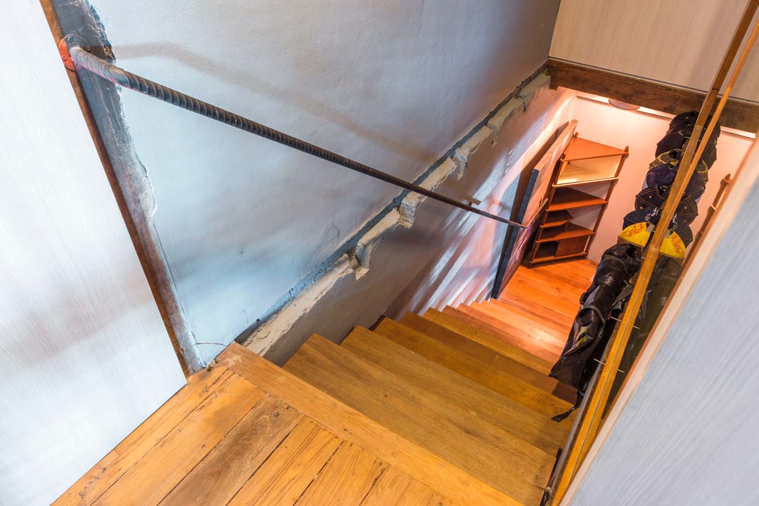 ตึกแถวสามชั้นนี้อาจมีหน้ากว้างไม่ต่างจากตึกแถวทั่วไป แต่มีความลึกน้อยกว่า เมื่อปรับปรุงแล้วจะไม่มีชั้นลอยเหมือนที่เราคุ้นตากัน หากมองขึ้นเพดานจะเห็นว่าคุณขวัญชัยวางตงและพื้นไม้ จึงให้ความรู้สึกเหมือนบ้านรุ่นเก่าชั้นล่างนี้ยังมีห้องนอนที่รองรับแขกได้ 2 คน และจอดรถเล็กๆ ได้ 2 คัน