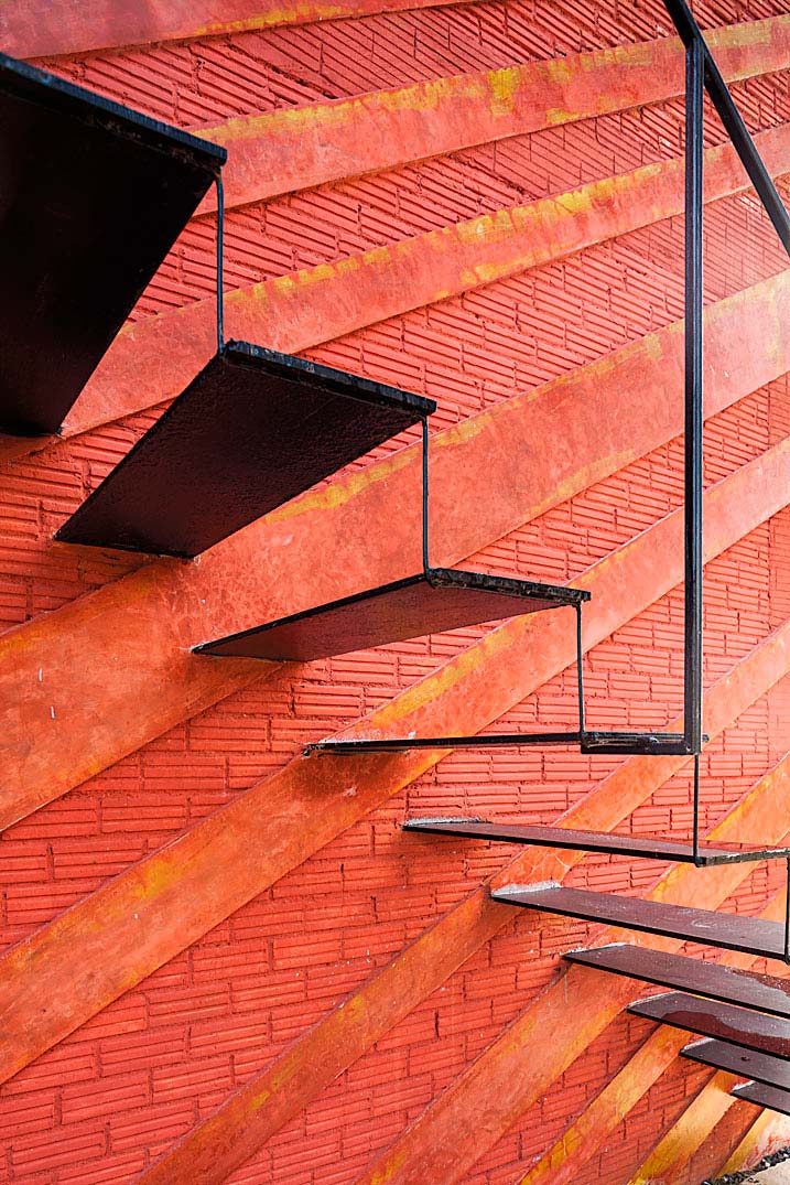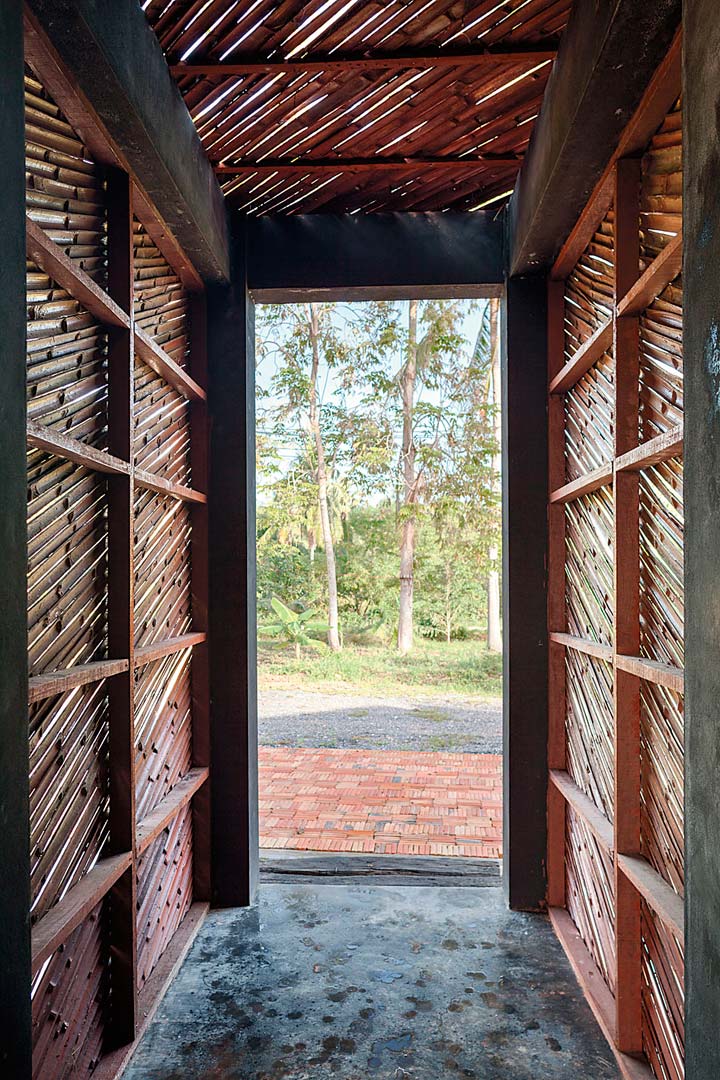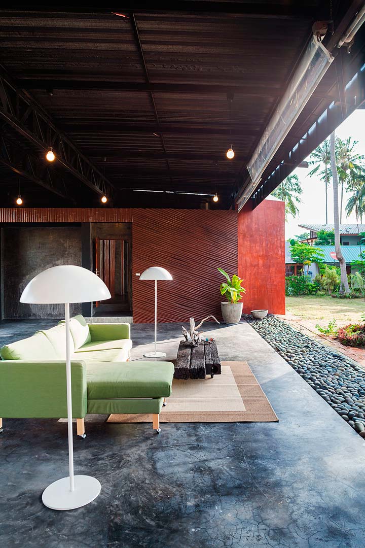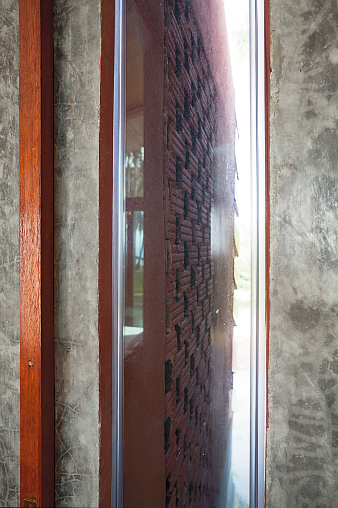 บ้านหลังนี้มองเห็นเด่นชัดได้แต่ไกลเลยทีเดียว ด้วยสีอิฐแดงและลายริ้วทแยงของอาคาร คุณนัดออกแบบห้องนั่งเล่นด้วยโครงสร้างเหล็กช่วงพาดกว้าง ผนังก่ออิฐฉาบปูนจึงเป็นเหมือนกับเสาหลักของโครงสร้าง แม้หลังคาของอาคารจะใช้วัสดุอย่างเมทัลชีต แต่มีดาดฟ้าไม้ที่ซ้อนเข้าไปอีกชั้นหนึ่ง ทำให้พื้นที่ด้านล่างเย็นสบาย ความร้อนจากแสงแดดแผ่ลงมาไม่มากนัก การออกแบบโครงสร้างที่สอดคล้องกับการใช้งานและเอื้อต่อภาวะน่าสบาย ทำให้ความงามและการใช้งานที่ดีสามารถดำเนินไปได้พร้อมกัน