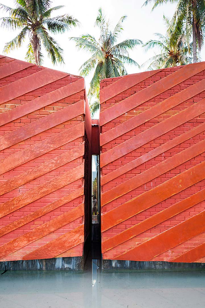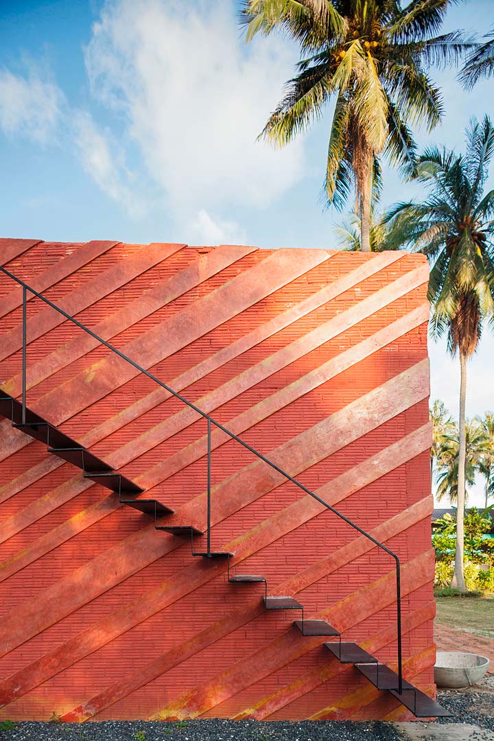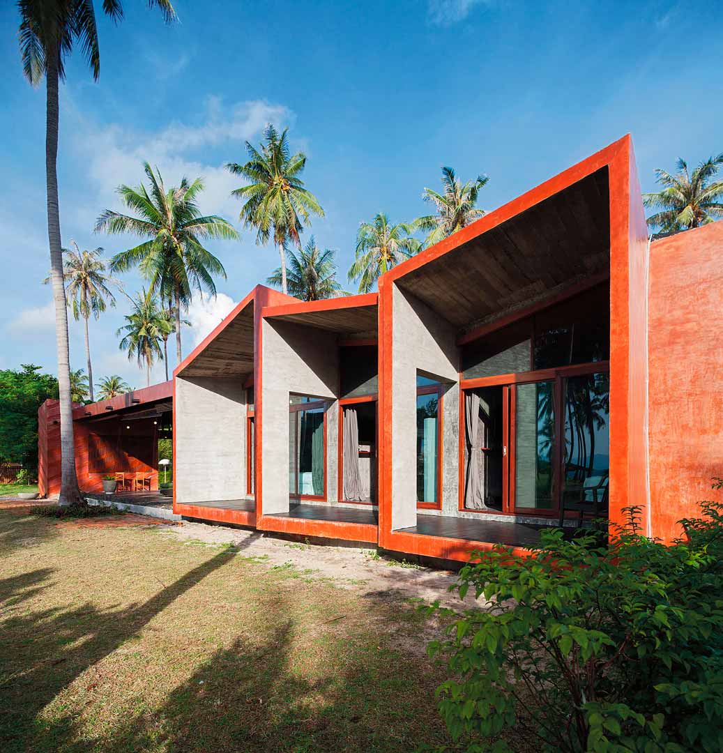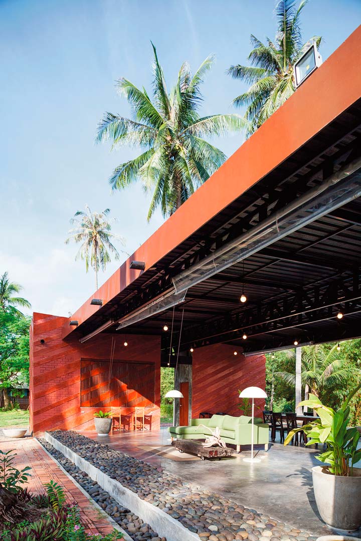 ครับ…ไม่ใช่ว่าเราไม่เชื่อ แต่บางครั้งคำว่าพื้นถิ่นก็คงต้องอาศัยการทำความเข้าใจกันสักเล็กน้อย คุณนัดจึงอธิบายต่อว่า “ผมชื่นชอบการใช้วัสดุพื้นถิ่นและฝีมือช่างพื้นถิ่นในการสร้างสรรค์ผลงาน ในความทรงจำของผม ผนังก่ออิฐแดง พื้นปูนขัดมัน และฝาไม้ไผ่ผ่าซีก วัสดุเหล่านี้หาง่ายและกลายเป็นเอกลักษณ์ที่เห็นได้ทั่วทั้งเกาะ ประกอบกับงานศิลปะริมทะเล มักมีลักษณะของสีสันและลวดลายแปลกตา ก็เลยนำมาใช้กับพื้นผิวของอาคาร เวลาคนเห็นอาคารก็จะจินตนาการไปได้ว่าเป็นทั้งลวดลายแบบศิลปะและแสงเงาที่ล้อเลียนมาจากเงาทาบของต้นมะพร้าวก็ได้ ผมว่าน่าสนใจและน่าจดจำไปพร้อมกัน นอกจากอัตลักษณ์ในเชิงรูปลักษณ์แล้ว เรื่องของความสบายก็สำคัญ ผมออกแบบให้ทุกห้องและทุกพื้นที่มีช่องเปิดสำหรับการถ่ายเทอากาศ ใช้ประโยชน์จากลมทะเลที่พัดมาตลอดทั้งวัน สร้างมุมบังแดดที่พอดีในช่วงชานบ้านด้านทิศตะวันตก และใช้ประโยชน์จากไอเย็นของบ่อน้ำรอบบ้าน บ้านหลังนี้จึงมีความสบายอย่างเหลือเฟือ แม้แดดริมทะเลจะร้อนแรงเพียงใดก็ตาม”