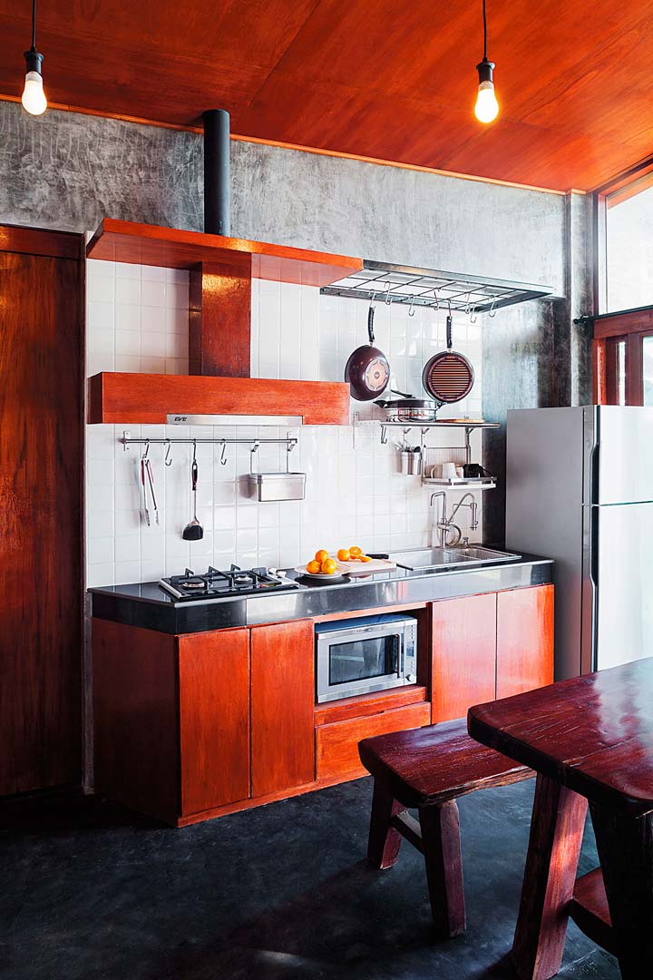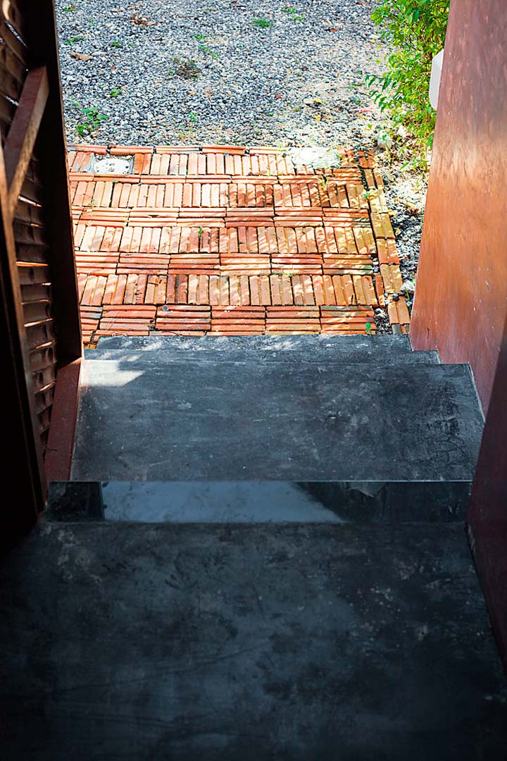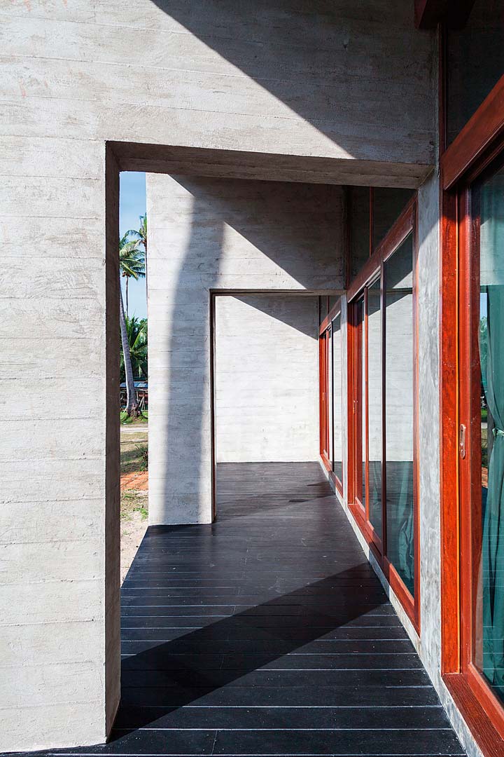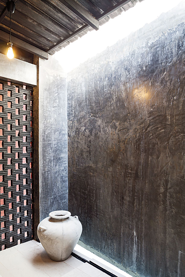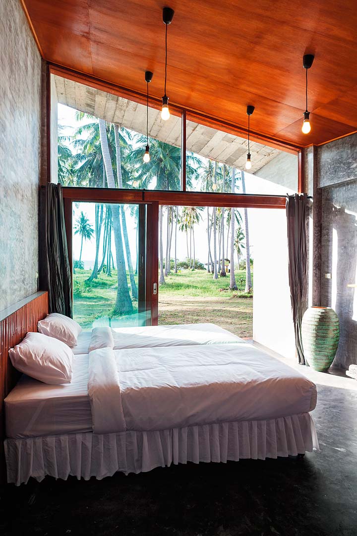 ครับ…ไม่ใช่ว่าเราไม่เชื่อ แต่บางครั้งคำว่าพื้นถิ่นก็คงต้องอาศัยการทำความเข้าใจกันสักเล็กน้อย คุณนัดจึงอธิบายต่อว่า “ผมชื่นชอบการใช้วัสดุพื้นถิ่นและฝีมือช่างพื้นถิ่นในการสร้างสรรค์ผลงาน ในความทรงจำของผม ผนังก่ออิฐแดง พื้นปูนขัดมัน และฝาไม้ไผ่ผ่าซีก วัสดุเหล่านี้หาง่ายและกลายเป็นเอกลักษณ์ที่เห็นได้ทั่วทั้งเกาะ ประกอบกับงานศิลปะริมทะเล มักมีลักษณะของสีสันและลวดลายแปลกตา ก็เลยนำมาใช้กับพื้นผิวของอาคาร เวลาคนเห็นอาคารก็จะจินตนาการไปได้ว่าเป็นทั้งลวดลายแบบศิลปะและแสงเงาที่ล้อเลียนมาจากเงาทาบของต้นมะพร้าวก็ได้ ผมว่าน่าสนใจและน่าจดจำไปพร้อมกัน นอกจากอัตลักษณ์ในเชิงรูปลักษณ์แล้ว เรื่องของความสบายก็สำคัญ ผมออกแบบให้ทุกห้องและทุกพื้นที่มีช่องเปิดสำหรับการถ่ายเทอากาศ ใช้ประโยชน์จากลมทะเลที่พัดมาตลอดทั้งวัน สร้างมุมบังแดดที่พอดีในช่วงชานบ้านด้านทิศตะวันตก และใช้ประโยชน์จากไอเย็นของบ่อน้ำรอบบ้าน บ้านหลังนี้จึงมีความสบายอย่างเหลือเฟือ แม้แดดริมทะเลจะร้อนแรงเพียงใดก็ตาม”