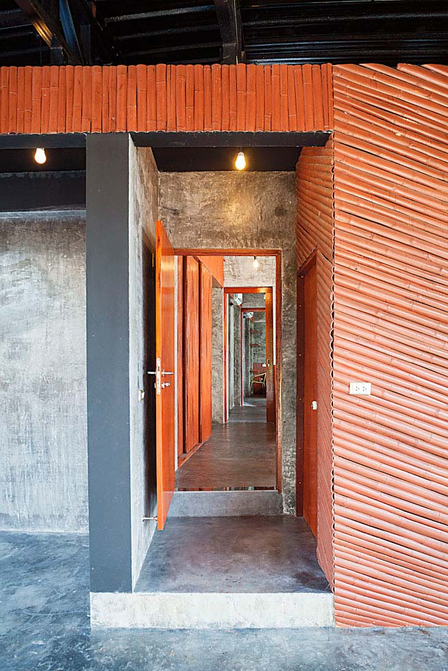 บ้านชั้นเดียว ที่เด่นด้วยผนังอิฐโชว์แนวสีน้ำตาลแดงในแพตเทิร์นใหม่ๆ ดูแปลกตาตัดกับปูนเปลือยขัดมันที่ทาบทับในแนวเฉียงแทรกด้วยงานไม้ไผ่แต่งผนังในแนวตั้ง