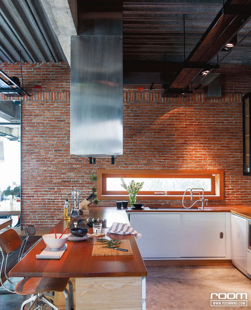 ออกแบบช่องหน้าต่างเหนือซิงค์ล้างจานให้ยาวขนานไปกับเคาน์เตอร์ ช่วยเปิดรับแสงสว่างให้ครัวไม่อับทึบ แถมยังช่วยระบายอากาศได้ดี โดยใช้หน้าต่างเป็นแบบบานกระทุ้ง มีบานพับที่แข็งแรงสามารถรับน้ำหนักได้มาก เพื่อให้เปิดหน้าต่างขึ้นได้สะดวกกรอบวงกบทําจากไม้ ช่วยเบรกความแข็งกระด้างของผนังอิฐและเข้ากันดีกับองค์ประกอบโดยรวม