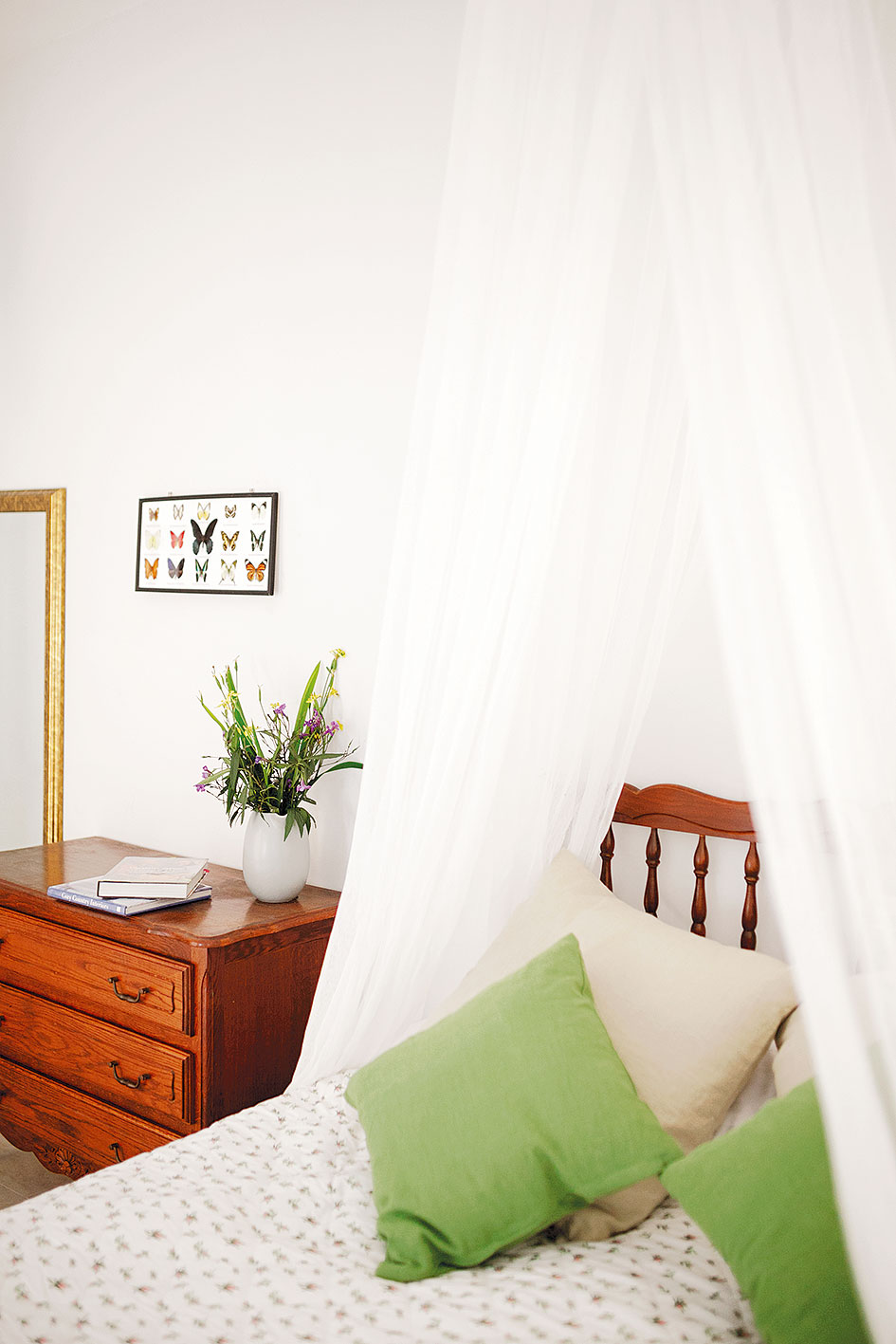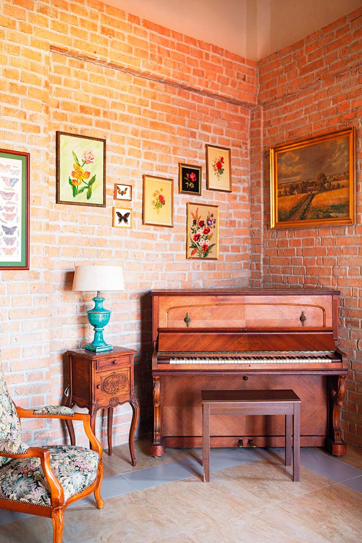 เราเดินขึ้นมาถึงชั้นสี่ซึ่งเป็นห้องนอนใหญ่ การตกแต่งให้กลิ่นอายแบบเฟมินีน ซึ่งดูอ่อนหวานแบบหญิงสาว หัวเตียงสีฟ้าตัดกับมุ้งสีขาวที่ช่วยคุมโทนให้ห้องดูอบอุ่นสบายตา ให้กลิ่นอายคล้ายบ้านในชนบทของฝรั่งเศส เมื่อเข้าไปยังด้านในสุดจะพบมุมโปรดที่คุณเฟิร์นบอกว่าเป็นมุมที่สะท้อนตัวตนของเธอมากที่สุด มุมนี้ประดับด้วยภาพศิลปะที่สะสมและนำมาแขวนตกแต่งบนผนังอิฐ เปียโนไม้วอลนัทจากยุค 1920 ตัวโปรดวางอยู่ในตำแหน่งที่โดดเด่น เรียกได้ว่าพื้นที่นี้ได้รวบรวมการใช้ชีวิตอย่างมีสุนทรีย์ของคุณเฟิร์น ไม่ว่าจะเป็นการเล่นดนตรี อ่านหนังสือ หรือวาดรูป