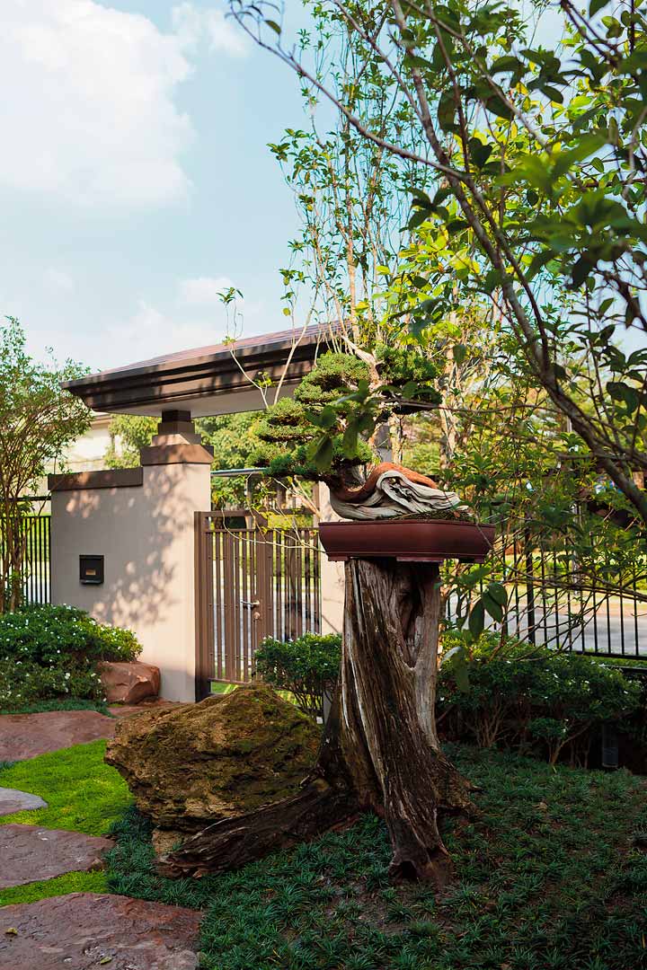 “ส่วนสำคัญอีกเรื่องคือการเลือกใช้พรรณไม้ เพราะชนิด สีสัน รูปฟอร์ม และลักษณะใบช่วยสร้างความรู้สึกและกำหนดอารมณ์ของสวนได้ อย่างไม้ยืนต้น ผมเลือกใช้ชนิดที่ไม่ค่อยผลัดใบ เพื่อไม่เป็นภาระการดูแลของเจ้าของสวนในภายหลัง เช่น หว้า มั่งมี กระบก ฯลฯ บริเวณที่เป็นสวนโมเดิร์นเซน ผมจึงเน้นพรรณไม้ที่มีฟอร์มพุ่มเรียบๆ มีผิวสัมผัสละเอียด ไม่มีสีสันมากนัก เพื่อให้เกิดบรรยากาศที่สงบ เช่น มอสส์ หนวดปลาดุกแคระ ไทรปัตตาเวีย แล้วแซมด้วยสีขาวของดอกพุดเพิ่มความน่าสนใจ แต่เมื่อเริ่มเปลี่ยนอารมณ์เข้าสู่โซนสวนป่าทรอปิคัล ผมจะเลือกใช้พรรณไม้ที่มีใบมันเงาสีเขียวสดอย่างต้นจิก เสม็ดแดง บริเวณใกล้น้ำตกปลูกไคร้ป่า ไคร้น้ำตกใบยอ ไคร้มะเดื่อ สวนก็ยิ่งดูชุ่มชื้น แล้วแซมเพิ่มสีสันด้วยไม้ดอกอีกนิดหน่อย และใช้พรรณไม้ที่มีลักษณะเป็นเส้นสายอิสระเพื่อทำให้สวนดูนุ่มนวล นอกจากนี้การจัดกลุ่มพรรณไม้ต้องแบ่งเลเยอร์เป็น 3 ระดับหลักๆ คือ ไม้ใหญ่ระดับสูง แล้วก็สเต็ปกลาง คือพวกหอมหมื่นลี้ พุดสามสี ฯลฯ ระดับล่างสุด ได้แก่ พวกไม้พุ่มเตี้ย และไม้คลุมดิน ซึ่งในแต่ละระดับก็สามารถแทรกเลเยอร์ซ้อนเข้าไปได้อีก แต่หากมากเกินพอดีอาจเกิดปัญหาของสเปซที่จะทึบและดูอึดอัดเกินไป ต้องฝึกฝนบ่อยๆจนชำนาญ ก็ได้ คุณสุรวุธ คำลือ มาช่วยจัดการครับ