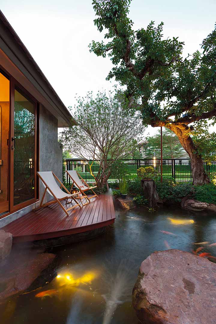“ครอบครัวเราอาศัยอยู่คอนโดมาหลายสิบปี พื้นที่สำหรับปลูกต้นไม้หรือได้เห็นธรรมชาติใกล้ๆ ก็แทบไม่มี พอคิดจะเลือกซื้อบ้านสักหลัง สิ่งแรกที่ผมคิดไว้คืออยากได้บ้านที่มีพื้นที่สวนกว้างๆ เพราะตัวผมเองชอบธรรมชาติและชอบบรรยากาศความชุ่มชื้นของสวนแนวทรอปิคัลมานานแล้ว ก็เลยเริ่มมองหาผู้ออกแบบ เพื่อเตรียมให้มาจัดสวนก่อนจะซื้อบ้านได้เสียอีกครับ จนผมมีโอกาสได้เห็นผลงานของ คุณวุฒิ – วรวุฒิ แก้วสุก รู้สึกว่าชอบมากๆ ดูสวยเป็นธรรมชาติดี และเป็นสไตล์ที่อยากได้ เมื่อได้พูดคุยกัน ผมบอกความต้องการกับคุณวุฒิไว้ว่าอยากมีสวนที่ให้ความรู้สึกใกล้เคียงป่า มีน้ำตก ลำธาร บ่อปลา คุยไปคุยมาจากการให้มาออกแบบสวนก็เลยได้เพื่อนมาช่วยเลือกซื้อบ้านด้วยครับ (หัวเราะ) ว่าหลังไหนมีพื้นที่ที่เหมาะสำหรับจัดสวน ซึ่งตัวคุณวุฒิเองเขามีความรู้ทางด้านฮวงจุ้ย เลยช่วยให้คำแนะนำเราเป็นอย่างดี