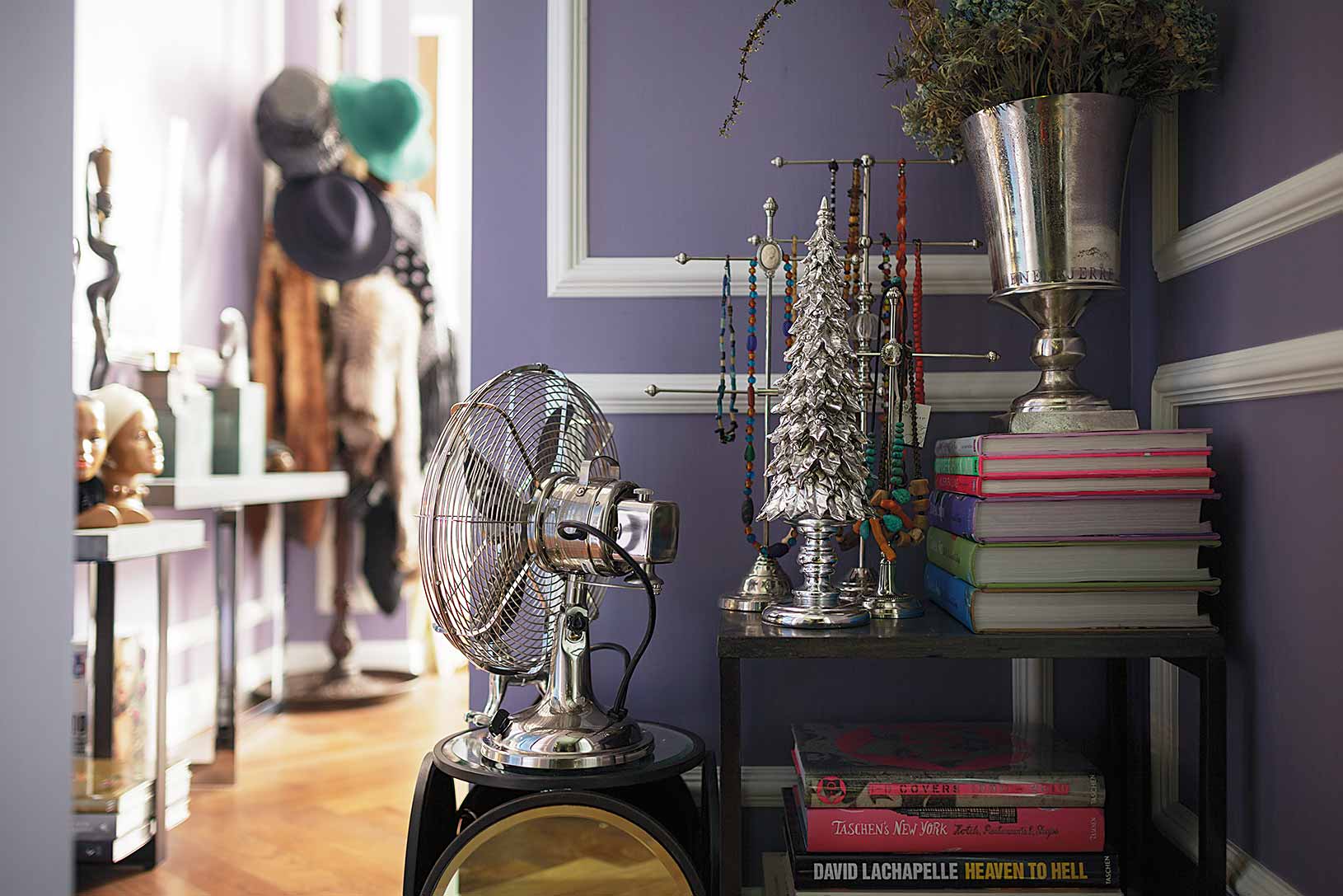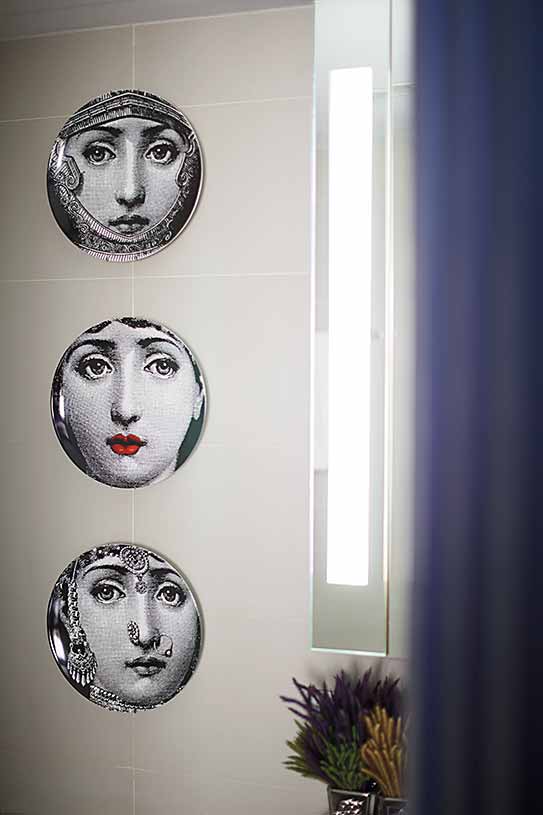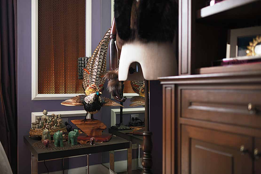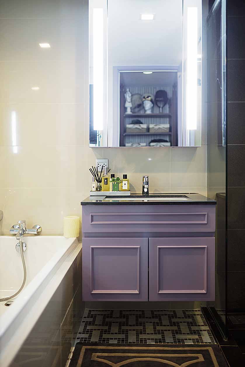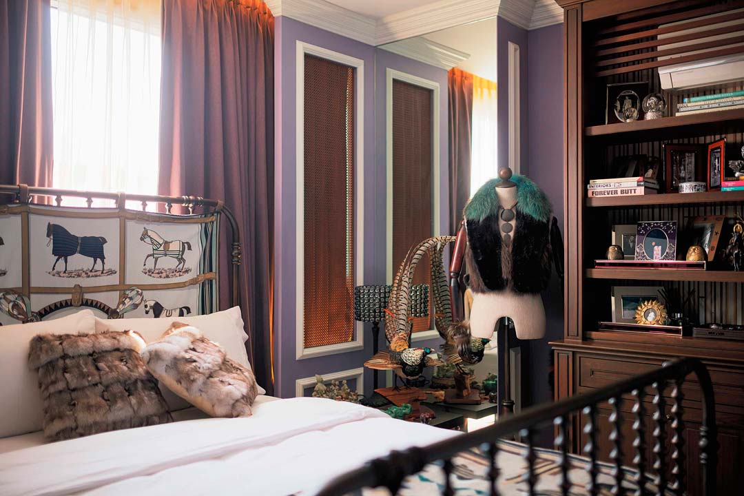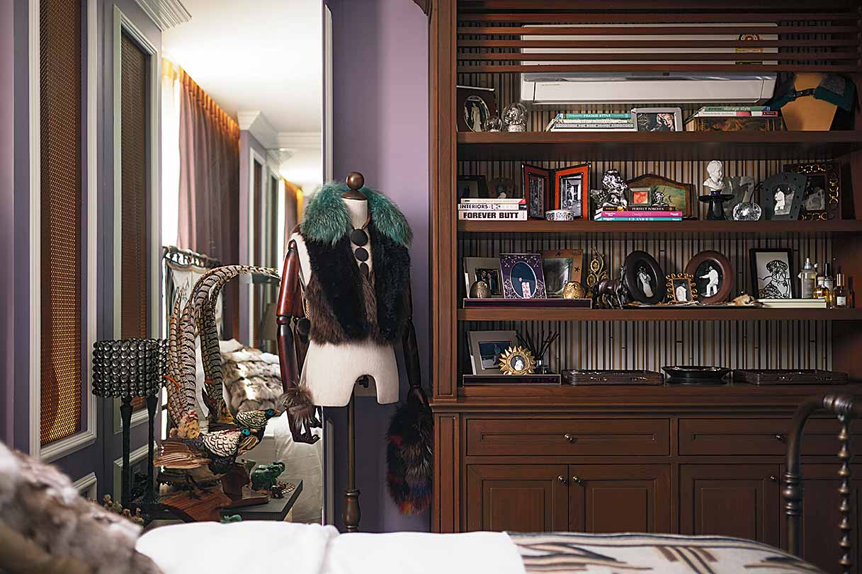 บรรยากาศภายในห้องนอนดึงดูดให้อยากพักผ่อนด้วยเตียงเหล็กสีดำขนาดใหญ่จากแบรนด์ DM HOME ส่วนหัวเตียงนั้นเจ้าของบ้านออกแบบมาจากปลอกหมอน ซึ่งได้รับการแปลงโฉมให้กลายเป็นผ้าคลุมหัวเตียงที่มีชิ้นเดียวในโลก ทางด้านขวาจัดวางตู้ไม้บิลท์อินสีน้ำตาลสำหรับวางของสะสมและกรอบรูป ความน่าสนใจคือการออกแบบหน้ากากแอร์ให้กลมกลืนไปกับตู้ ผนังสีม่วงตัดกับกรอบบัวสีขาวดูลงตัวและมีเสน่ห์ ทั้งยังรายล้อมด้วยของสะสมหลากหลายสไตล์ เช่น ผ้าขนเฟอร์ ของเก่าโบราณ และสัตว์สตัฟฟ์ ทั้งหมดจัดวางได้อย่างสวยงามลงตัว ต่อเนื่องไปจนถึงส่วนแต่งตัว ออกแบบเป็นชั้นวางบิลท์อินสำหรับเก็บแอ๊กเซสซอรี่ส์ กระเป๋าเดินทาง รองเท้า หมวก และราวแขวนเสื้อผ้า ระหว่างชั้นวางเผยให้เห็นรายละเอียดคล้ายเสาโรมันลวดลายอ่อนช้อยที่คุณภาวิศได้แรงบันดาลใจมาจากประเทศฝรั่งเศส ด้านในสุดคือห้องน้ำใหญ่ เน้นความเรียบ แต่แฝงด้วยความหรูหรา กระเบื้องพื้นที่สั่งตัดลายพิเศษเพื่อสะท้อนบุคลิกของเจ้าของบ้าน โดยคุณเอเป็นผู้ออกแบบเองทั้งหมดที่สำคัญต้องการให้ดูกลมกลืนไปกับพรมที่คุณภาวิศสั่งทอเป็นพิเศษ