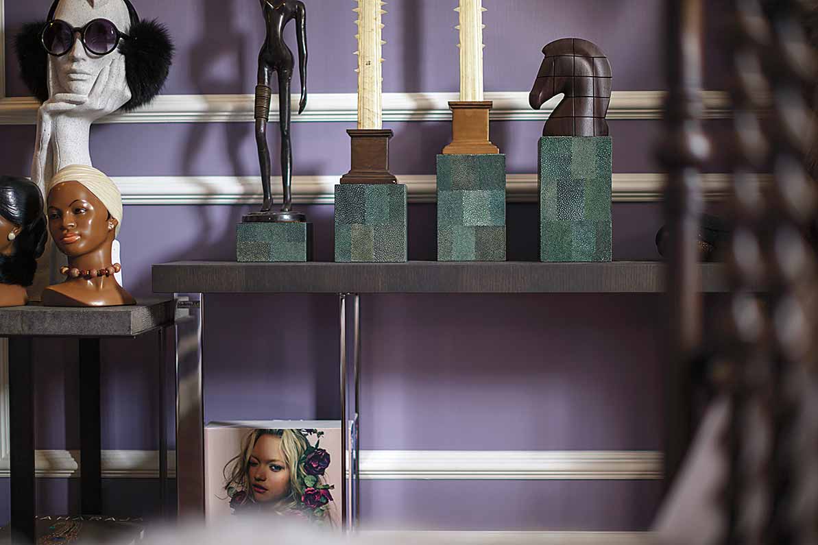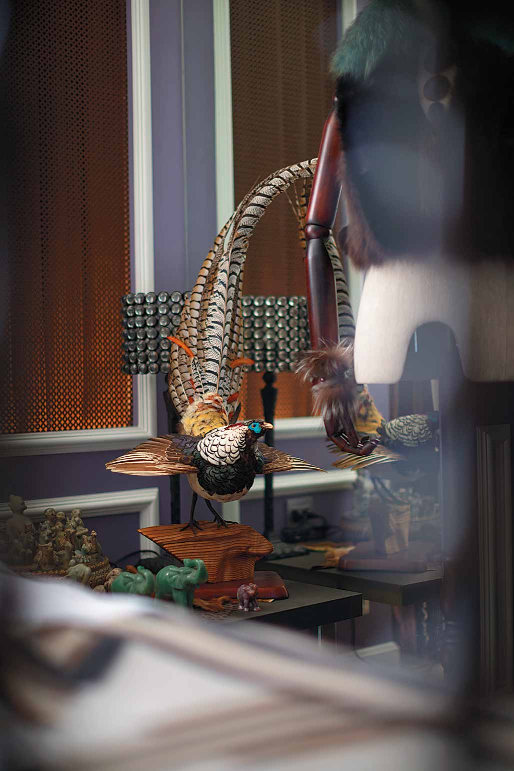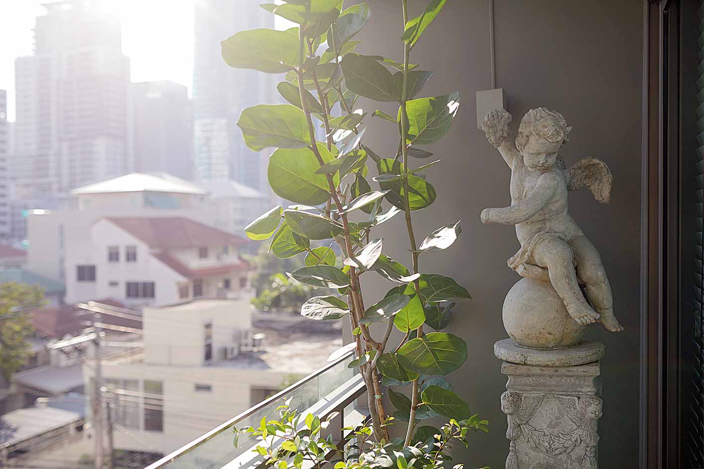 นอกจากนี้เรายังหันไปเห็นชั้นวางเครื่องประดับที่ร้อยจากลูกปัดโบราณซึ่งไม่อาจประเมินค่าและอายุได้ เมื่อมองลอดผ่านประตูกระจกบานเลื่อนไปจะพบระเบียงเล็กๆ ด้านนอกที่ทำให้เราหยุดมองรูปปั้นคิวปิดที่คุณภาวิศหวงและรักมาก