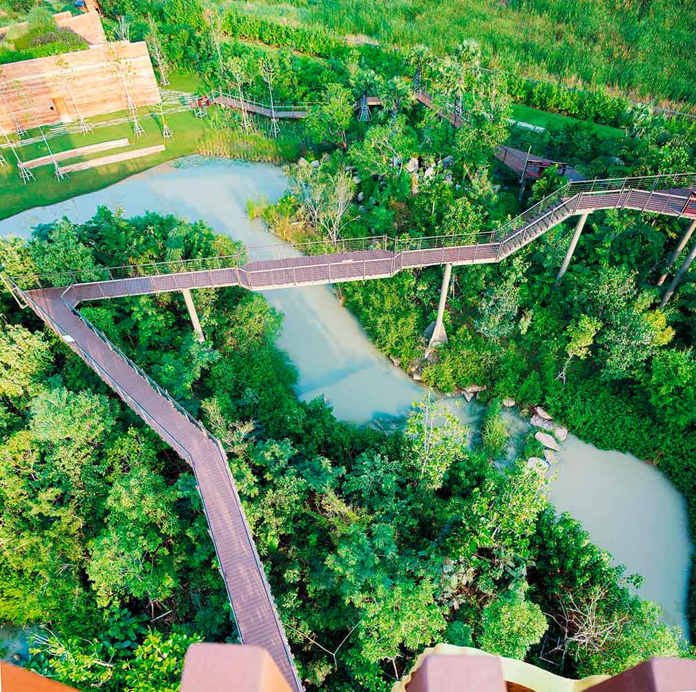ส่วนพื้นที่ภายนอกจัดเป็นสวนป่าเลียนแบบระบบนิเวศเดิมของพื้นที่บริเวณนี้คู่กับบ่อน้ำขนาดใหญ่ที่จัดให้มีระบบหมุนเวียนน้ำและความลึกในระดับต่างกัน เพื่อให้เกิดลักษณะภูมิประเทศที่หลากหลาย ตั้งแต่พื้นที่ริมน้ำ ป่าน้ำตก เขาหินปูน ป่าดิบลุ่มไปจนถึงป่าเบญจพรรณ โดยเราสามารถศึกษาระบบนิเวศต่างๆ ในป่าได้จากการเดินบนทางเดินชมเรือนยอด (skywalk)