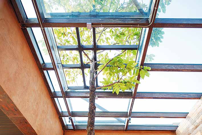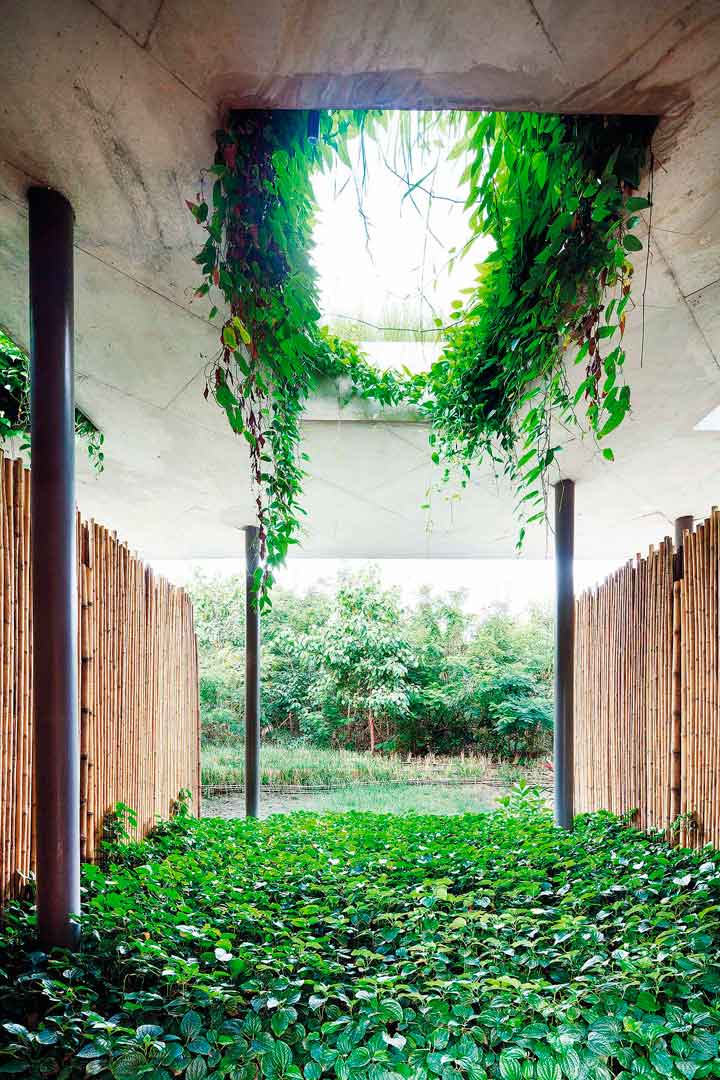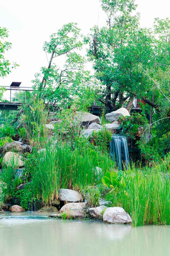 จากไอแดดของถนนคอนกรีตด้านนอก พื้นทางเดินหญ้าสีเขียวทอดนำไปสู่ทางเดินที่ขนาบด้วยนิทรรศการเมล็ดพันธุ์แห่งป่าที่จัดวางตลอดแนวผนังดินบดอัดสีสวย ก่อนนำไปสู่อาคารนิทรรศการที่จัดแสดงนิทรรศการน่าสนใจมากมาย ตั้งแต่บอกเล่าถึงสภาพป่าเดิมในกรุงเทพมหานคร อันเป็นที่มาของชื่อย่านต่างๆ ไปจนถึงห้องฉายภาพยนตร์ปลุกจิตสำนึกเกี่ยวกับการรักษาสิ่งแวดล้อมในเมือง อาคารแห่งนี้ยังมีพื้นที่ดาดฟ้าซึ่งมีส่วนช่วยป้องกันความร้อนให้เข้าสู่ตัวอาคารน้อยลง และยังเป็นพื้นที่สำหรับพักผ่อนและชมวิวทิวทัศน์ของโครงการอีกจุดหนึ่งด้วย