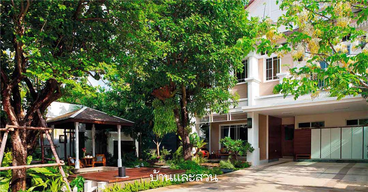 คุณบอยกล่าวเสริมว่า “ศาลากับผนังน้ำตกเป็นของแถมมาพร้อมกับบ้าน ที่เหลือรื้อออกหมด แต่เก็บไม้ใหญ่อย่างคูนและชงโคไว้สองต้น คุณหมีให้โจทย์มาว่าอยากได้สวนสไตล์สวนเมืองร้อนที่ดูร่มรื่น นอกนั้นเขาให้อิสระในการออกแบบเต็มที่ พื้นที่ทั้งหมดของบ้านอยู่ริมด้านในสุดของโครงการ จึงมีเนื้อที่มากพอสมควร แบ่งเป็นตัวบ้านกับลานจอดรถ ส่วนที่เหลือใช้จัดสวนทั้งหมด เริ่มต้นตั้งแต่เดินผ่านประตูรั้วเข้ามาบริเวณลานจอดรถ จากตรงนี้มองเห็นภาพรวมของสวนได้เกือบทั้งหมด เลือกปลูกไม้ใหญ่ฟอร์มสวยสองต้นเป็นพระเอก คือหมากเม่ากับจิกน้ำ ไปเลือกซื้อด้วยกันกับเจ้าของบ้าน ฝั่งซ้ายมือเป็นกำแพงของโครงการ ตรงนี้ปลูกเหลืองชัชวาลเลื้อยเป็นฉากปิดไม่ให้เห็นกำแพง แต่ยังได้อารมณ์ของผนังสีเขียวอยู่ ด้านล่างปลูกมะลิดอกหอมที่ คุณแจ่ม – แจ่มจันทร์ นิคมรัตน์ เจ้าของบ้านฝ่ายหญิงชื่นชอบ อีกต้นหนึ่งที่สวยไม่แพ้กันคือคูนขาวที่กำลังออกดอกเต็มต้น ทำหน้าที่ให้ร่มเงาแก่บริเวณลานจอดรถด้วย