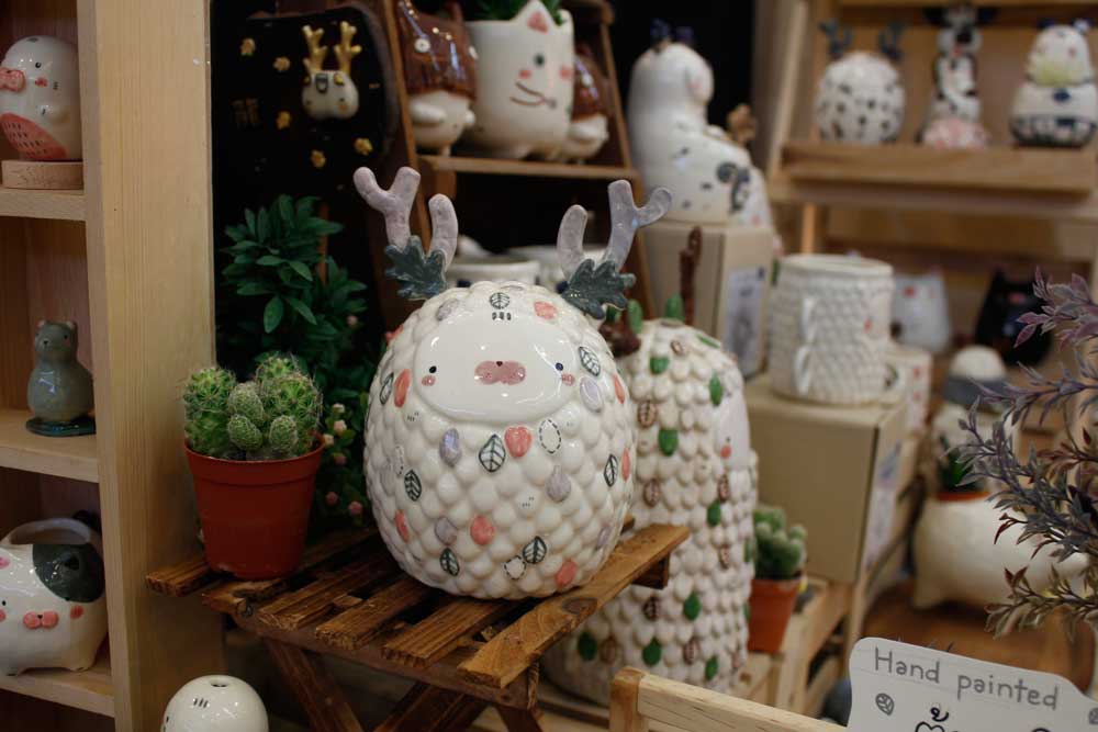 เดินผ่านร้านนี้เป็นต้องสะดุดกับเซรามิกคาแร็กเตอร์สุดน่ารักผสมผสานกับสีพาสเทลให้ตัวชิ้นงานดูละมุน เจ้าของร้านได้ปั้นงานเซรามิกออกมาหลากหลายแบบ ซึ่งตัวคาแร็กเตอร์หลักถ้ามองเผินๆ จะนึกว่า “แกะ” แต่เจ้าของร้านได้กระซิบบอกเราว่าจริงๆ แล้วคือ “มังกร” ที่ตัดทอนออกมาให้ดูน่ารักมากขึ้น นอกจากนี้ยังมีสัตว์อื่นๆ และผู้หญิงที่แทนเป็นเจ้าของร้านเอง ชิ้นงานในร้านมีหลายประเภท ทั้งแก้ว กระถางต้นไม้ ของประดับตกแต่งบ้าน รวมไปถึงเข็มกลัดติดเสื้อเป็นตัวสัตว์น่ารักนานาชนิดให้เลือกสรรกันไม่ถูกเลยทีเดียว