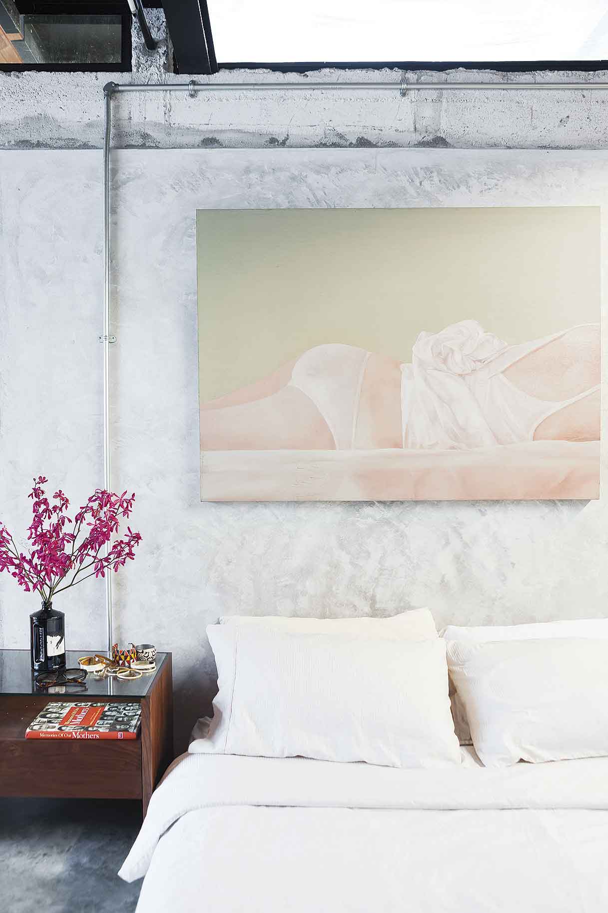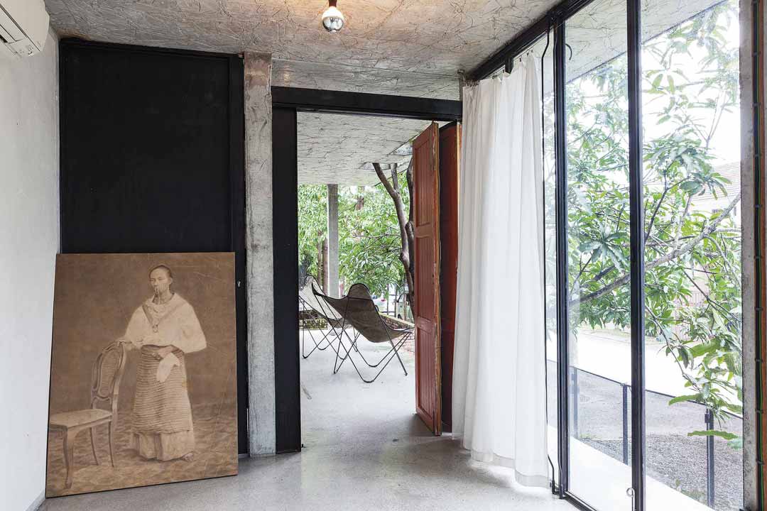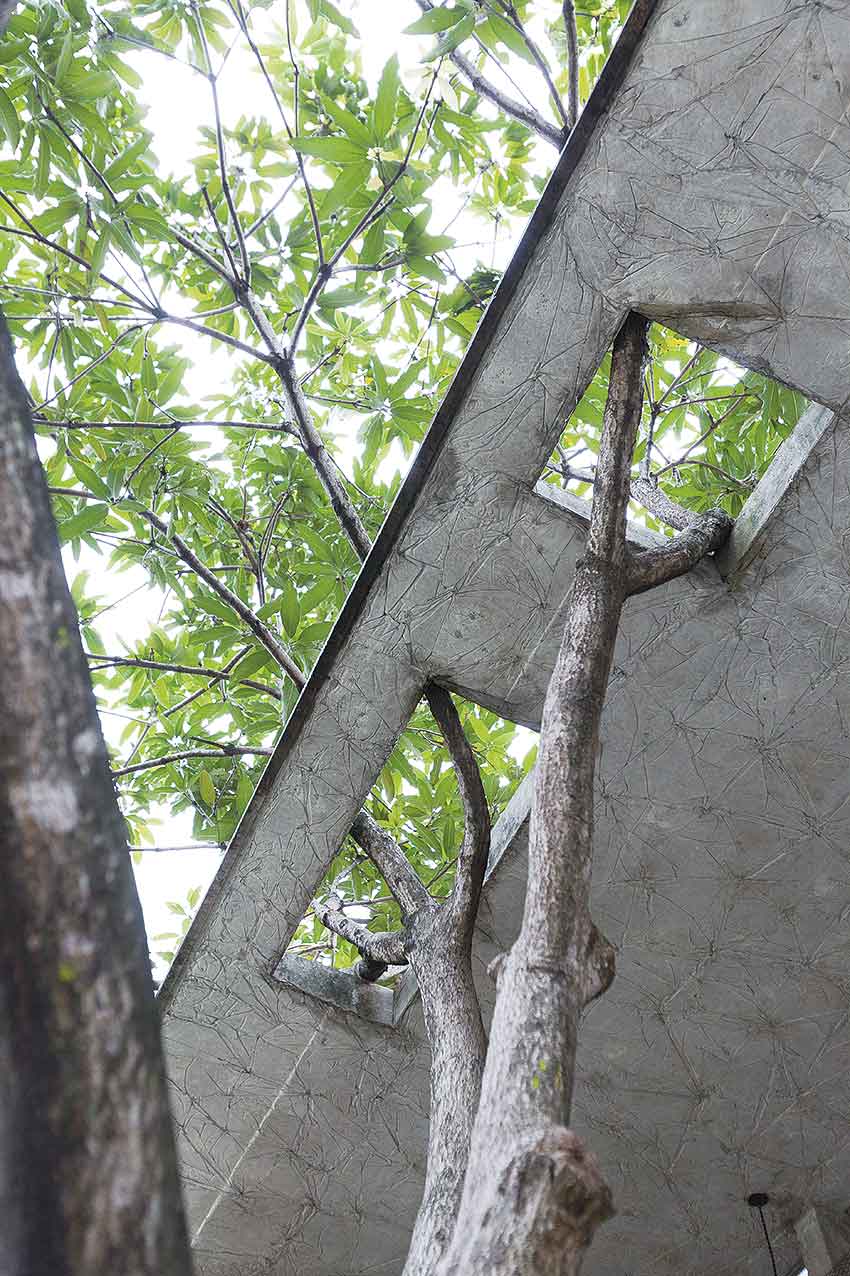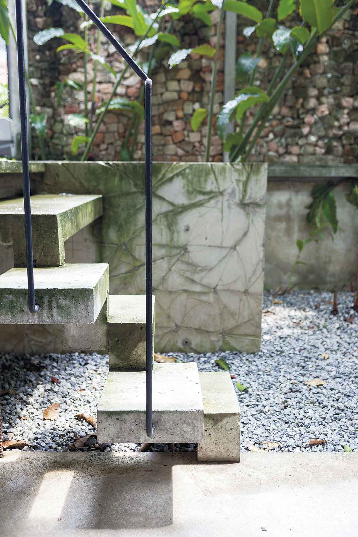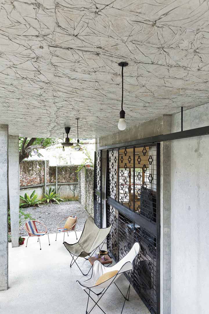 สำหรับผนังภายในบ้านบางส่วนที่เป็นผิวฉาบเรียบทาสีธรรมดา คุณฟาราห์ได้สกัดผิวบางๆ เกิดเป็นเท็กซ์เจอร์ที่เพิ่มอารมณ์แบบลอฟต์ให้บ้าน รายละเอียดอีกอย่างที่เราชอบคือพื้นผิวบริเวณใต้ท้องพื้นหลังคาคอนกรีตเสริมเหล็กที่คุณฟาราห์ใช้เทคนิคการก่อสร้างโดยปูแผ่นพลาสติกบางๆ ก่อนก่อเทคอนกรีต ด้วยความยับของแผ่นพลาสติกที่ออกแบบจัดวางไว้ เมื่อแกะแบบหล่อออกมาจึงได้ลวดลายของท้องพื้นคอนกรีตที่ดูแปลกตา เพิ่มลักษณะเฉพาะตัวให้บ้านหลังนี้