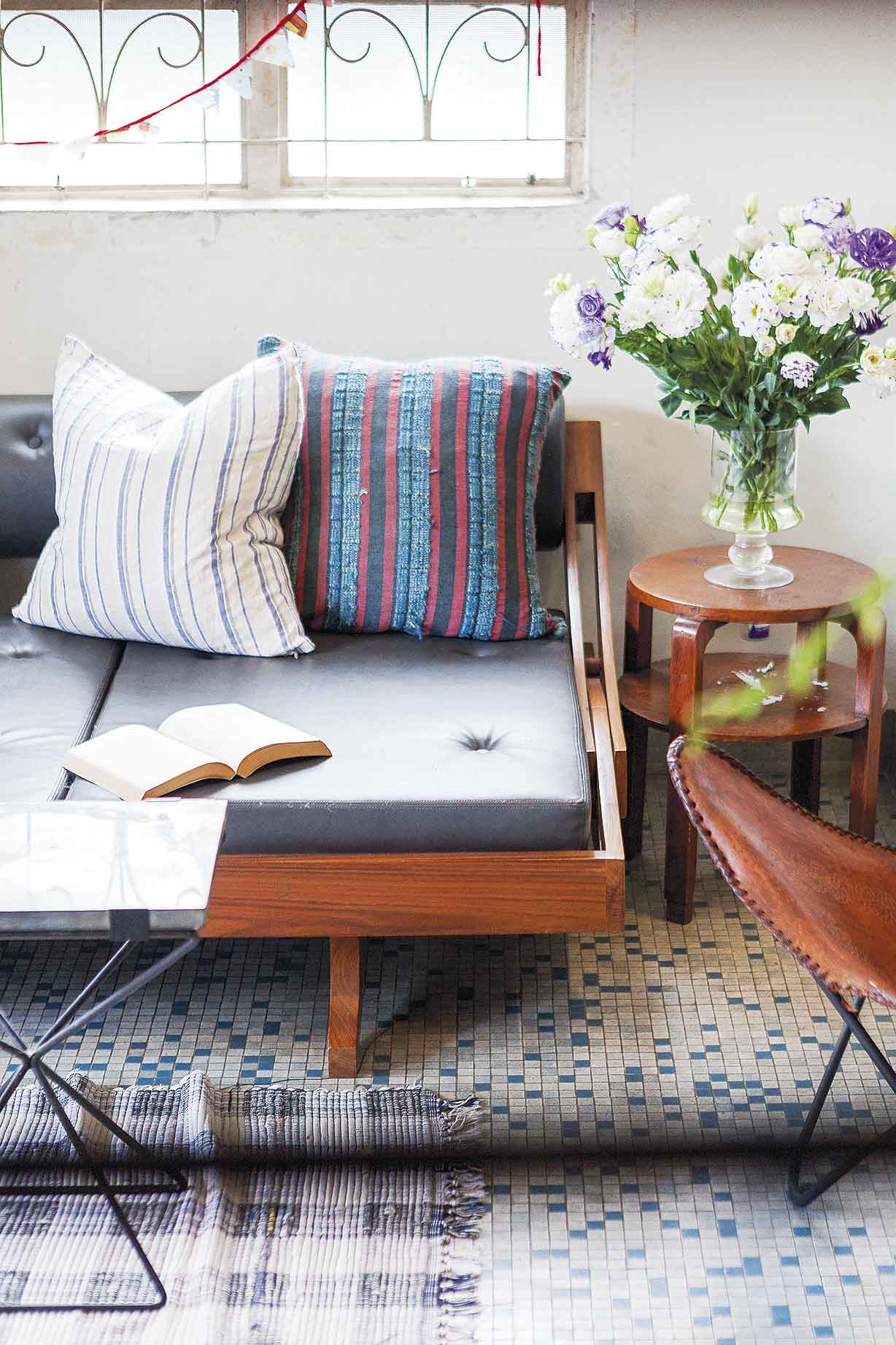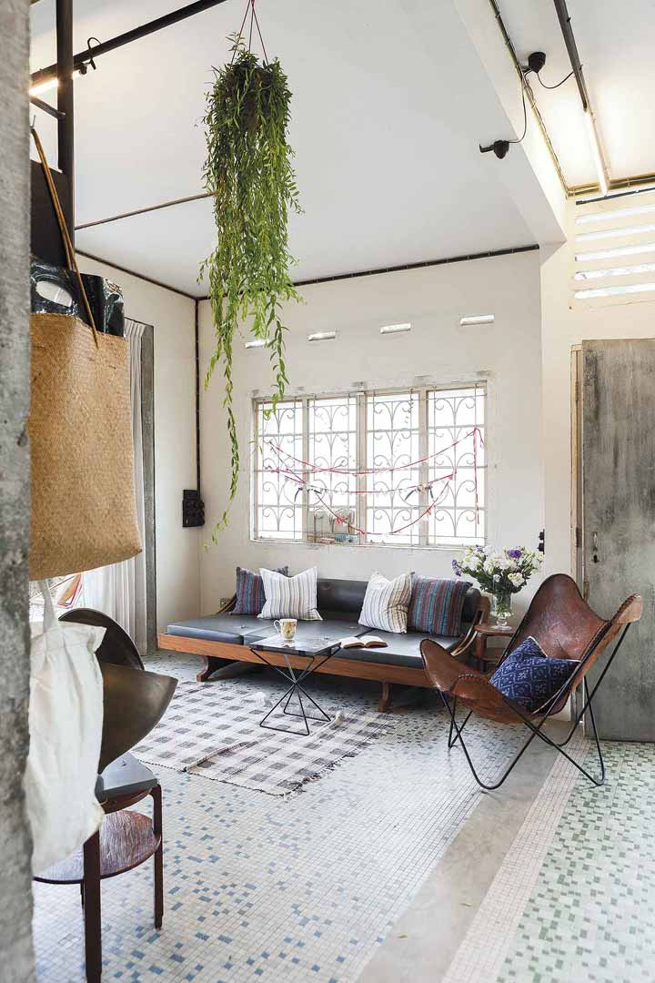 ส่วนเฟอร์นิเจอร์ภายในบ้านไม่ได้มีสไตล์หรือรูปแบบชัดเจน หากเป็นการผสมผสานสไตล์ที่จัดวางร่วมกันในบรรยากาศแบบโมเดิร์นลอฟต์ เช่น การนำโซฟายาวทรงสี่เหลี่ยมทำจากไม้สักดีไซน์เก่ามาจัดวางคู่กับเก้าอี้ที่ขึ้นรูปด้วยโครงเหล็กกลมขนาดเล็ก ดูทันสมัยและบางเบา บ้านสวย