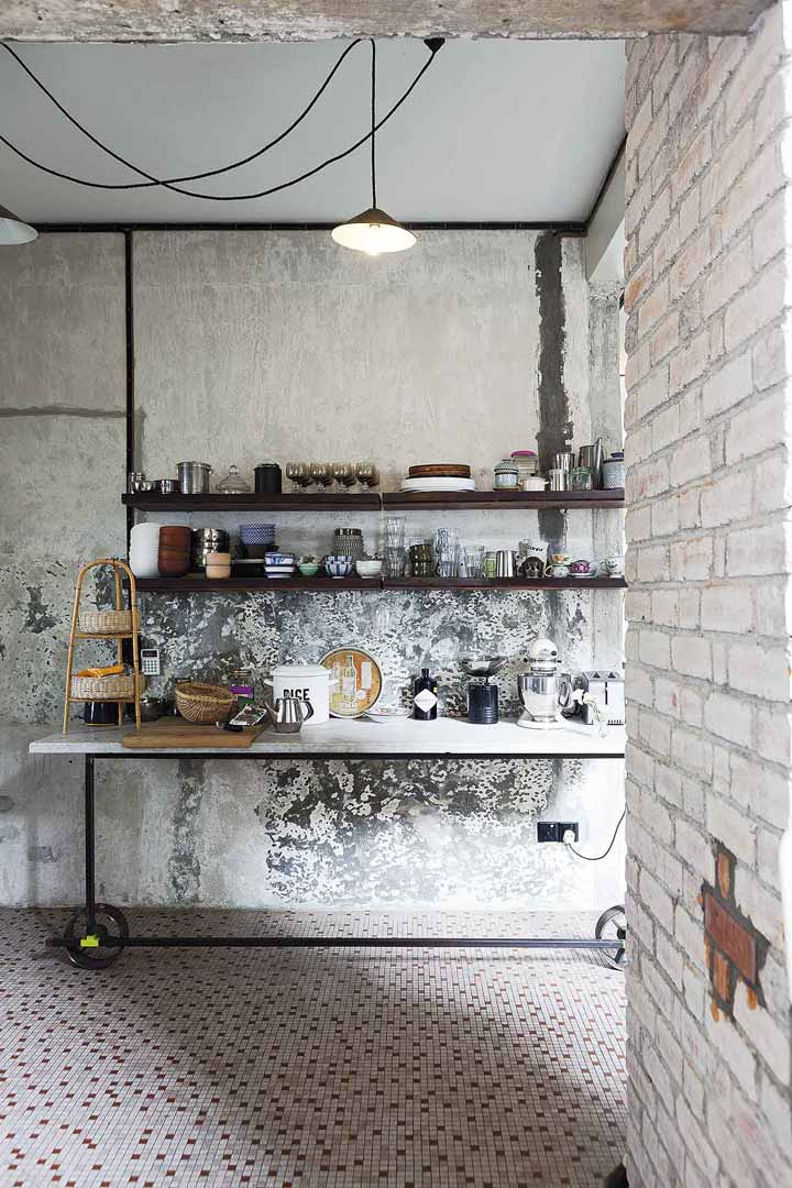 หรือแม้แต่การจัดวางชุดครัวสเตนเลสขนาดใหญ่ซึ่งมีพื้นผิวมันวาวดูทันสมัย ใกล้กันก็เป็นผนังเดิมที่สกัดพื้นผิวออกเพื่อให้ได้เท็กซ์เจอร์แบบลอฟต์ คุณฟาราห์เล่าว่าต้องการขยายขอบเขตพื้นที่ใช้สอยภายในบ้านให้กว้างขึ้น โดยปรับลดแนวกั้นผนังภายในบ้านเพื่อให้ได้พื้นที่ใช้สอยที่ดูต่อเนื่องกัน ทั้งยังผสมผสานความสวยงามจากความคลาสสิกของงานโครงสร้างกับสไตล์ใหม่อย่างโมเดิร์นและลอฟต์ที่ใส่เพิ่มเข้าไป