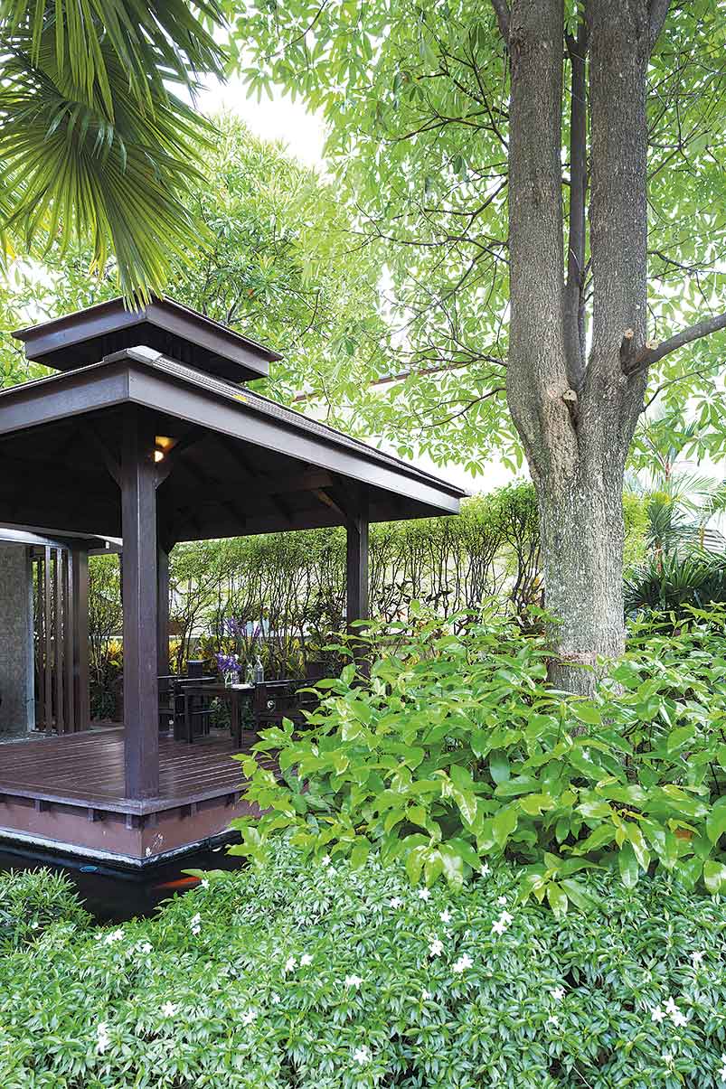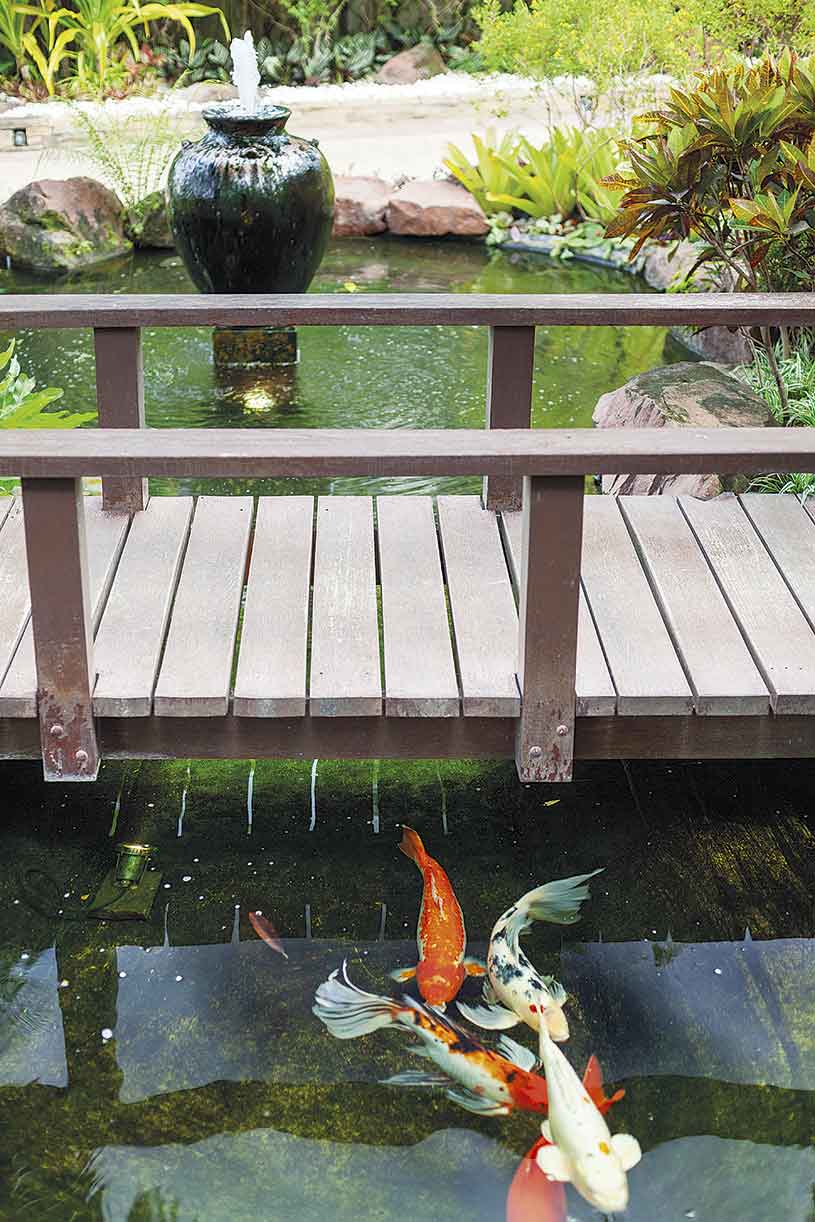 ถัดไปเป็นศาลานั่งเล่นริมธารน้ำตก ผู้ออกแบบใช้สะพานเชื่อมพื้นที่ เพื่อให้ผู้ใช้งานได้สัมผัสกับบรรยากาศระหว่างทางได้ยินเสียงน้ำ เห็นความเคลื่อนไหวของน้ำและปลาคาร์พสีสันสวยงามที่กำลังแหวกว่ายไปมา เราหยุดยืนตรงหน้าทางเข้าศาลาซึ่งออกแบบให้มีลักษณะเปิดโล่งรับลมได้ทุกทิศทาง แต่บนเพดานก็มีการติดตั้งพัดลมเสริมด้วย ถือเป็นจุดพักผ่อนที่มองเห็นวิวสวนได้รอบ แม้แดดข้างนอกจะร้อน แต่เมื่อเข้ามานั่งในศาลากลับรู้สึกเย็นสดชื่นมาก เจ้าของบ้านเองก็ยังยืนยันว่า