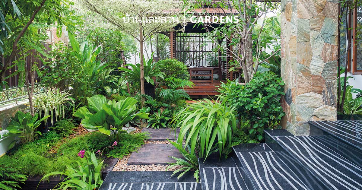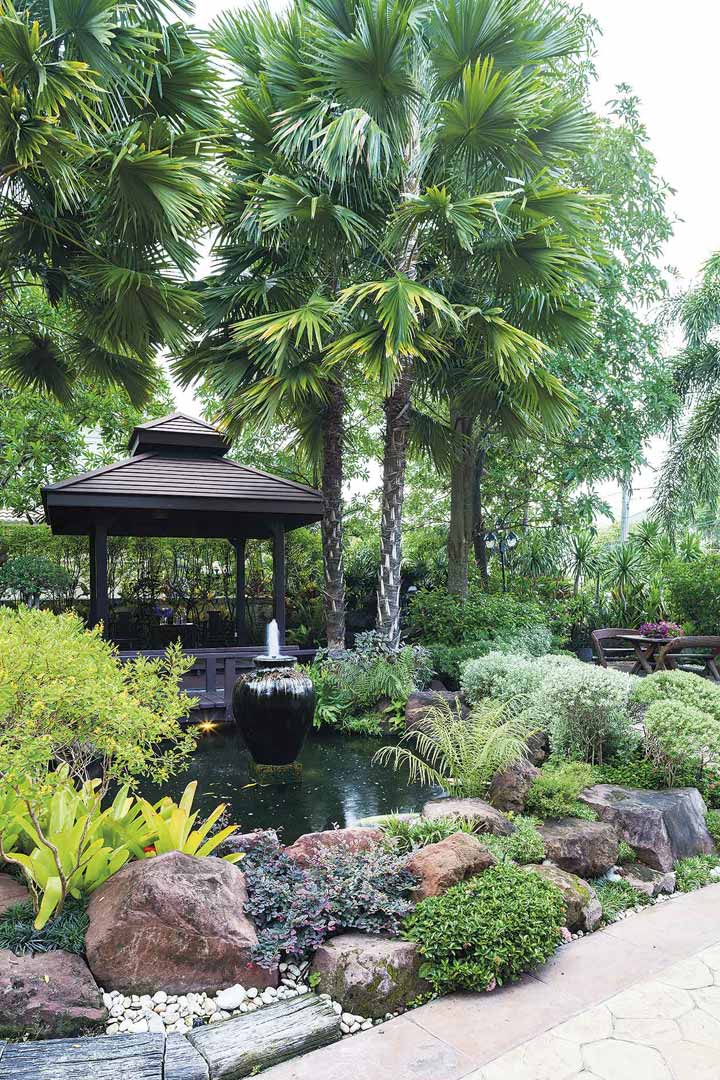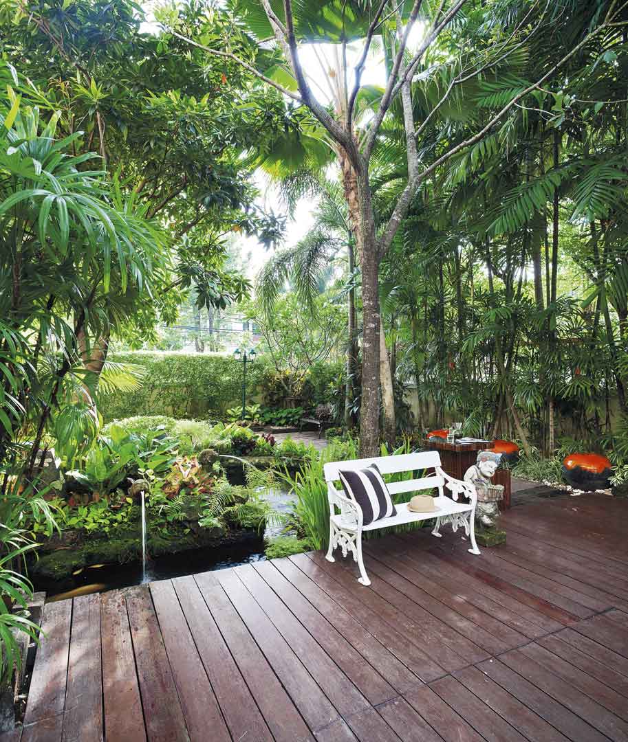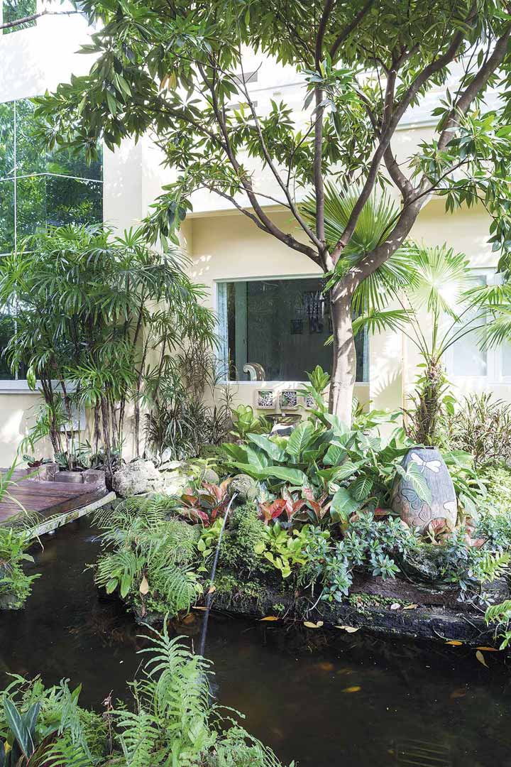 นั่นคือความในใจที่เจ้าของบ้านหลังนี้บอกกับเรา สวนเมืองร้อน บนเนื้อที่ประมาณ 225 ตารางวา แบ่งเป็นที่พักอาศัย 100 ตารางวาที่เหลือใช้เป็นพื้นที่จัดสวน แม้เทรนด์การจัดสวนจะมีให้เลือกหลากหลาย ทว่า “สวนเมืองร้อน” ยังคงได้รับความนิยมอยู่เสมอบรรยากาศรอบตัวที่โอบล้อมด้วยธรรมชาติของต้นไม้และสายน้ำ มีลมพัดโชยมาตลอดเวลา ชวนให้รู้สึกน่าพักผ่อน จึงเป็นความต้องการหลักของเจ้าของบ้าน