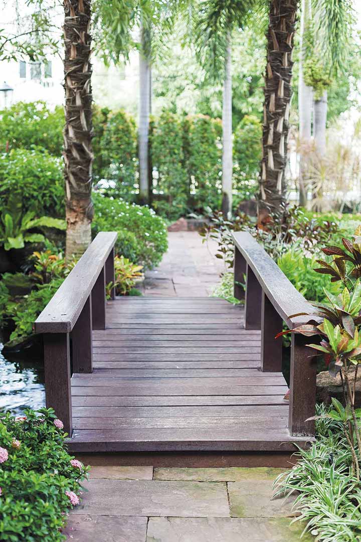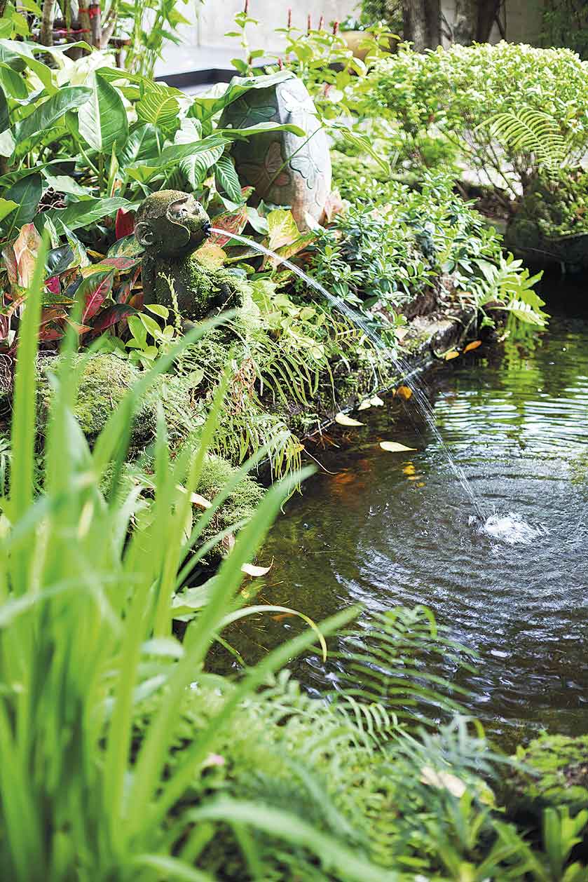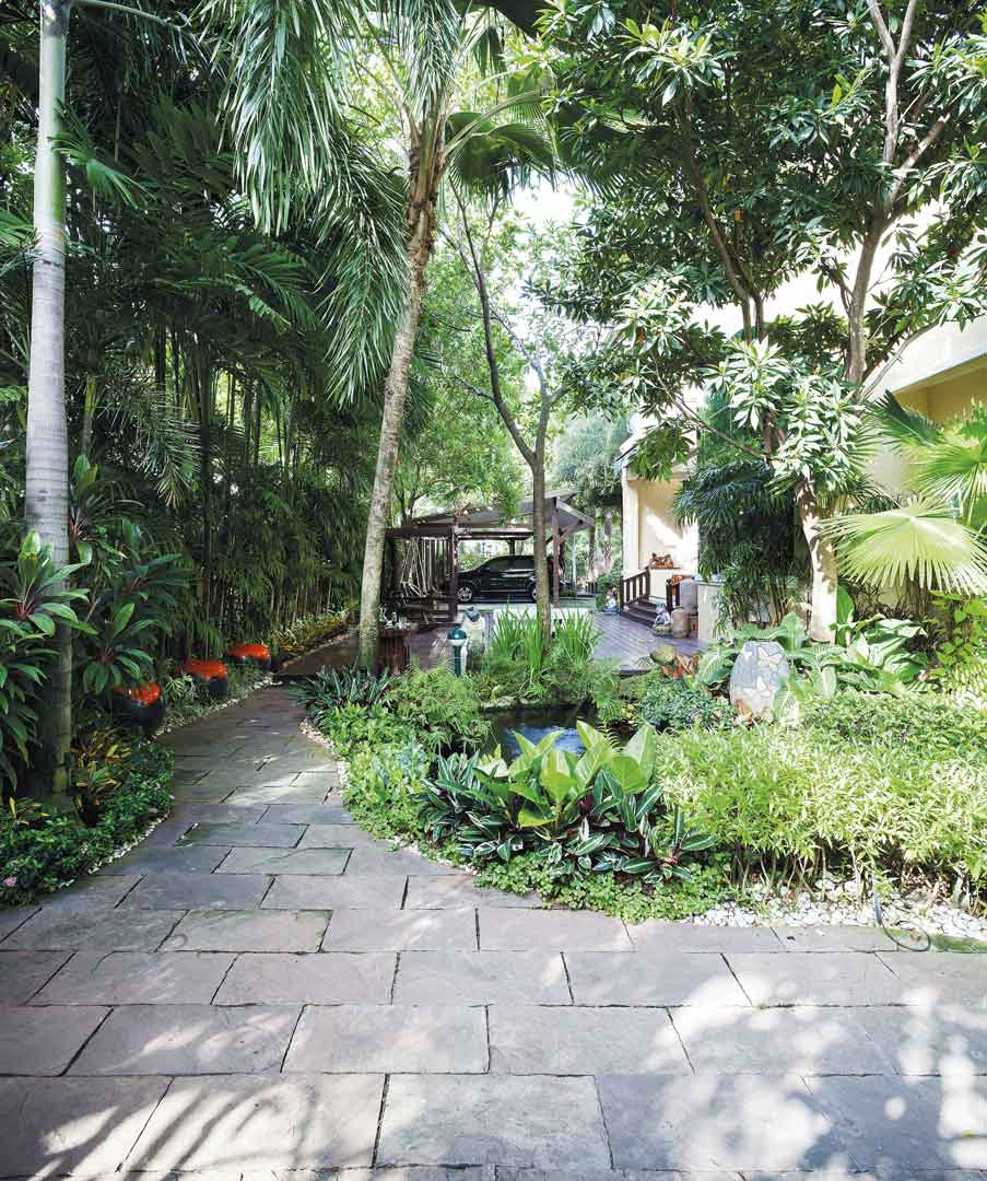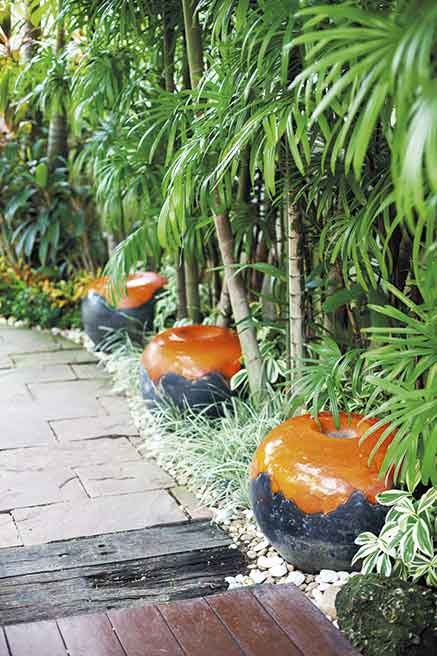 นั่นคือความในใจที่เจ้าของบ้านหลังนี้บอกกับเรา สวนเมืองร้อน บนเนื้อที่ประมาณ 225 ตารางวา แบ่งเป็นที่พักอาศัย 100 ตารางวาที่เหลือใช้เป็นพื้นที่จัดสวน แม้เทรนด์การจัดสวนจะมีให้เลือกหลากหลาย ทว่า “สวนเมืองร้อน” ยังคงได้รับความนิยมอยู่เสมอบรรยากาศรอบตัวที่โอบล้อมด้วยธรรมชาติของต้นไม้และสายน้ำ มีลมพัดโชยมาตลอดเวลา ชวนให้รู้สึกน่าพักผ่อน จึงเป็นความต้องการหลักของเจ้าของบ้าน