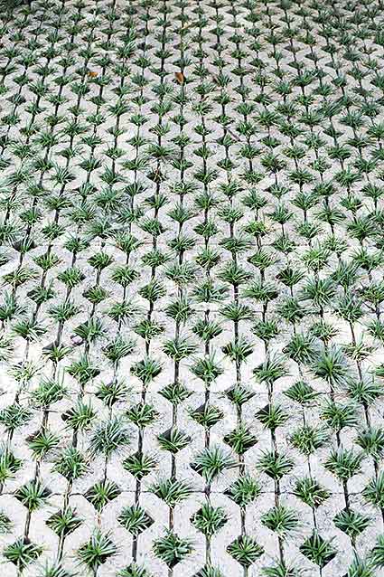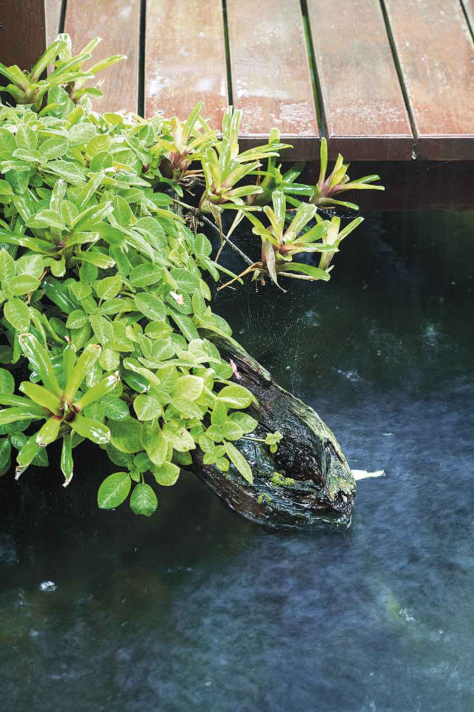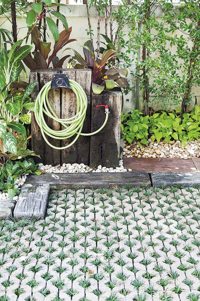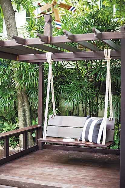 ถัดจากศาลามีโรงจอดรถคั่นระหว่างกลางพื้นที่สวน จากเดิมที่เป็นพื้นสนามหญ้าก็เปลี่ยนเป็นพื้นบล็อกปูหญ้า แต่เลือกปลูกหนวดปลาดุกแคระแทนการใช้หญ้า แล้วปลูกปาล์มยะวากับอินทผลัมเป็นหลังคาธรรมชาติ ช่วยบังแดดให้บริเวณนี้รวมถึงทางเข้าประตูหน้าบ้านด้วย เมื่อเดินไปยังอีกฟากหนึ่งเราจะเห็นชานไม้กว้าง เป็นพื้นที่เปิดโล่งรับลมทุกช่วงเวลา มีชิงช้าทำจากไม้เนื้อแข็งเอาไว้ให้ไกวเล่นตากลมเพลินๆ รวมถึงบ่อน้ำเล็กๆ ของเดิมแต่คุณไหจัดสรรให้ดูเป็นสัดส่วนมากขึ้น ตกแต่งด้วยโอ่งเซรามิกสีส้มให้สีสันตัดกับสีเขียวของหมากเขียว เศรษฐีไซ่ง่อน และเอื้องหมายนาด่างได้อย่างลงตัว