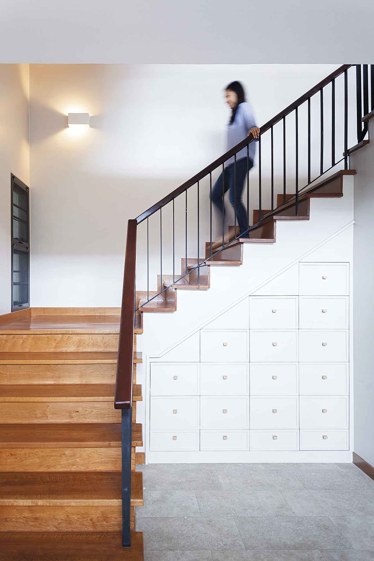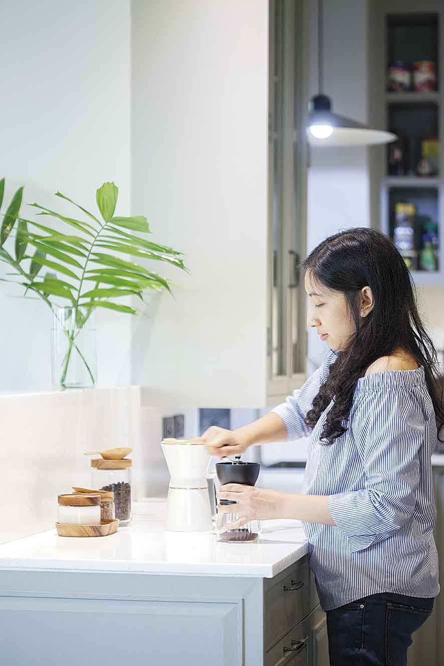 การออกแบบพื้นที่ที่เตรียมไว้ตั้งแต่เริ่มต้นทำให้การใช้งานสะดวกและเป็นสัดส่วน โดยชั้นล่างจัดเป็นพื้นที่อเนกประสงค์ แบ่งเป็นส่วนนั่งเล่น – รับแขก รับแขก มุมรับประทานอาหาร แพนทรี่และครัวไทยที่ซ่อนอยู่ด้านหลัง รวมถึงห้องเด็กซึ่งสองหนุ่มน้อยมักใช้ทำกิจกรรมต่างๆ ในตอนกลางวัน ทั้งทำการบ้าน เล่นของเล่น และเป็นมุมนอนเล่น โดยไม่ลืมออกแบบให้มีมุมจัดเก็บของเล่นเพื่อความเป็นระเบียบเรียบร้อย ชั้นสองเป็นห้องนอนของคุณแม่และน้องสาว ส่วนชั้นสามเป็นห้องนอนใหญ่ของครอบครัวคุณก้อย ห้องทำงาน ห้องของเด็กๆ และห้องสมุด