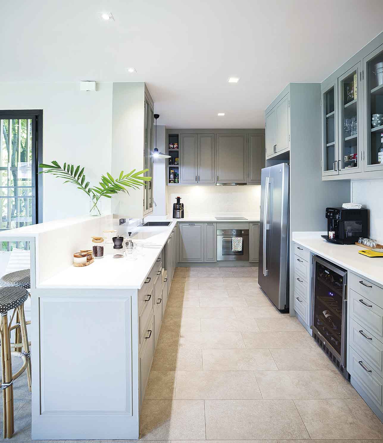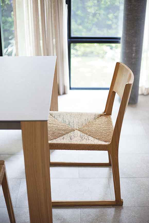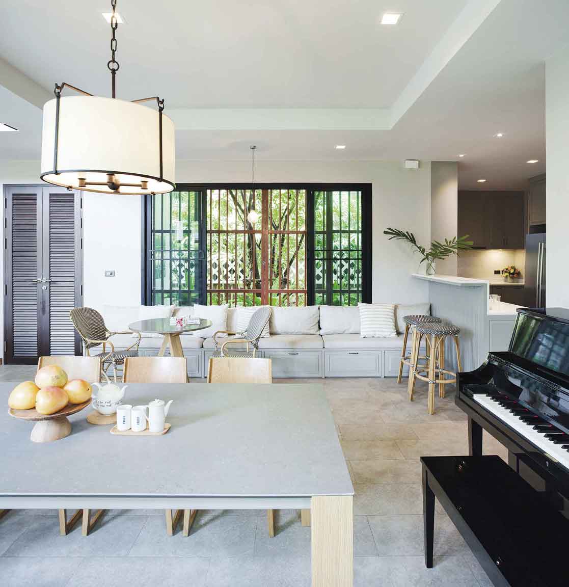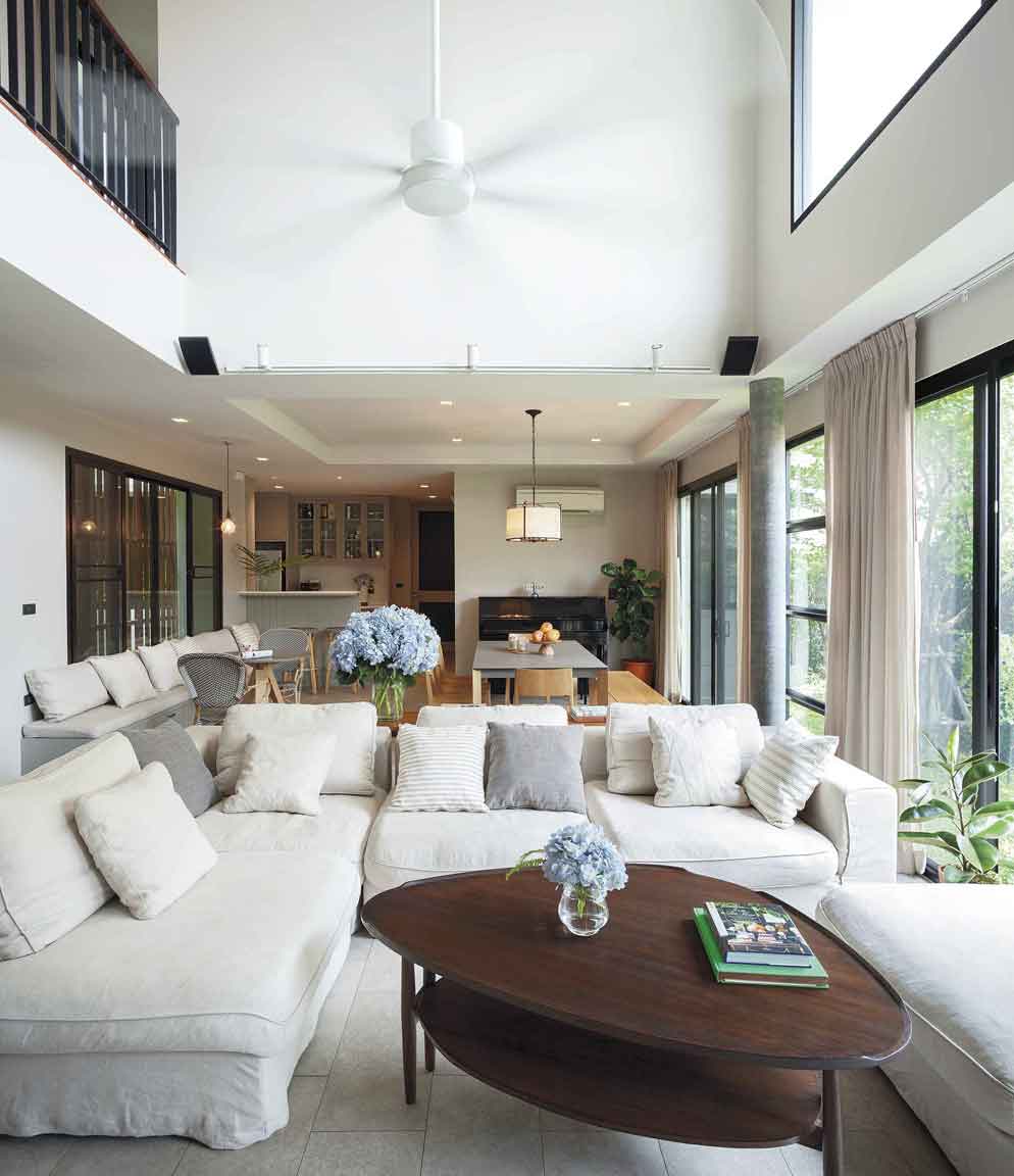 ไม่ใช่แค่การใช้งานเท่านั้นที่ตอบโจทย์ แต่ความอบอุ่นเมื่ออยู่ในบ้านก็เป็นสิ่งสำคัญ บ้านนี้มีองค์ประกอบของงานตกแต่งที่ทำให้บ้านดูอุ่นตาอุ่นใจ โดยเฉพาะการเลือกใช้เฟอร์นิเจอร์โทนสีนิวทรัล(Neutral) หรือโทนสีธรรมชาติอย่างสีครีม ขาว และเทาอ่อน และเฟอร์นิเจอร์ดังกล่าวต้องตอบโจทย์การใช้งานได้ทั้งครอบครัว เช่น โต๊ะรับประทานอาหารแบบ 8 ที่นั่ง โซฟารูปตัวแอล (L) ขนาดใหญ่