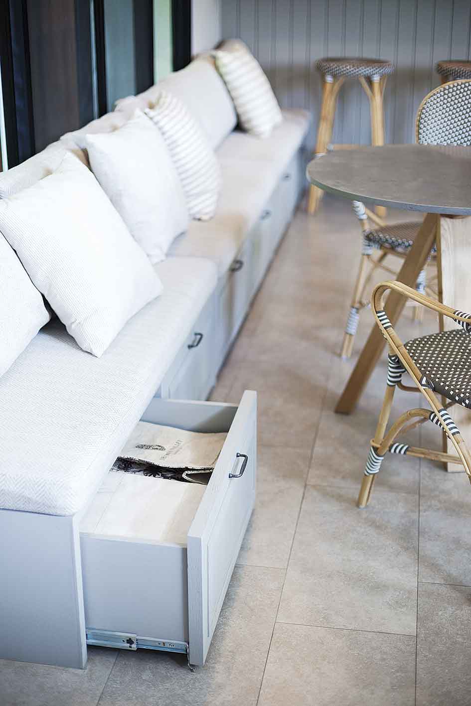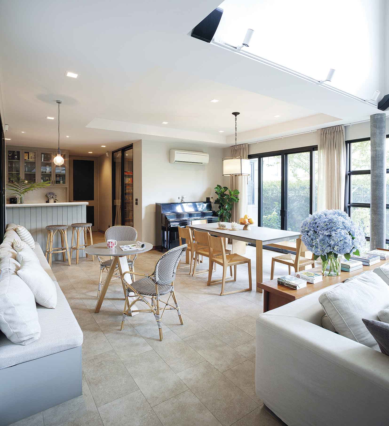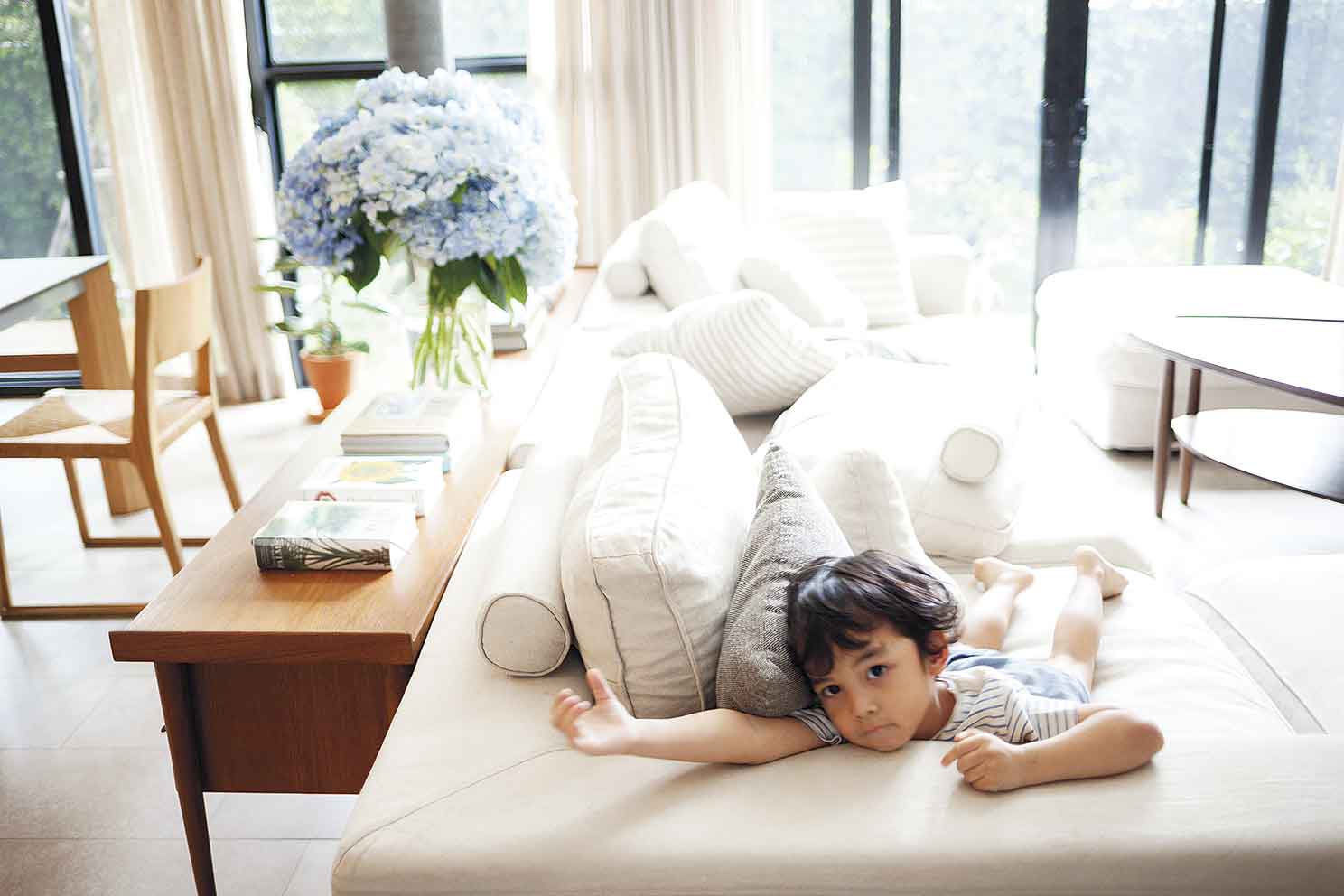 ไม่ใช่แค่การใช้งานเท่านั้นที่ตอบโจทย์ แต่ความอบอุ่นเมื่ออยู่ในบ้านก็เป็นสิ่งสำคัญ บ้านนี้มีองค์ประกอบของงานตกแต่งที่ทำให้บ้านดูอุ่นตาอุ่นใจ โดยเฉพาะการเลือกใช้เฟอร์นิเจอร์โทนสีนิวทรัล(Neutral) หรือโทนสีธรรมชาติอย่างสีครีม ขาว และเทาอ่อน และเฟอร์นิเจอร์ดังกล่าวต้องตอบโจทย์การใช้งานได้ทั้งครอบครัว เช่น โต๊ะรับประทานอาหารแบบ 8 ที่นั่ง โซฟารูปตัวแอล (L) ขนาดใหญ่