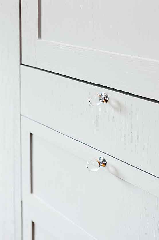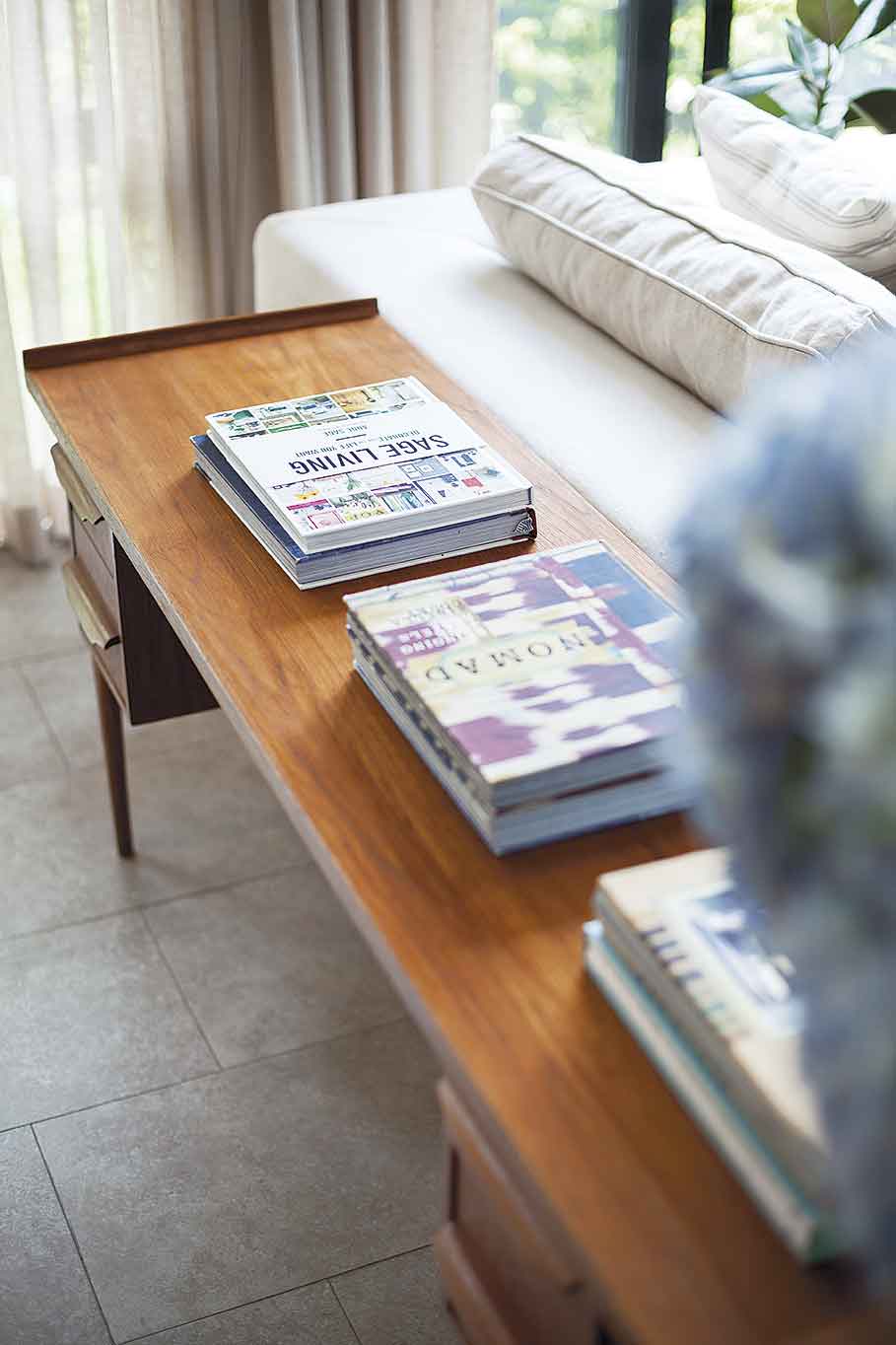 คุณเล็ก – นภาภรณ์ โพธิ์รัชต์ มัณฑนากร เล่าถึงที่มาที่ไปของงานตกแต่งภายในให้เราฟังว่า “เดิมทีบ้านนี้มีสถาปนิกออกแบบตัวบ้านไว้อยู่แล้วตอนเราเข้ามาออกแบบก็อยู่ในช่วงที่งานโครงสร้างยังสามารถปรับเปลี่ยนได้ จึงปรับเปลี่ยนบางอย่างให้มีการใช้งานสะดวกและทำให้บ้านดูอบอุ่นขึ้น เช่น ขยับระยะของบานหน้าต่างให้เปิดรับแสงได้ดีขึ้น สามารถมองเห็นต้นไม้ใหญ่ได้ด้วย ส่วนห้องเด็กเป็นสิ่งที่เราเพิ่มขึ้นมาจากของเดิม เพราะตอนที่เข้ามาออกแบบเด็กๆ ยังเล็กอยู่ก็คิดว่าน่าจะดีกว่าถ้ามีพื้นที่ที่คุณก้อยและคนในครอบครัวได้อยู่ใกล้กัน และเด็กๆ ก็มีพื้นที่เล่นได้อย่างเต็มที่”