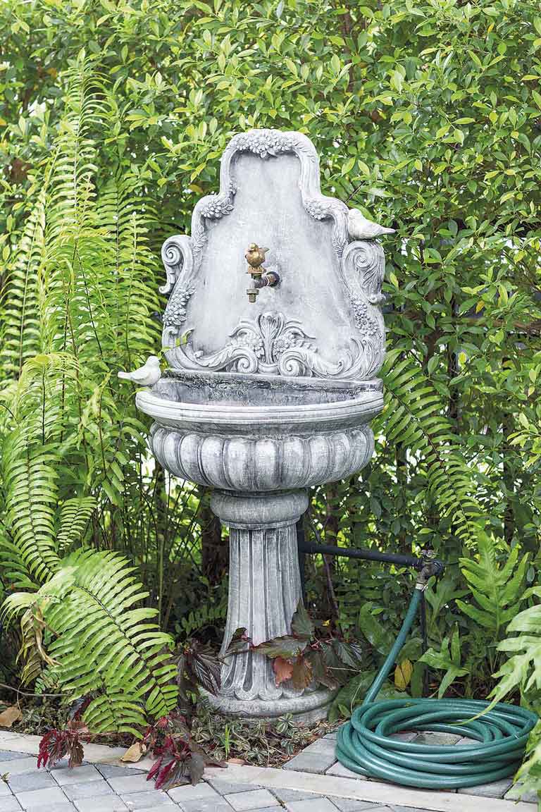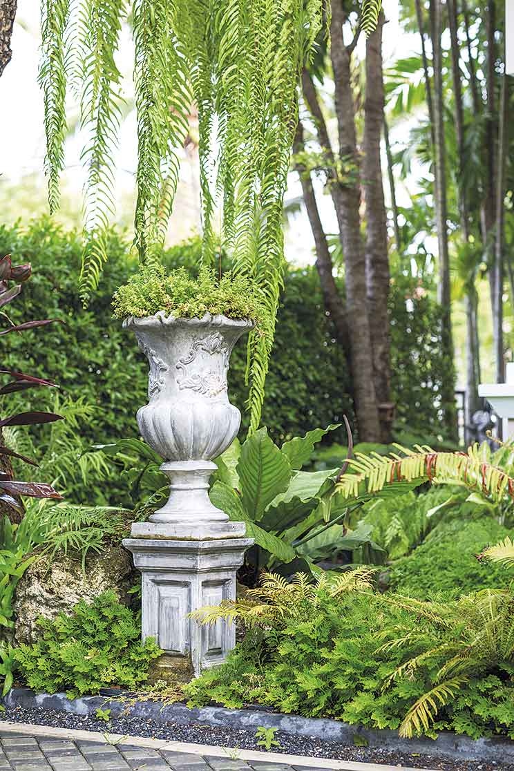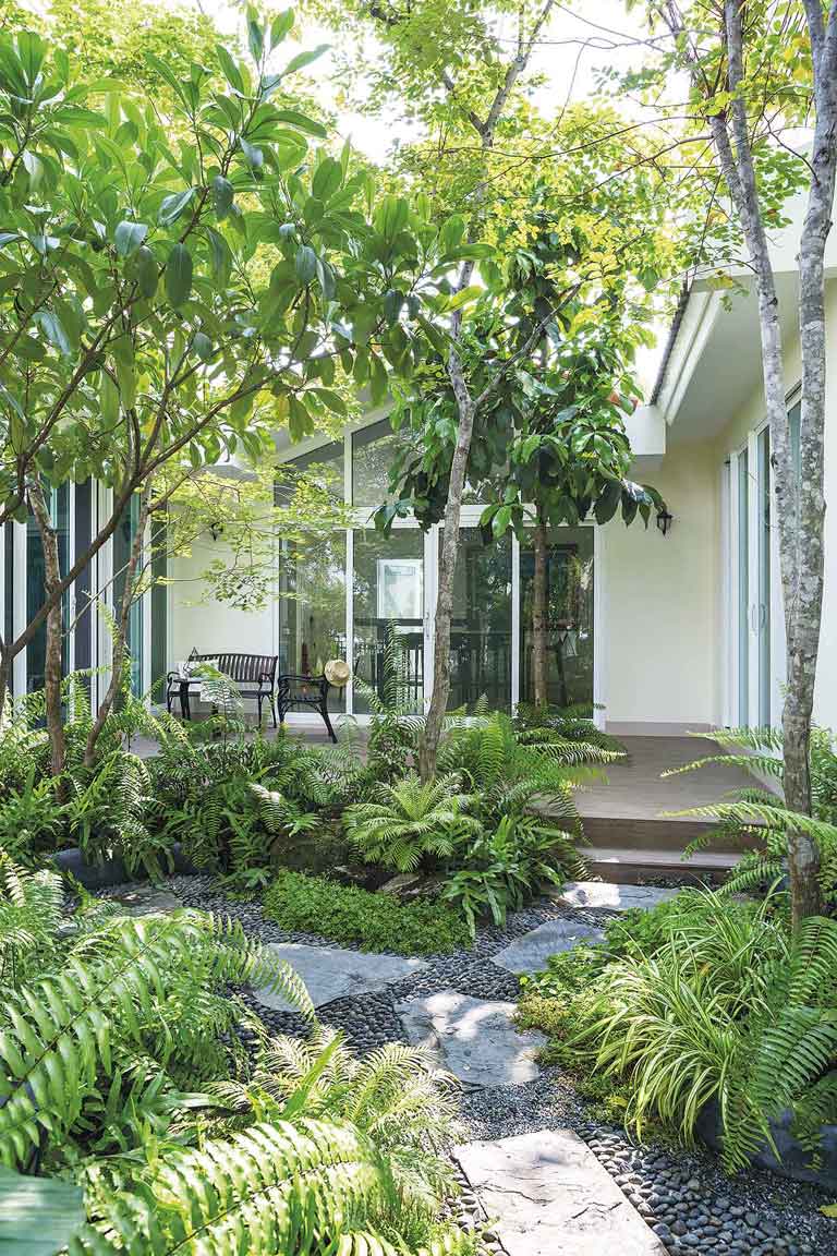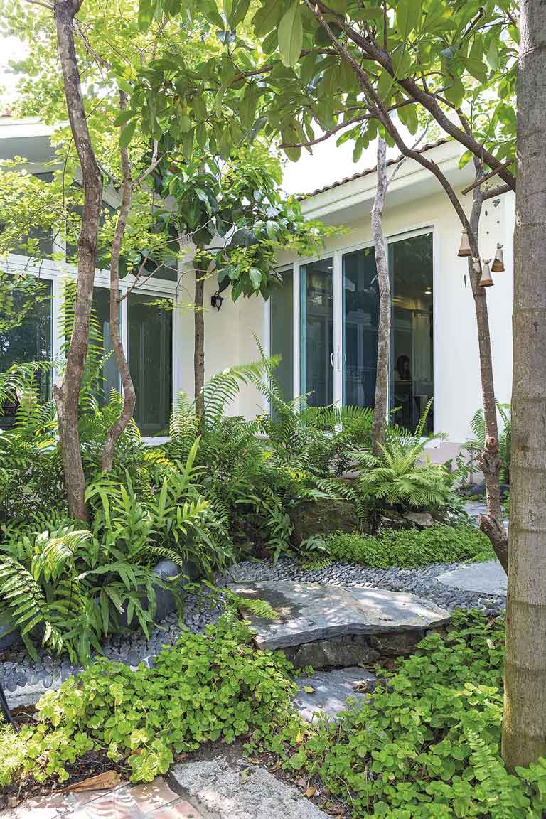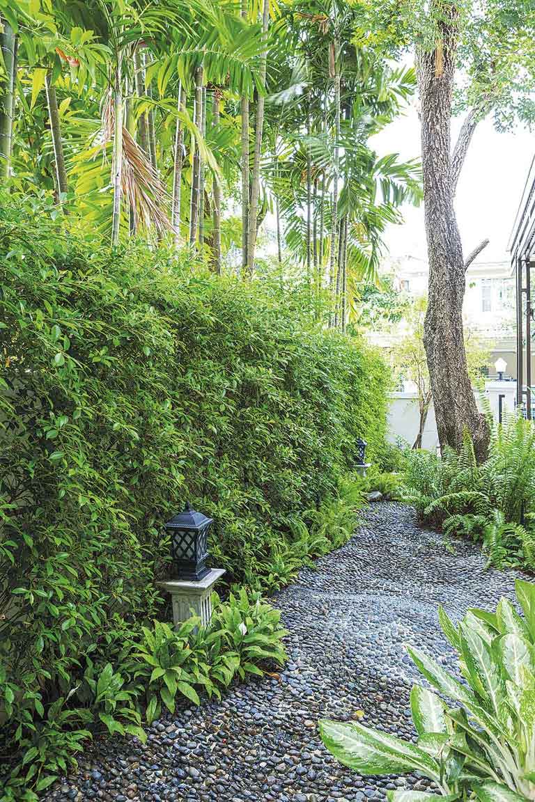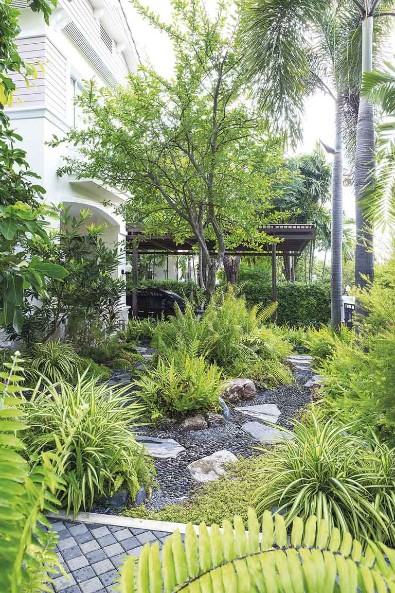 สวนนี้มีการวางผังบริเวณแบบง่าย ๆ หน้าบ้านทำเป็นมุมนั่งเล่นพักผ่อน โอบล้อมด้วยกำแพงต้นไทรเกาหลีตัดแต่งจนเป็นพุ่มแน่นสวยงาม มีทางเดินหินกาบผสมกับกรวดแสตมป์เรียงตัวกันทั้งผืนทอดยาวอ้อมไปยังระเบียงนั่งเล่นอีกฝั่งของตัวบ้าน และมีกลุ่มไม้พุ่มขนาบข้างซ้าย – ขวาตลอดทั้งเส้นทางเดิน กรวดแต่ละก้อนบนพื้นที่วางเรียงต่อกันไปเรื่อย ๆ อย่างตั้งใจ กลุ่มพรรณไม้ผิวสัมผัสใบละเอียด รวมไปถึงหินคอบเบิลก้อนเล็ก ๆ ที่วางรวมกันจนกลายเป็นลานขนาดใหญ่รายละเอียดเล็ก ๆ น้อย ๆ เหล่านี้เองที่มีส่วนทำให้สวนสวยแห่งนี้เต็มไปด้วยความละมุนละไมและรื่นรมย์อย่างที่เจ้าของบ้านปรารถนา
