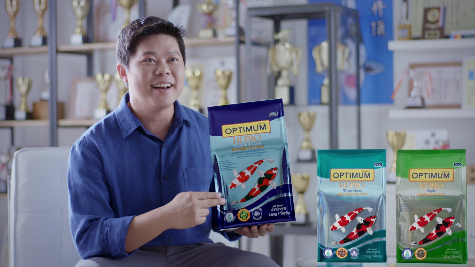 “มีคนถามผมมาเยอะมากว่าเลี้ยงปลาคาร์ฟยังไงให้สวยงาม สีสวยและคมขาวเป็นขาว แดงเป็นแดง ซึ่งจริงๆ แล้วการเลี้ยงก็ไม่ยากเลยครับถ้าเรารู้จักวิธีการที่ถูกต้อง โดยเฉพาะเรื่องการให้อาการนี่สำคัญมาก ผมแนะนำให้ใช้ตัวนี้เลยครับ ออพติมั่มไฮโปร ที่มีส่วนผสมทั้งสาหร่ายสไปรูลิน่าและแอสตาแซนธิน สองตัวนี้จะเป็นตัวช่วยแร่งสี แถมมีแร่ธาตุ แคลเซียม และฟอสฟอรัส ทำให้ผิวของปลาสวยงาม มีโครงสร้างดี และน้ำไม่ขุ่นอีกด้วยครับ”