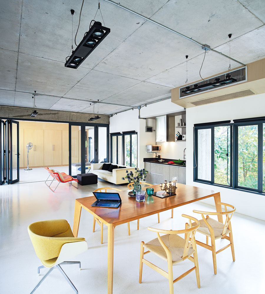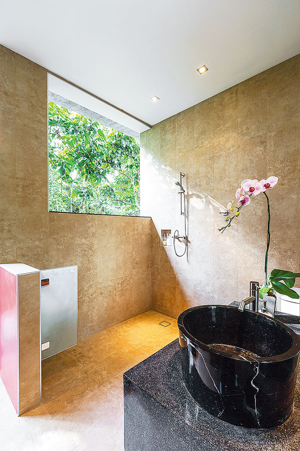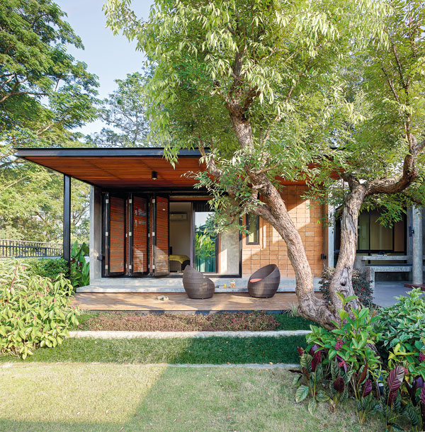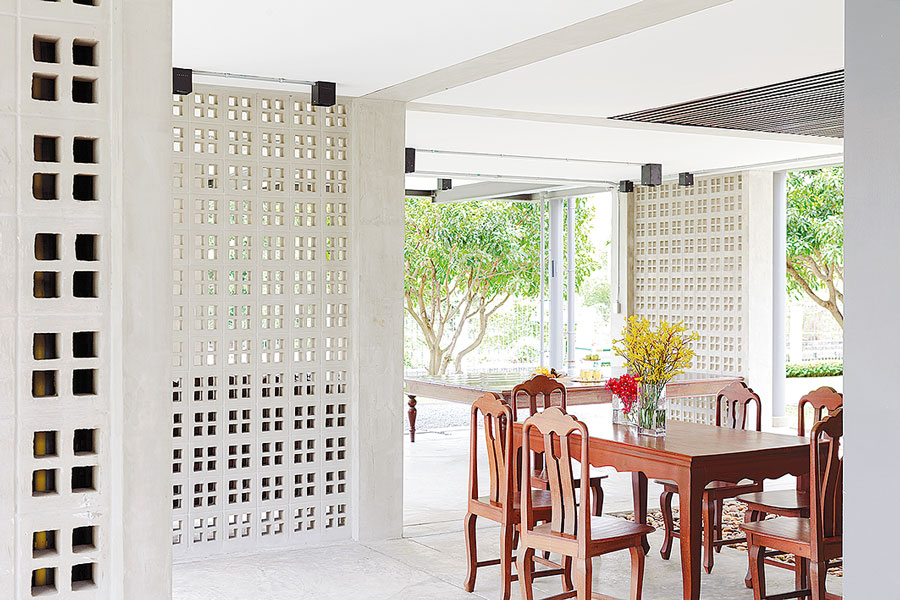 สร้างความเป็นส่วนตัวให้แต่ละพื้นที่ในบ้านด้วยกำแพง แต่ออกแบบให้มีความโปร่ง เพื่อไม่รบกวนการไหลเวียนของอากาศภายในบ้าน ลมธรรมชาติจะได้พัดเข้าสู่ตัวบ้านโดยตรง