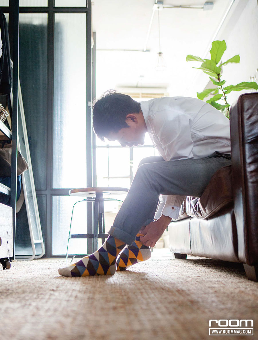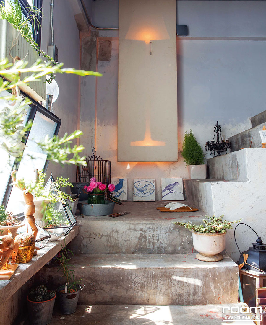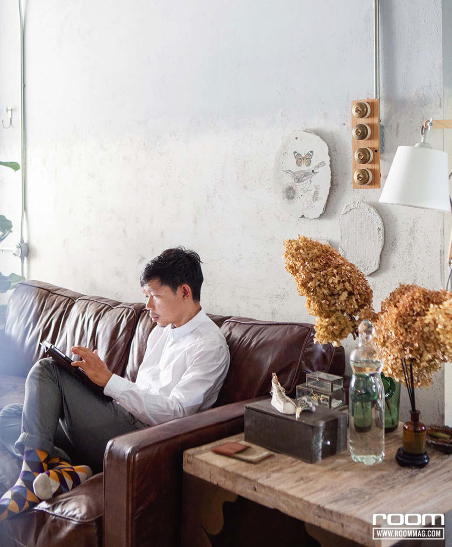 “เดิมทีย้ายไปทําโปรเจ็กต์รีสอร์ตที่เกาะสมุยอยู่นาน 3-4 ปี แล้วก็ทําบ้านที่โน่นเสียเลย หลังๆ เริ่มมีโปรเจ็กต์ที่กรุงเทพฯ เยอะขึ้น จึงอยากกลับมาทํางานที่นี่เสียเลย ตอนแรกก็อยู่คอนโดมิเนียม ถึงจะกว้าง แต่พื้นที่การใช้งานปรับอะไรไม่ได้ จึงใช้วิธีแต่งพร็อปส์ช่วยครับ ตอนหลังๆ ผมอยากหาที่อยู่ใหม่ พอดีตึกนี้เป็นของพาร์ตเนอร์ที่ร้านจึงย้ายมาอยู่เลย”