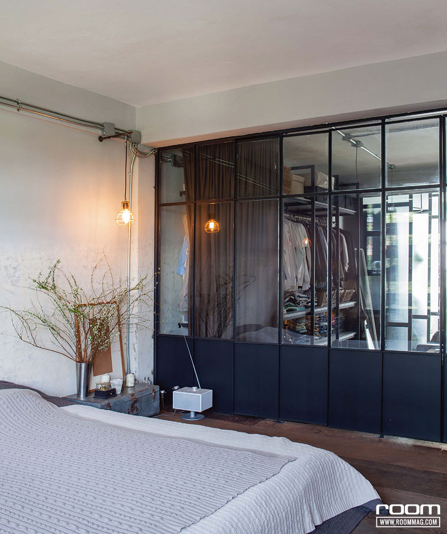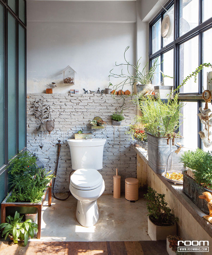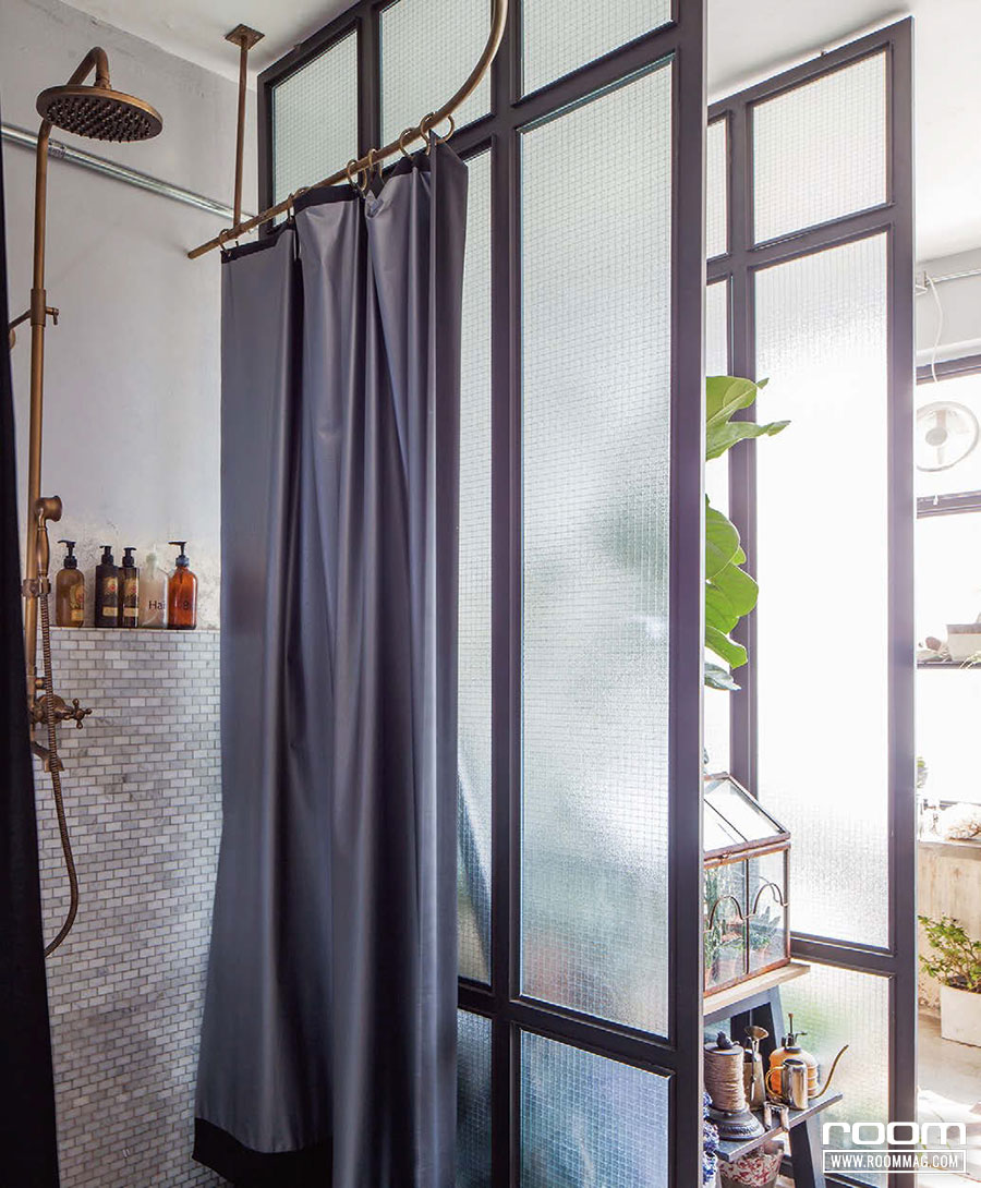 อีกหนึ่งความพิเศษของที่นี่คือ ทุกพื้นที่ใช้สอยเป็นแบบ เปิดโล่งหากันทั้งหมด ห้องแต่งตัว ห้องน้ำแบบแยกส่วนเปียก ส่วนแห้ง และห้องนอน “หลายคนมักกังวลว่าห้องน้ำเป็นมุมอับของบ้าน ทั้งเรื่อง ความชื้นที่ทําให้เกิดเชื้อราและกลิ่นไม่พึงประสงค์ เราก็ไม่ได้ อาบน้ำกันตลอดเวลาขนาดนั้น วันไหนอากาศดี ๆ หรือช่วงเช้า ผมจะเปิดประตูเหล็กดาดฟ้า แล้วก็ลงไปเปิดประตูหน้าต่าง ชั้นสองให้ลมพัดผ่านระบายอากาศ ช่วยให้ห้องน้ำปลอดโปร่ง ลดปัญหาเรื่องกลิ่นและความชื้น”